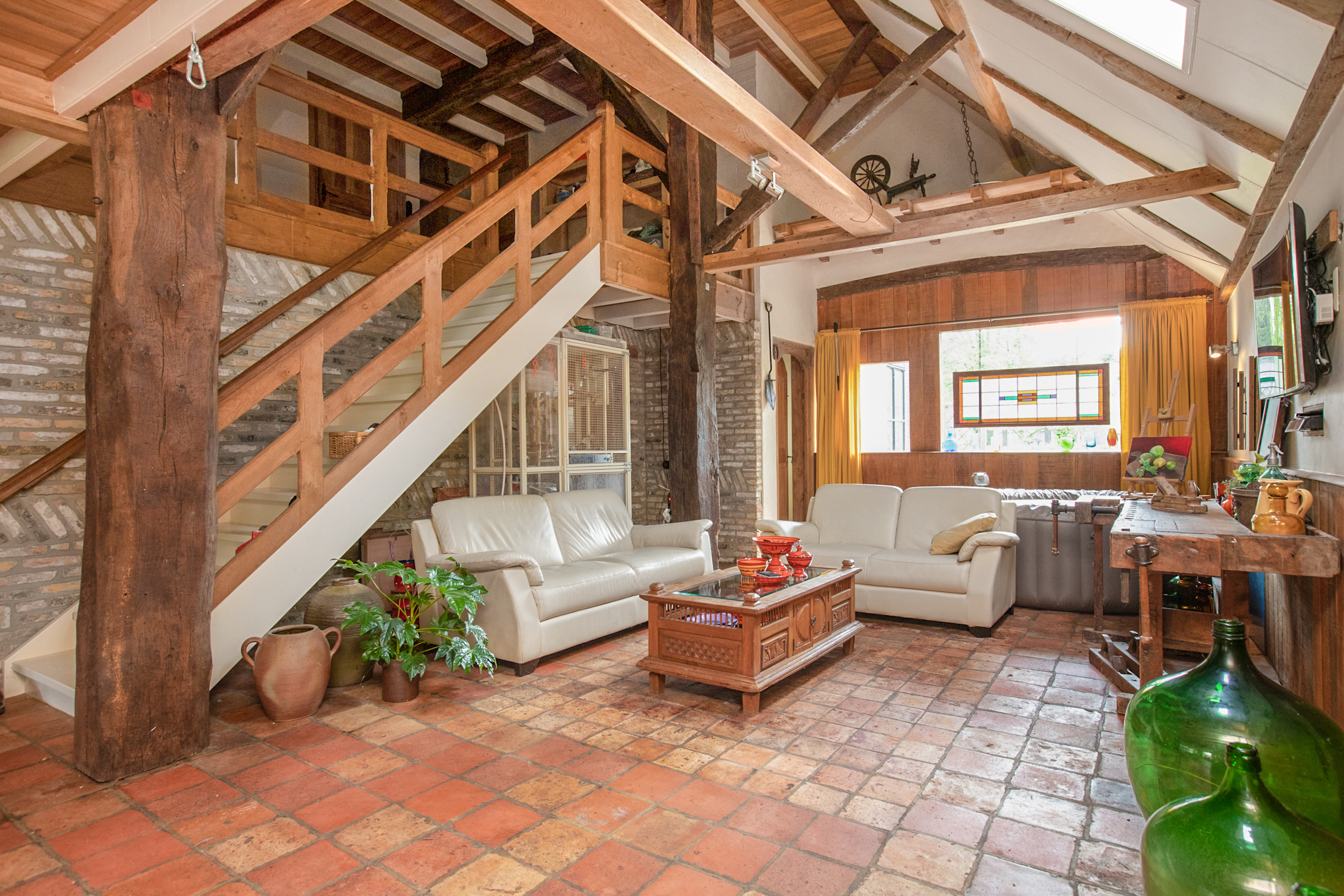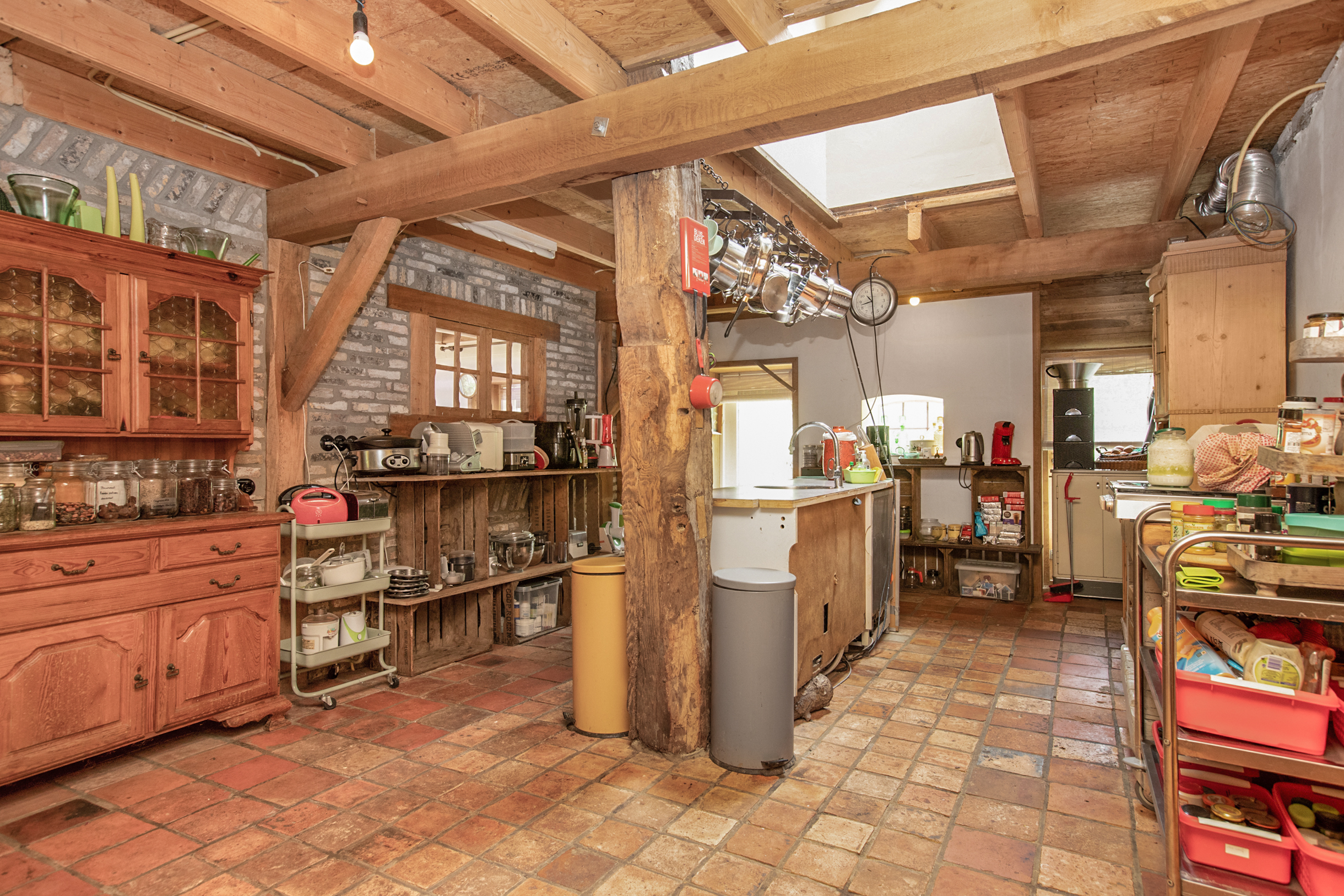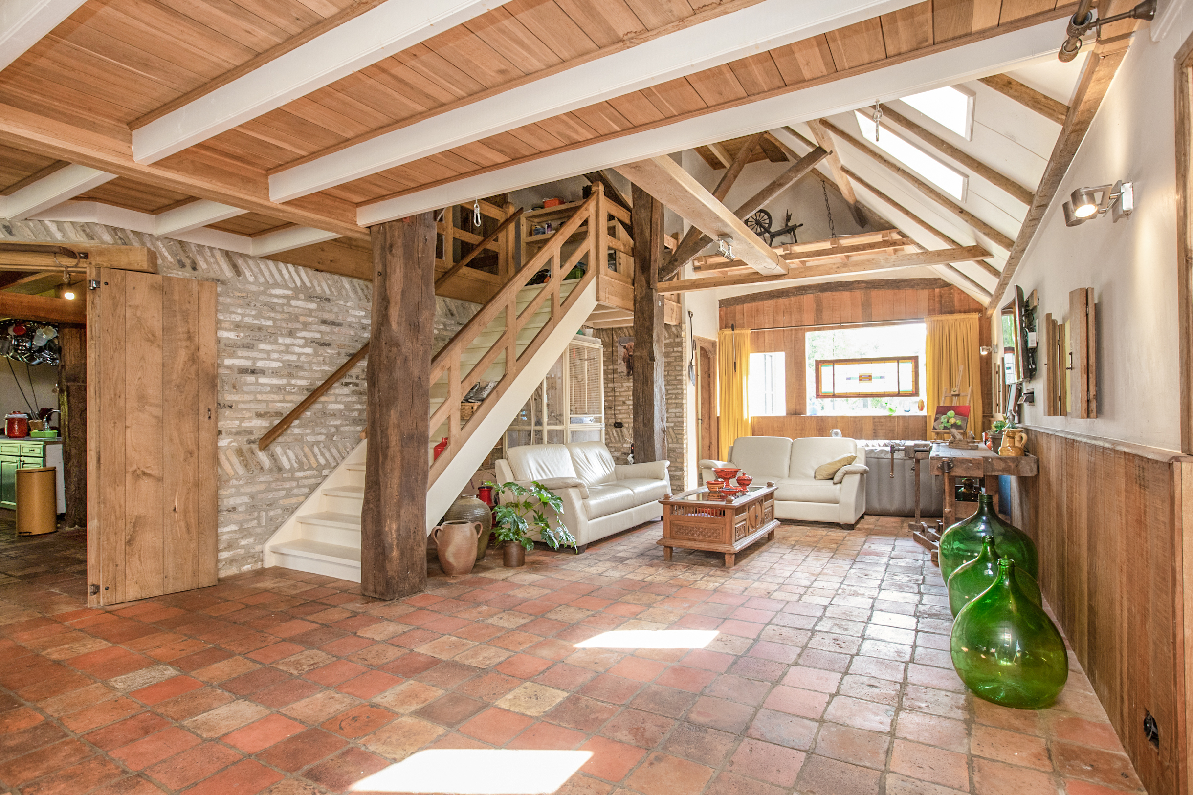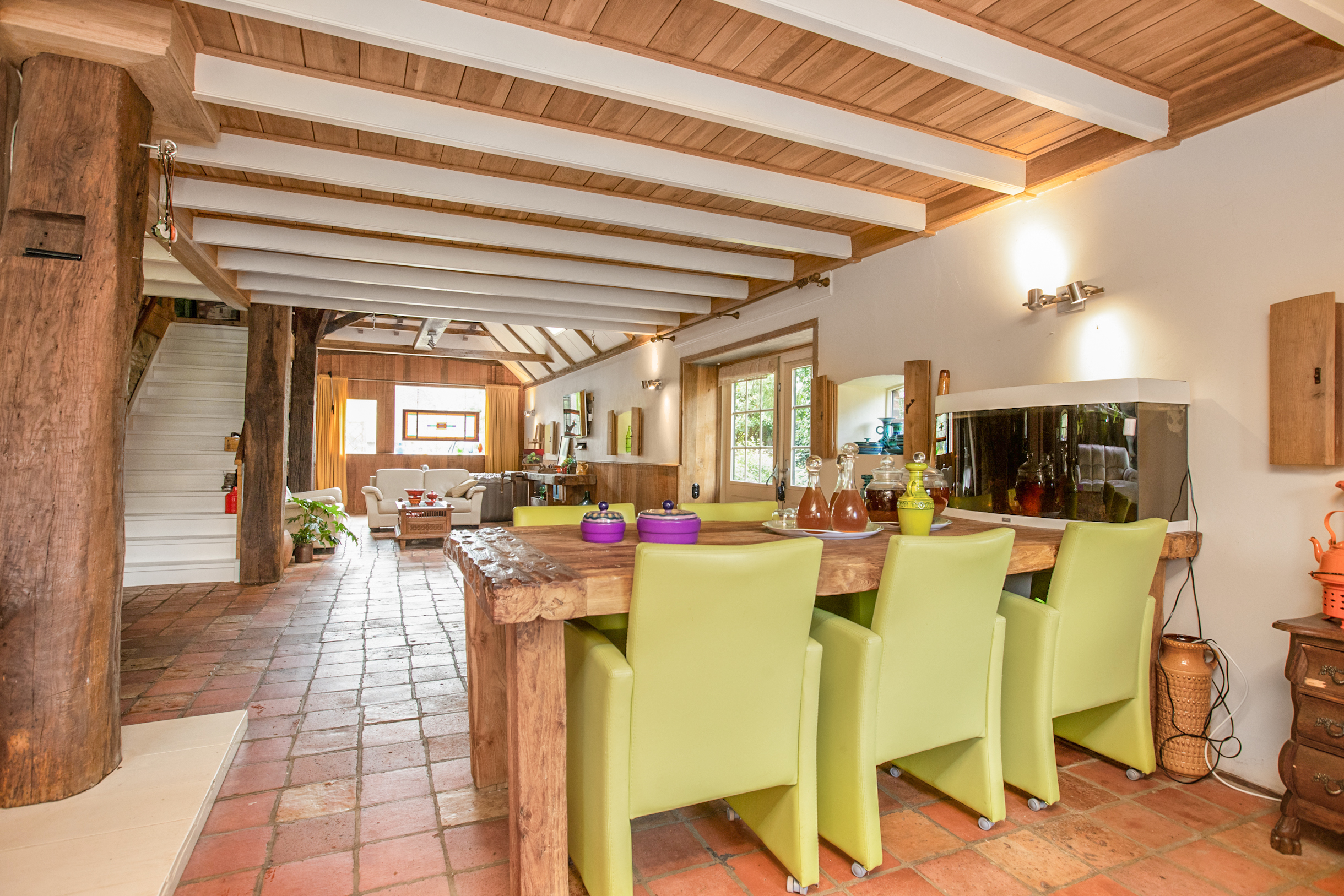 De woonkamer is zo riant dat er zelfs 2 verschillende zithoeken en een ruime eethoek van gemaakt kunnen worden. Werkelijk in elke hoek van de L-vormige woonkamer bevinden zich meerdere bakelietlook stopcontacten met verschillende mogelijkheden. Ook zijn hier de wanden voorzien van verschillende elektrapunten voor opbouwwandlampen of indien gewenst inbouwlampen, voor een mooie rustieke uitstraling. Tevens bevindt zich hier de trap naar de 1e verdieping. Alle ludieke koestal ramen in de woonkamer en keuken zijn voorzien van sfeervolle, robuuste eikenluikjes.