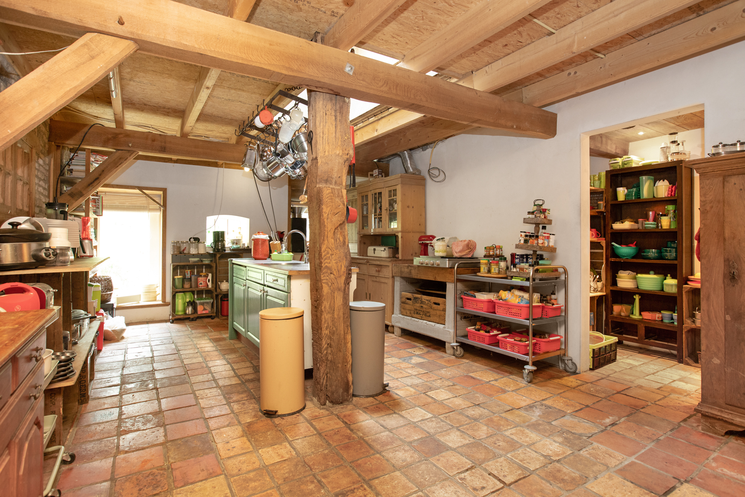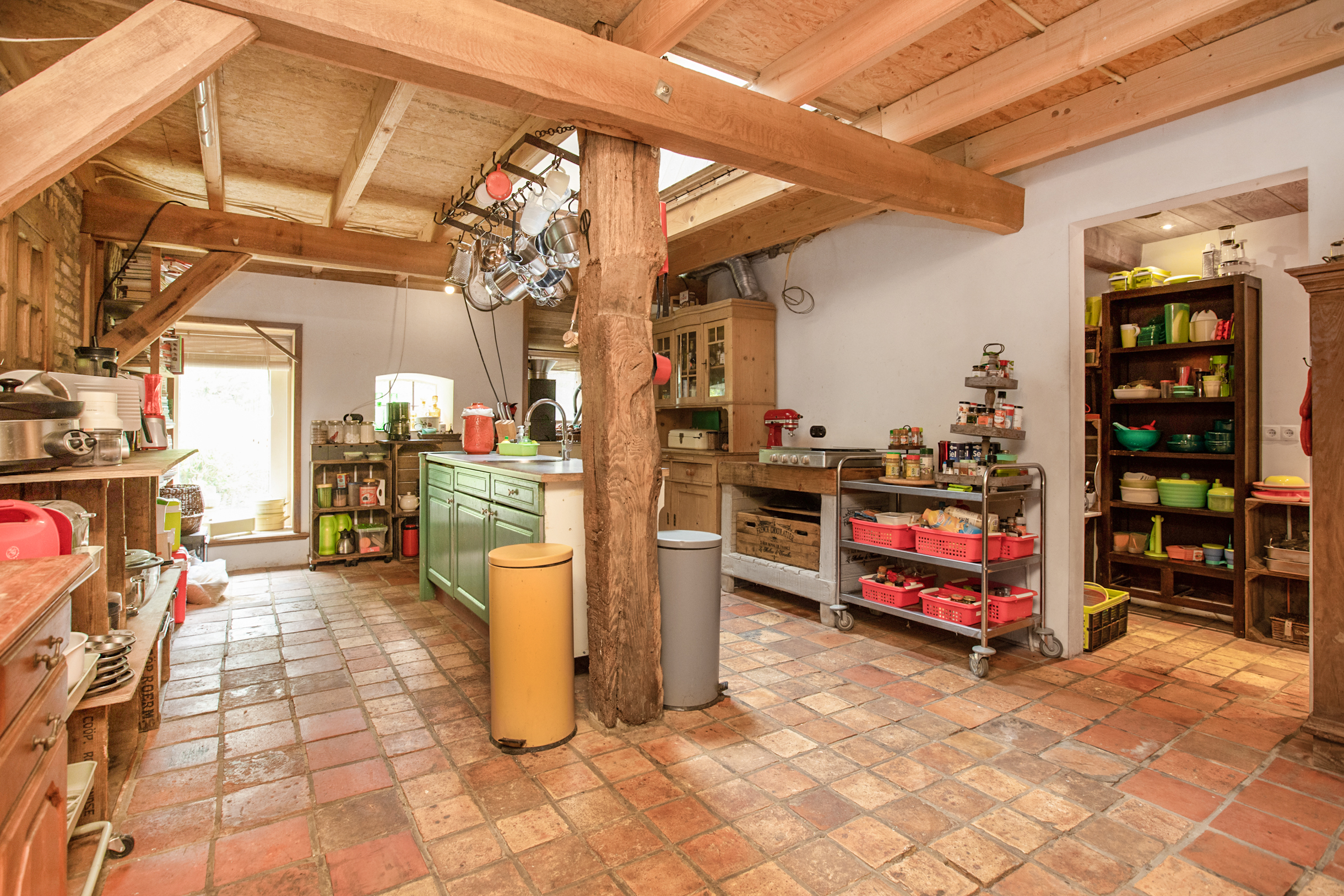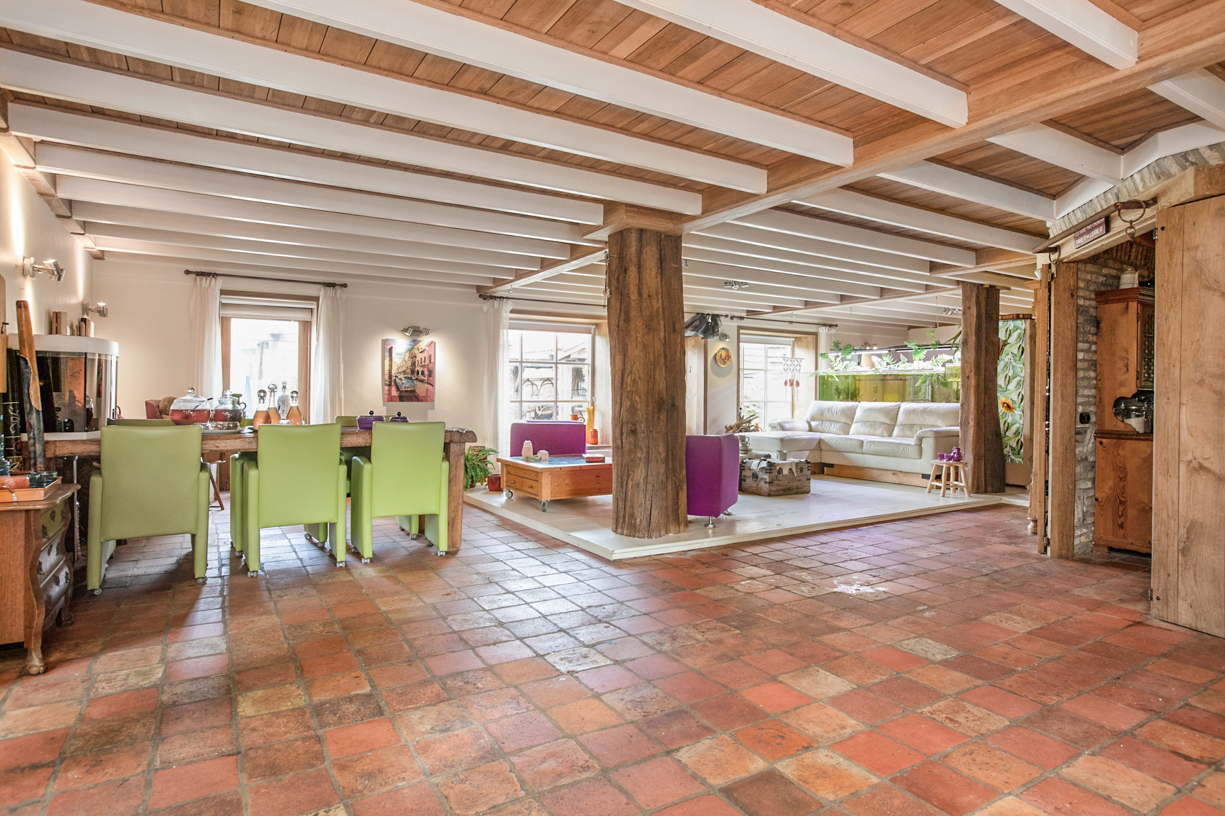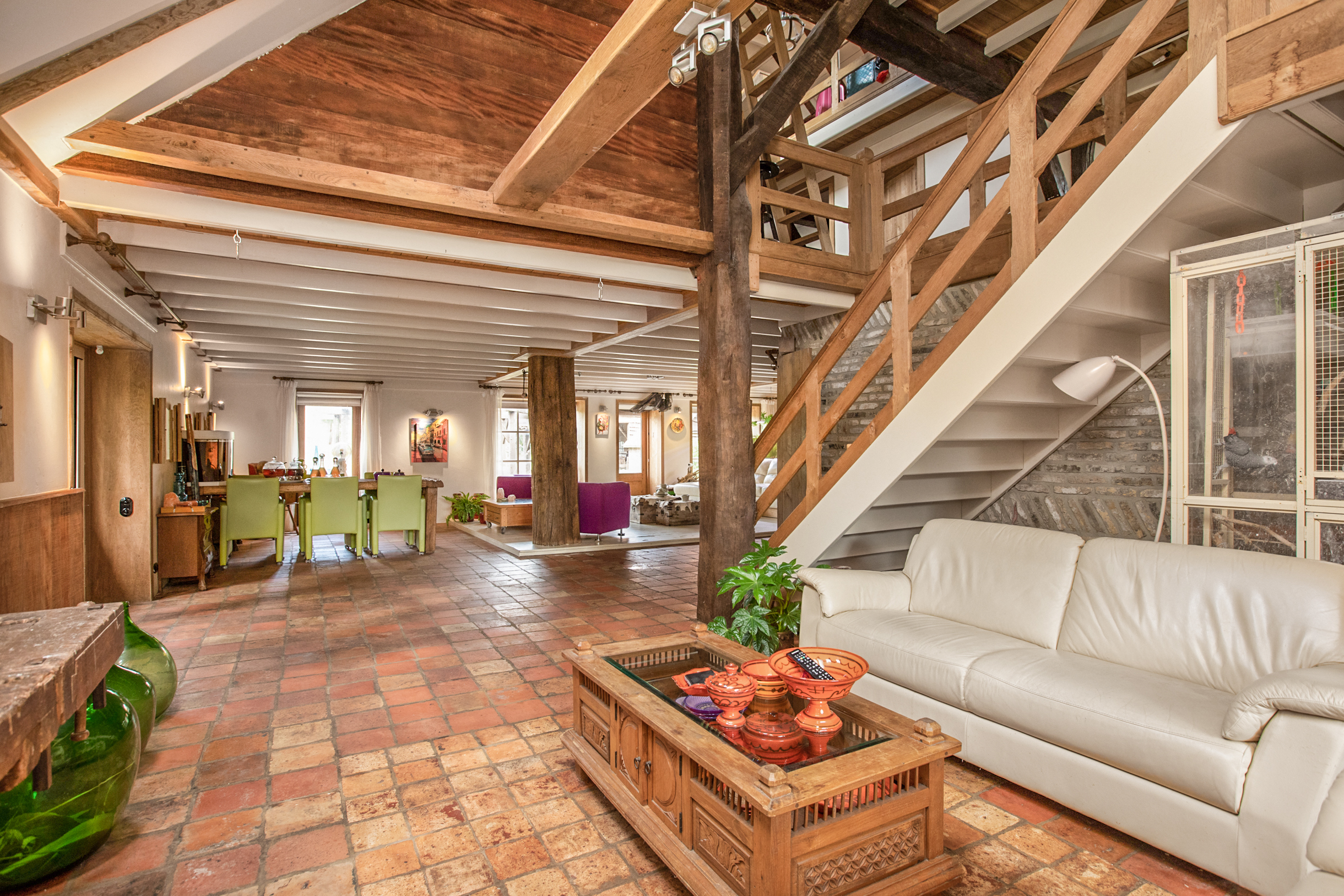De woonkamer is zo riant dat er zelfs 2 verschillende zithoeken en een ruime eethoek van gemaakt kunnen worden. Werkelijk in elke hoek van de L-vormige woonkamer bevinden zich meerdere bakelietlook stopcontacten met verschillende mogelijkheden. Ook zijn hier de wanden voorzien van verschillende elektrapunten voor opbouwwandlampen of indien gewenst inbouwlampen, voor een mooie rustieke uitstraling. Tevens bevindt zich hier de trap naar de 1e verdieping. Alle ludieke koestal ramen in de woonkamer en keuken zijn voorzien van sfeervolle, robuuste eikenluikjes.