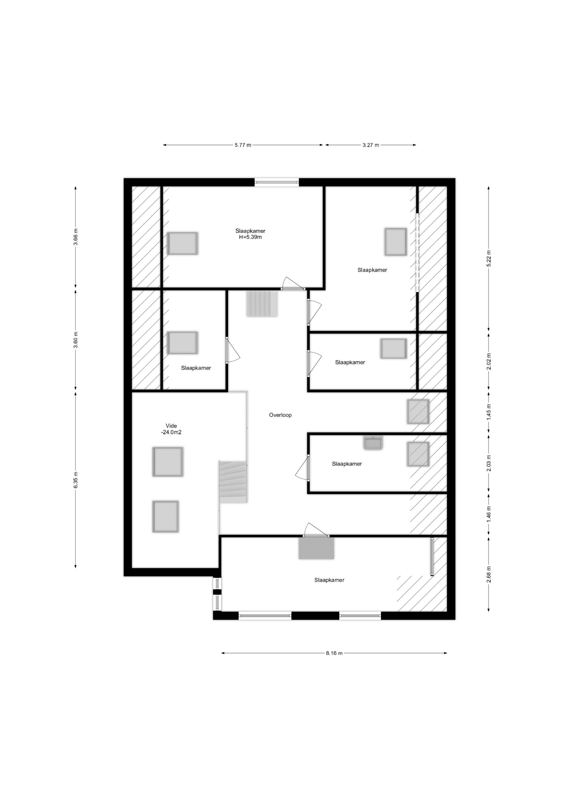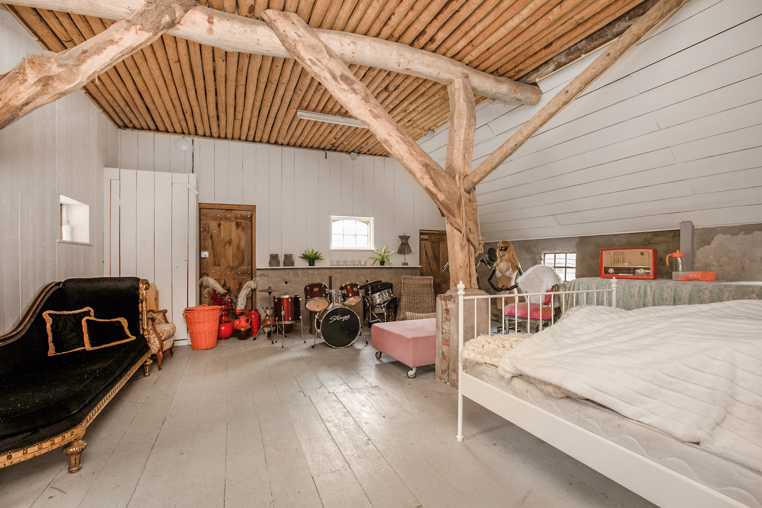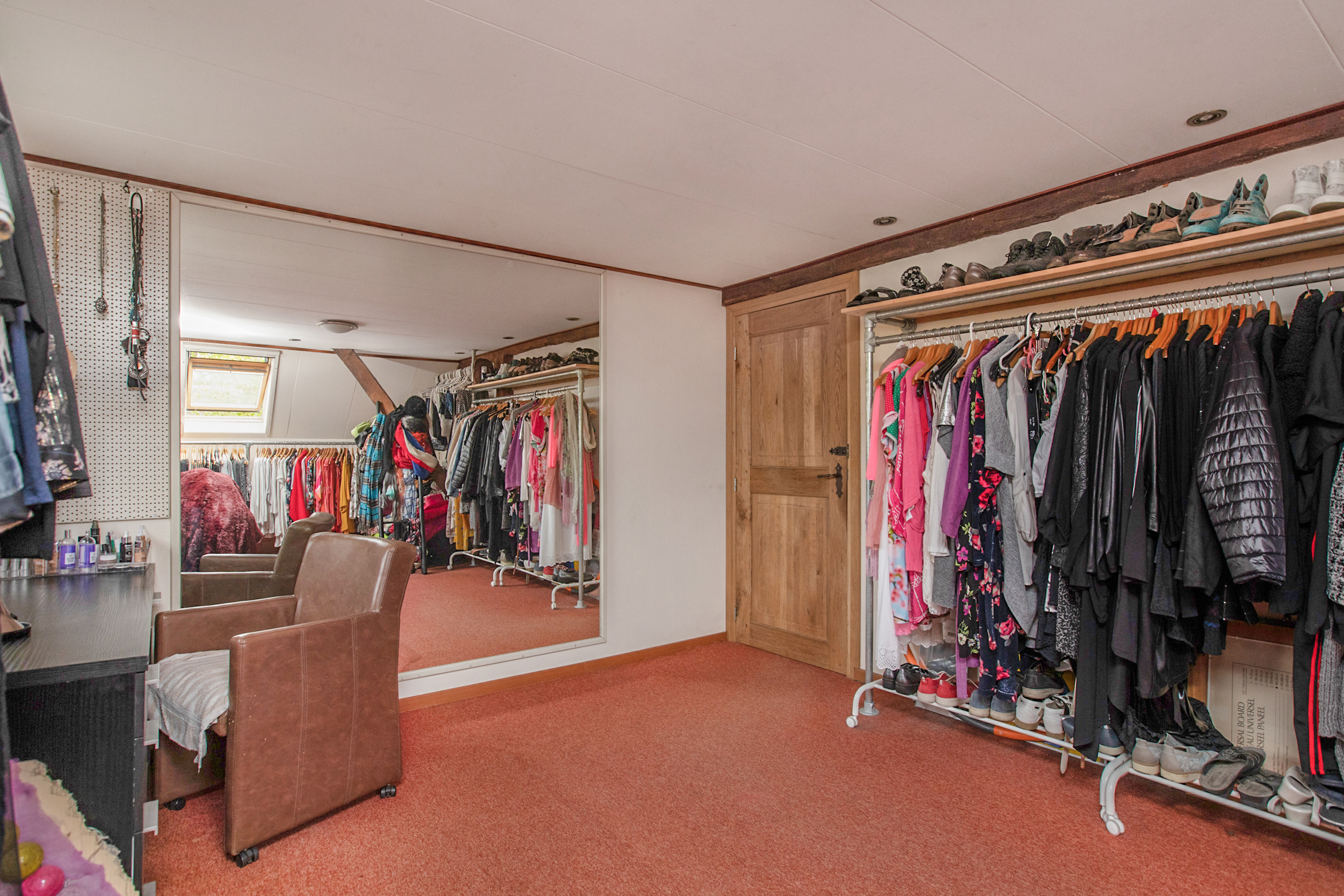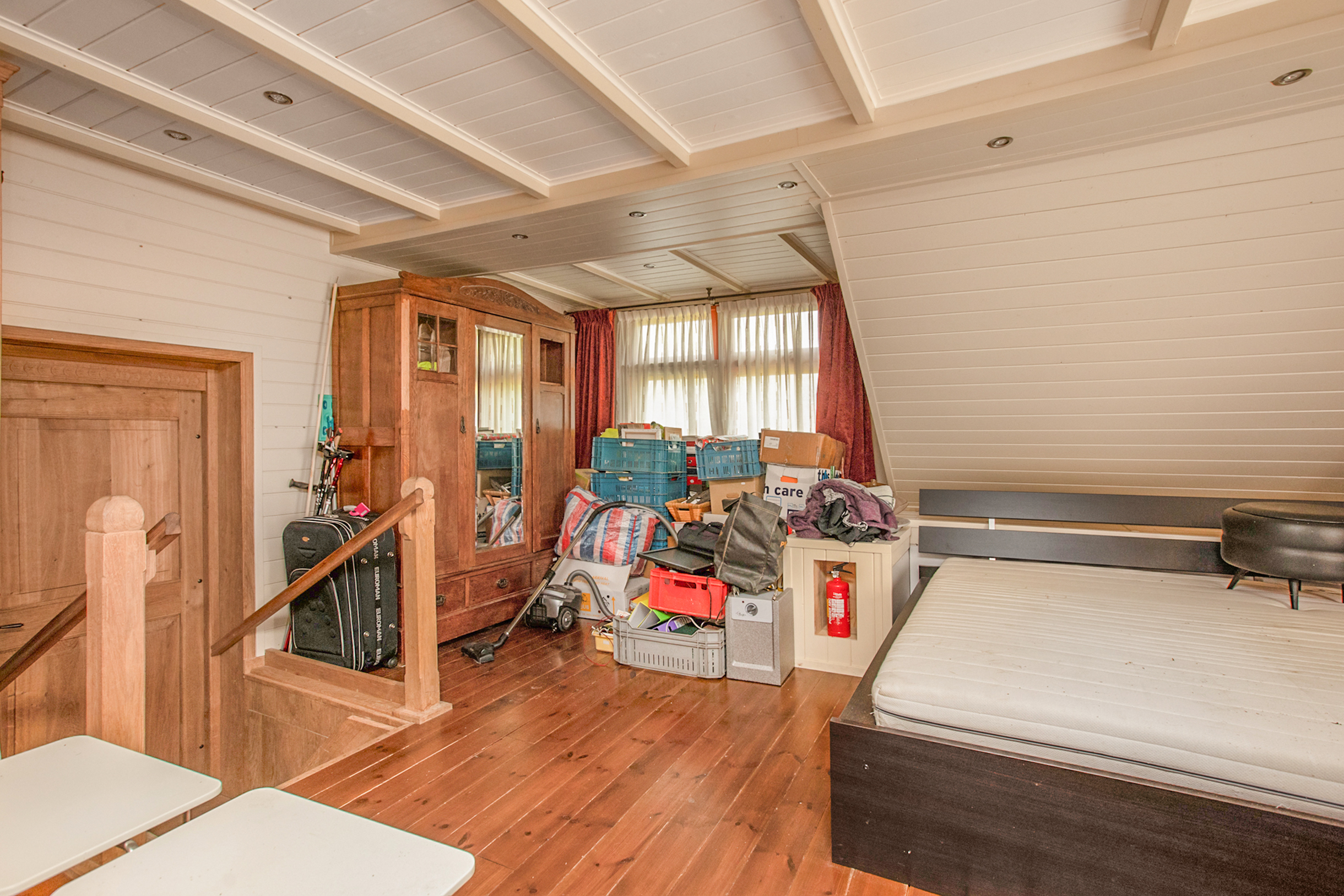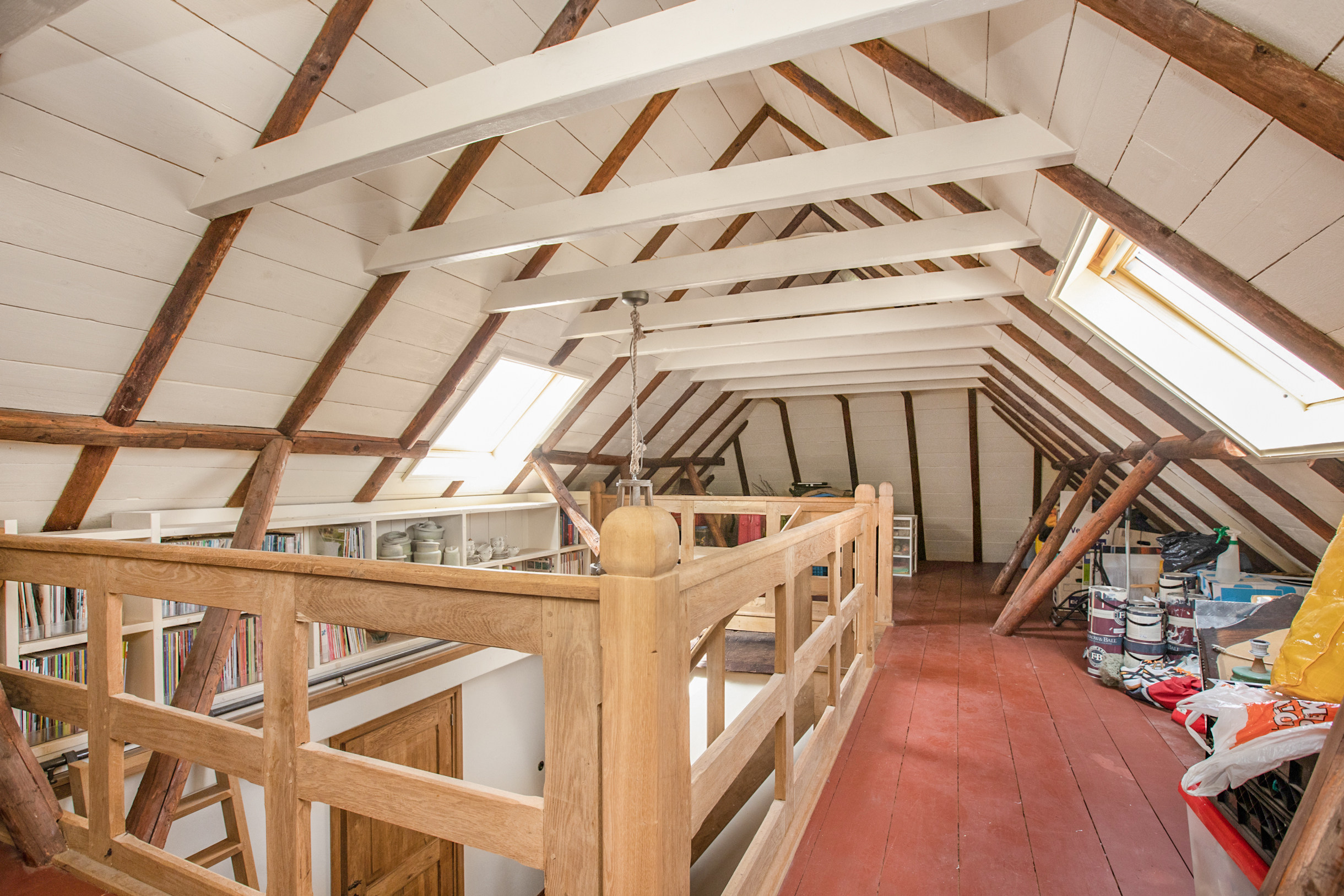 Een vaste trap brengt je naar de 2e verdieping van de woning. Ook deze verdieping beschikt over een zeer ruime vide. Vanuit deze vide kijk je middels de vide op de 1e verdieping deels de woonkamer in wat een zeer ruimtelijk effect creëert. De 2e verdieping is zo ruim dat deze gemakkelijk te gebruiken is als 6e slaapkamer, kantoor of bergingsruimte.