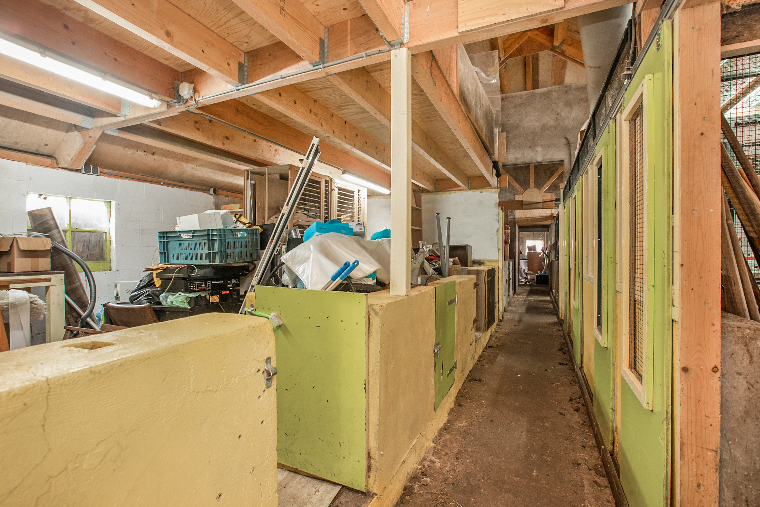 het houden van paarden of ander vee. Dit omdat er een verhard plein om de stal heen ligt en dit bereikbaar is middels openslaande, grote staldeuren. Ook bevinden zich hier diverse goede, stabiele binnen- en buitenvolieres geschikt voor vogels en/of knaagdieren, of ander kleinvee. Ook een ruime kantine ontbreekt niet in deze grote stal. Voor vele hobby’s is dit object inzetbaar; ook voor bijvoorbeeld voor het geven van dagbesteding.