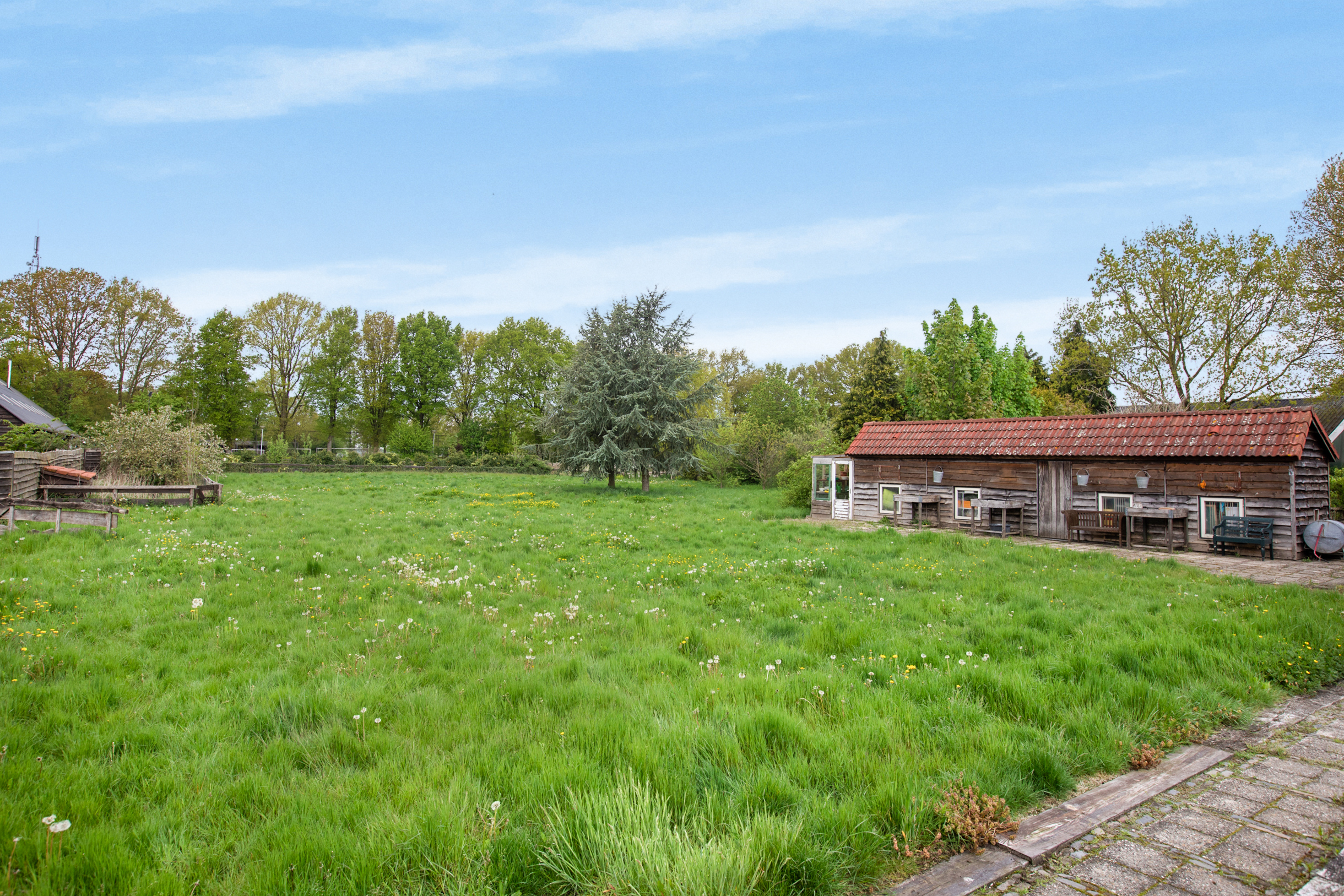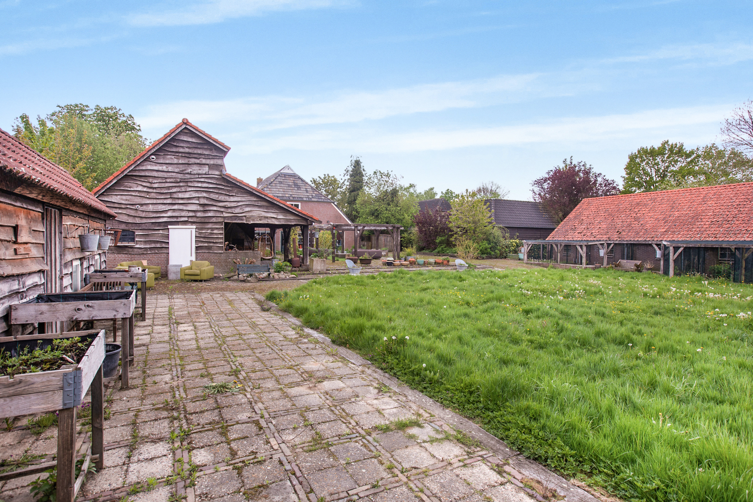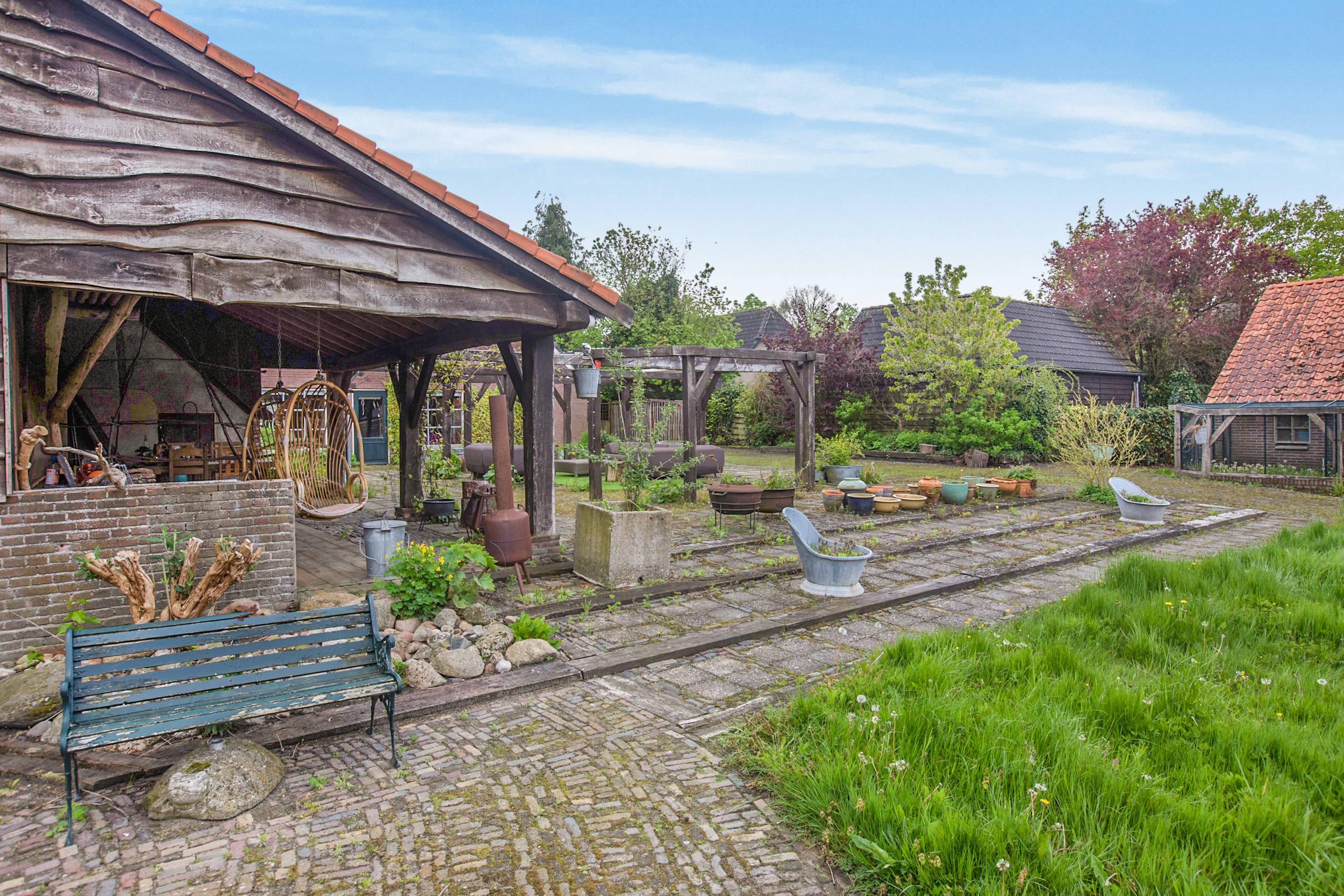 Een enorme tuin op zuidwesten met veel groen, vrij uitzicht en diverse ruime opstallen geschikt voor vele doeleinden waaronder 1 vrijstaande, landelijk verbouwde kapschuur met daarin op dit moment een fotostudio, toilet en wastafel. Deze schuur is deels van steen, deels van hout en is deels geïsoleerd. Deze ruimte leent zich uitstekend voor het opzetten van een B&B. Er is een vaste trap naar boven met een enorme vliering en een geweldige uitkijk over de tuin. Deze kapschuur heeft zijn eigen meterkast, aanleg van krachtstroom en er is een extra wifipoint aanwezig. In de avondzon is het hier heerlijk vertoeven onder de overkapping mijmerend op de schommelstoelen.