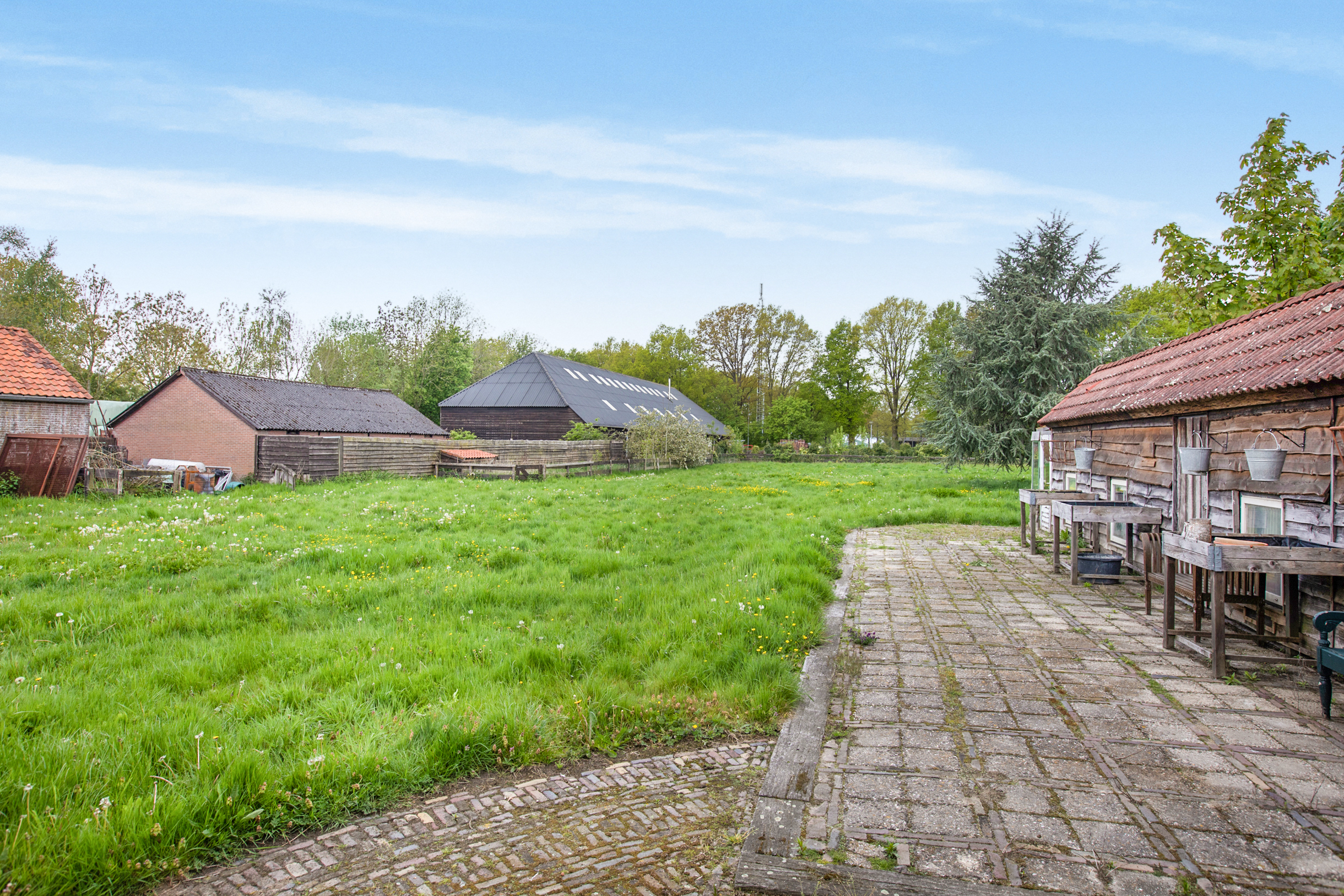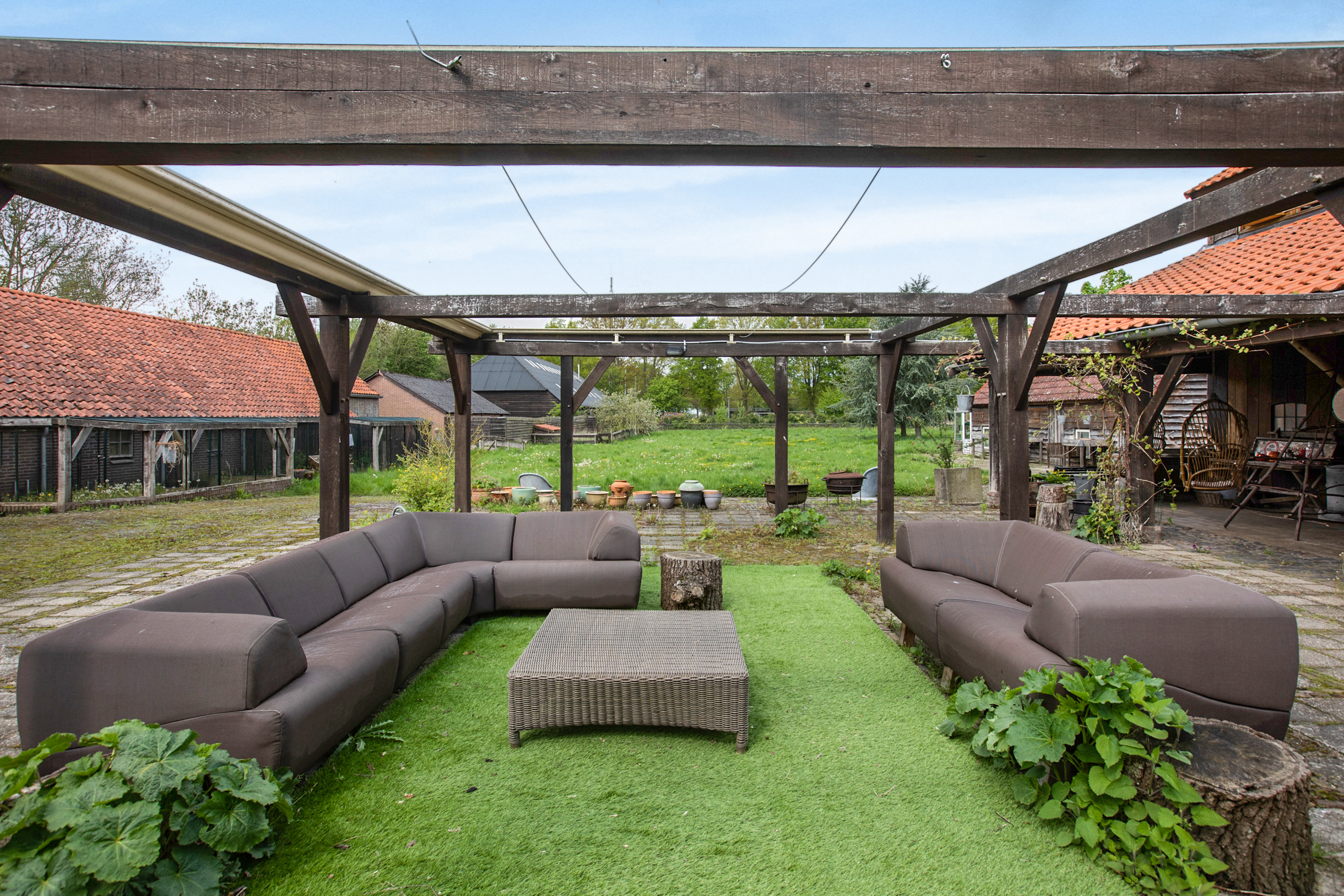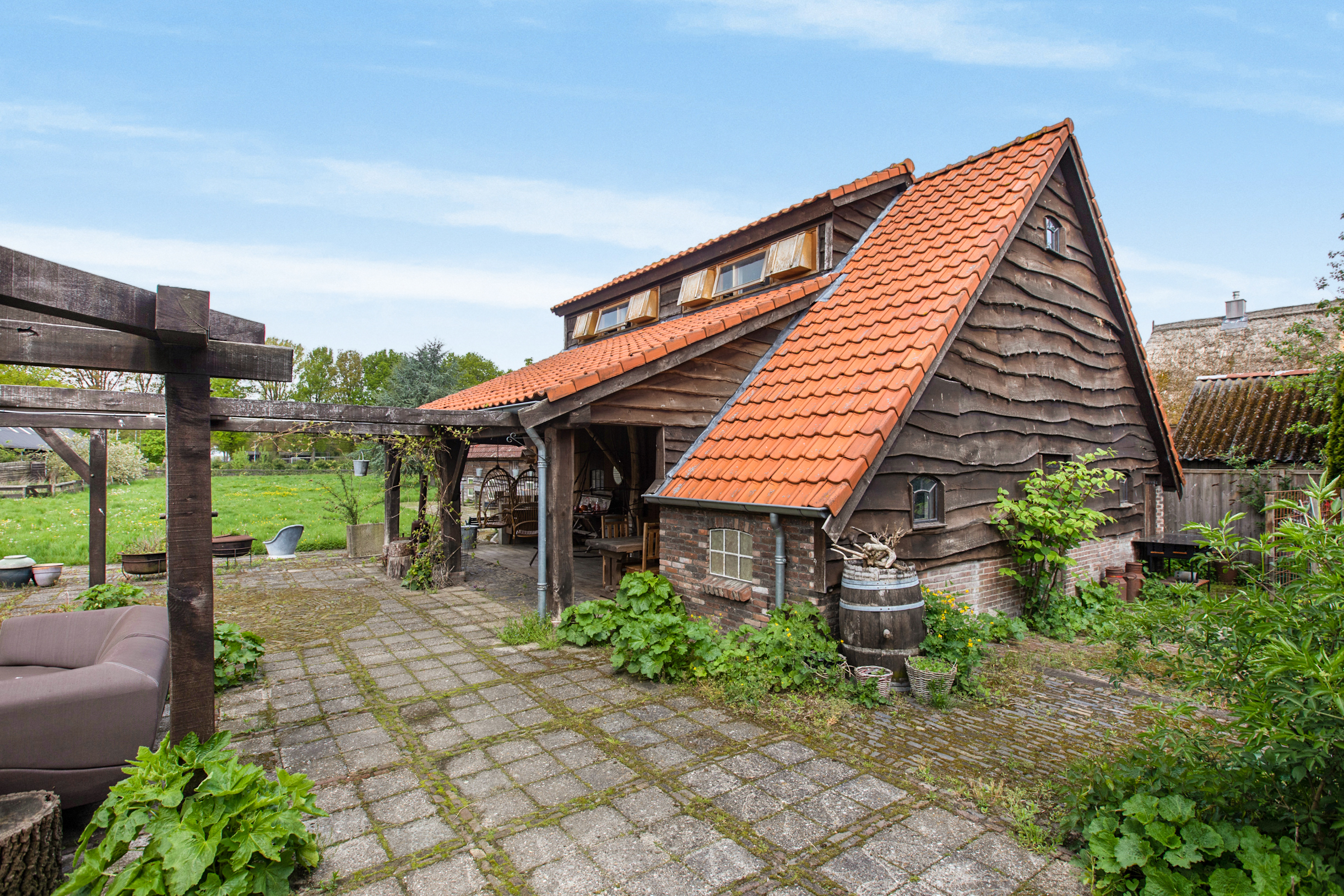 Een enorme tuin op zuidwesten met veel groen, vrij uitzicht en diverse ruime opstallen geschikt voor vele doeleinden waaronder 1 vrijstaande, landelijk verbouwde kapschuur met daarin op dit moment een fotostudio, toilet en wastafel. Deze schuur is deels van steen, deels van hout en is deels geïsoleerd. Deze ruimte leent zich uitstekend voor het opzetten van een B&B. Er is een vaste trap naar boven met een enorme vliering en een geweldige uitkijk over de tuin. Deze kapschuur heeft zijn eigen meterkast, aanleg van krachtstroom en er is een extra wifipoint aanwezig. In de avondzon is het hier heerlijk vertoeven onder de overkapping mijmerend op de schommelstoelen.
