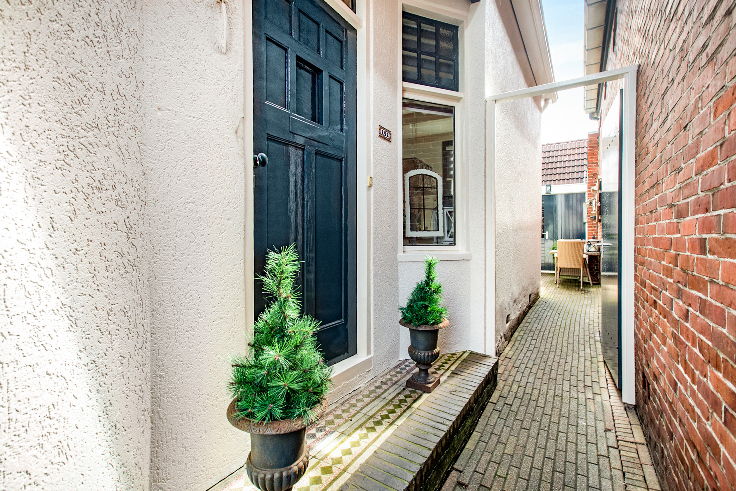 De huidige entree is aan de binnenzijde weggewerkt (muur voorgezet) waardoor de entree zich nu in de keuken bevindt. Via de achtertuin komt u bij de keuken.
