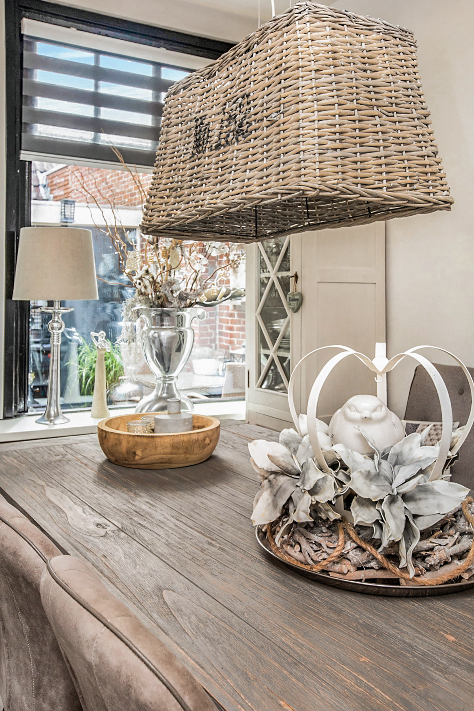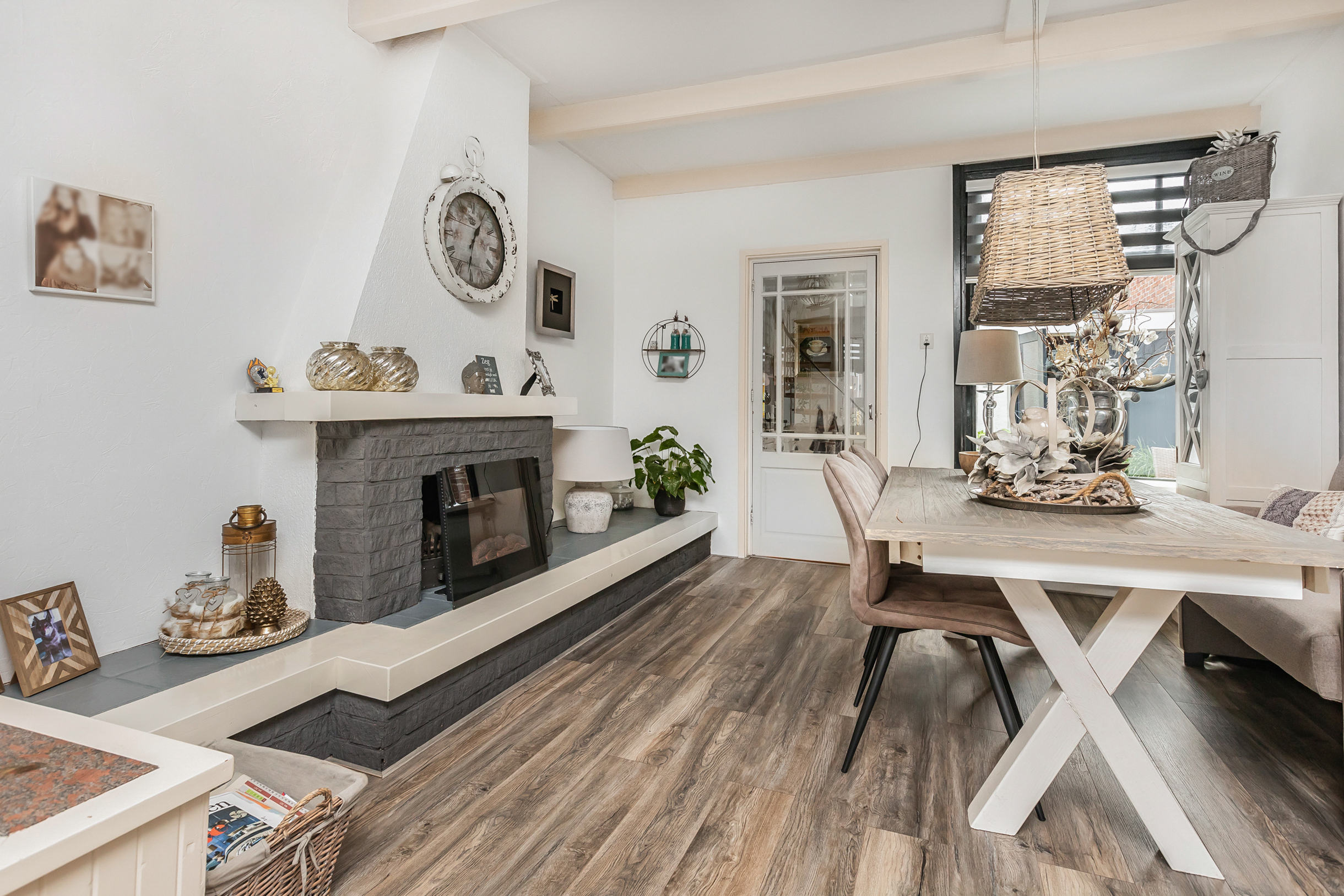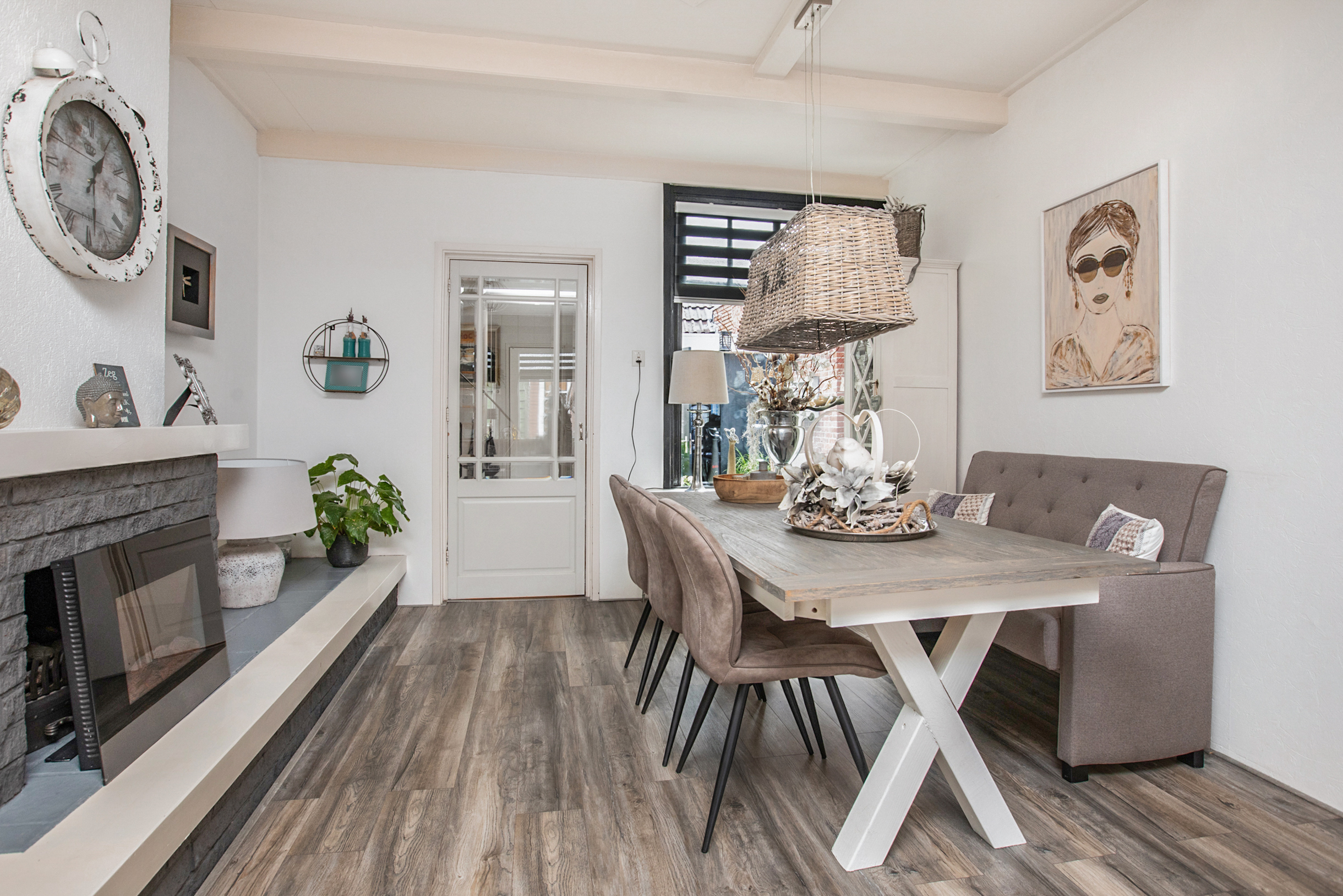 Vanuit de keuken is er toegang tot de ruime en lichte woon-/eetkamer. De woonkamer is erg sfeervol door de karakteristieke details die behouden zijn gebleven, zoals het balkenplafond, glas-in-lood, erker en schouw. In de woonkamer bevindt zich de meterkast en de trap naar de kelder en 1e verdieping.