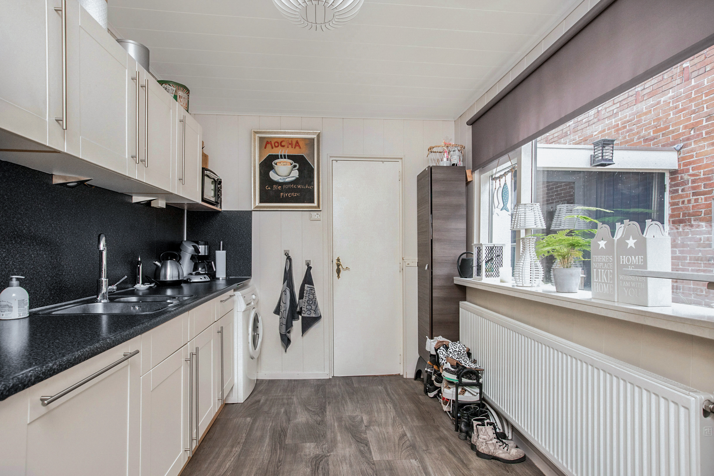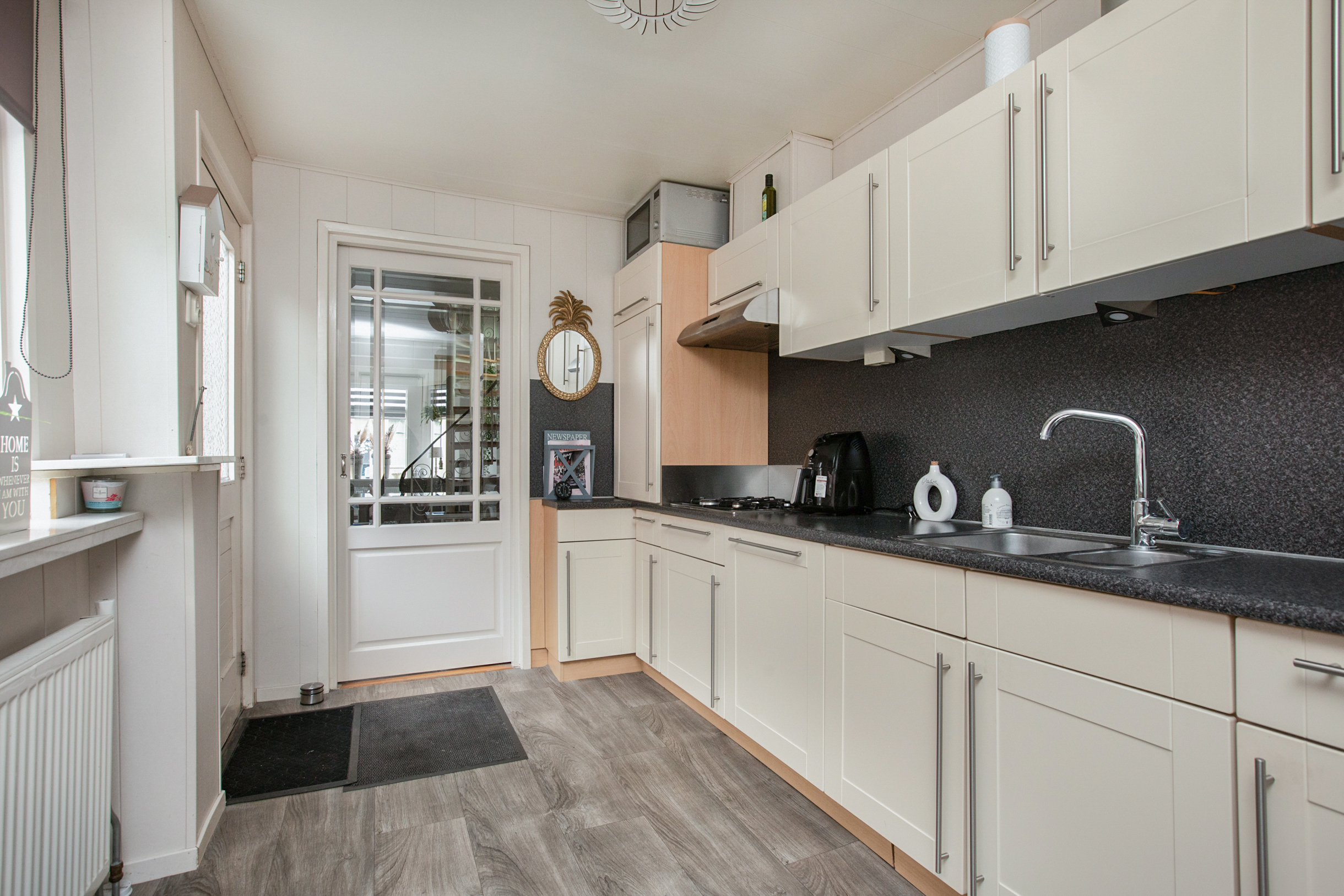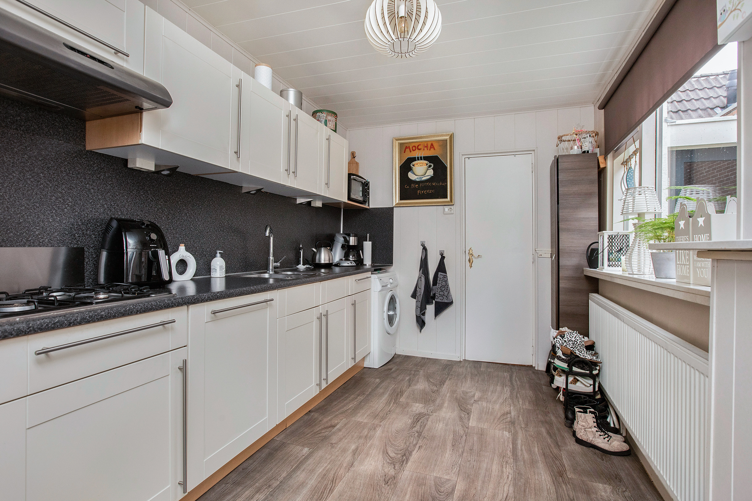 De keuken in rechte wandopstelling is voorzien van diverse inbouwapparatuur, zoals koelkast, 4-pitsgaskookplaat, afzuigkap en vaatwasser. Tevens is hier een aansluiting voor de wasmachine.
