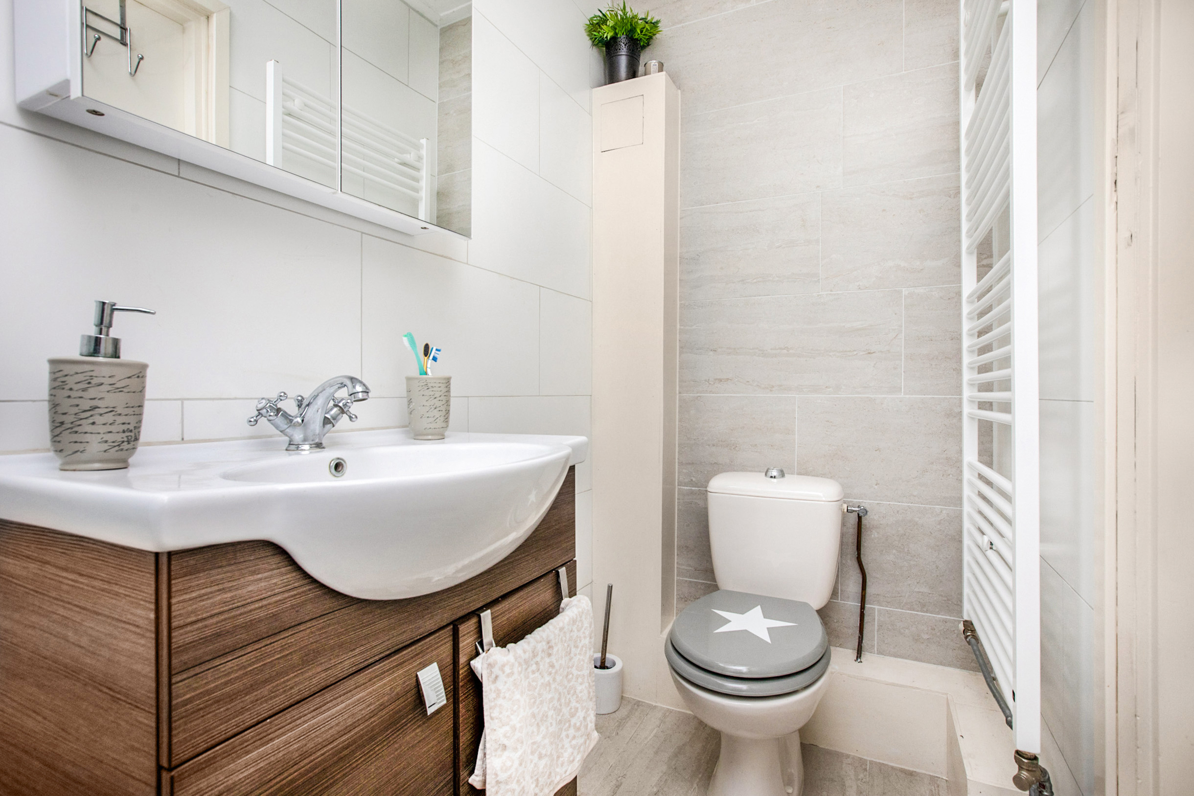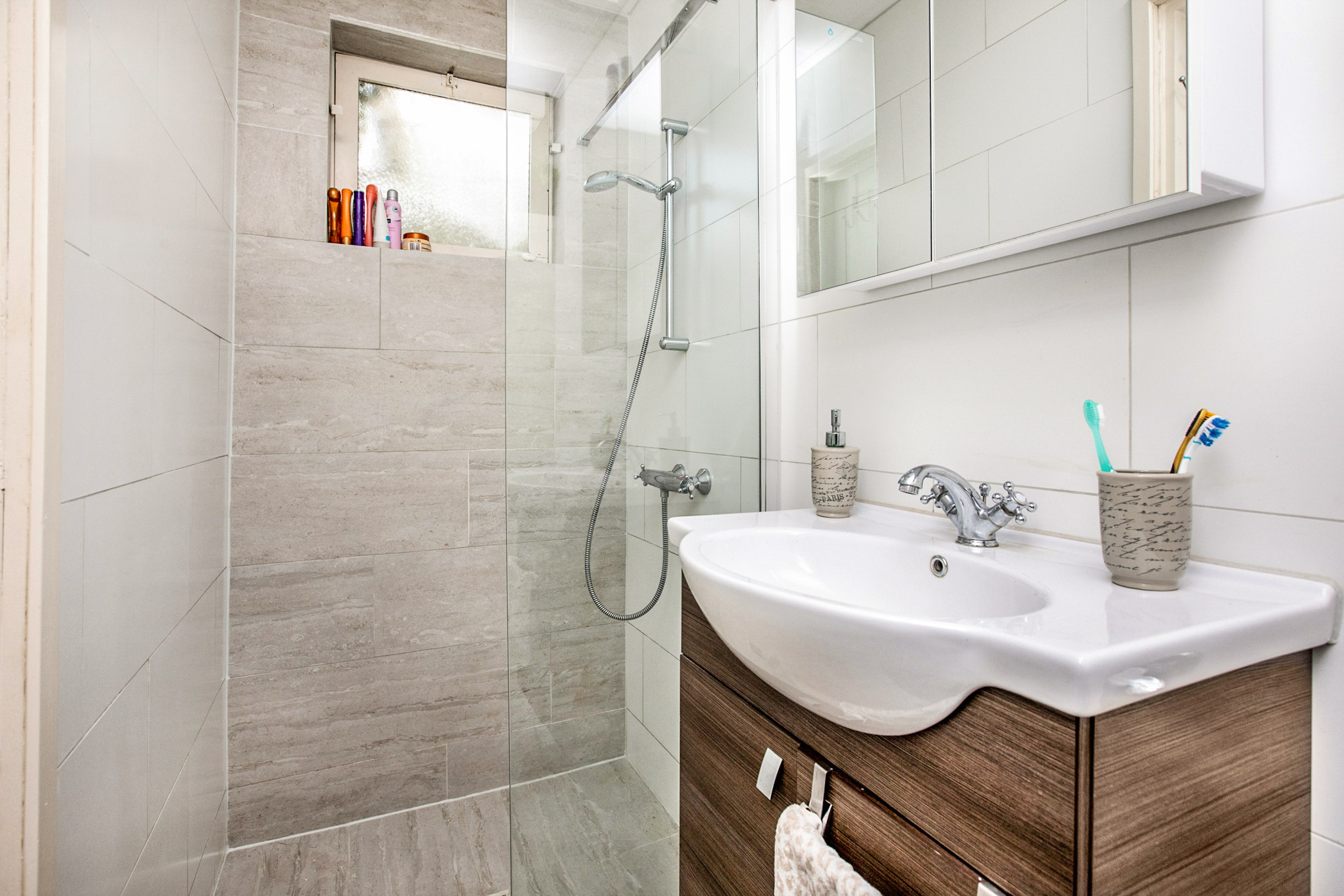 Daarnaast is er vanuit de keuken toegang tot de nette, geheel betegelde badkamer. De