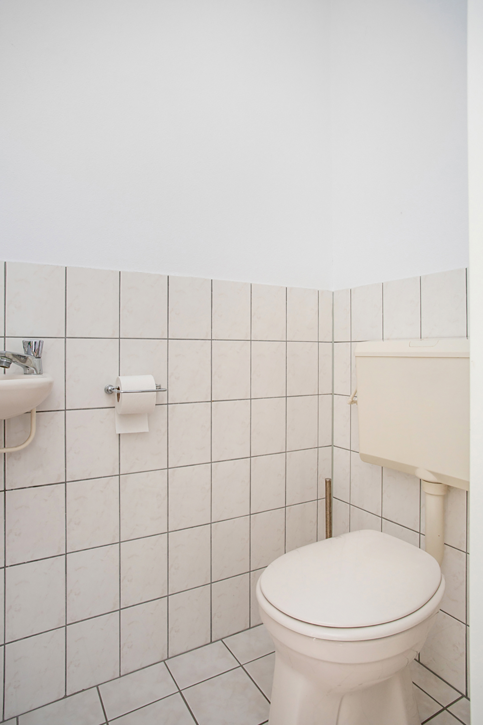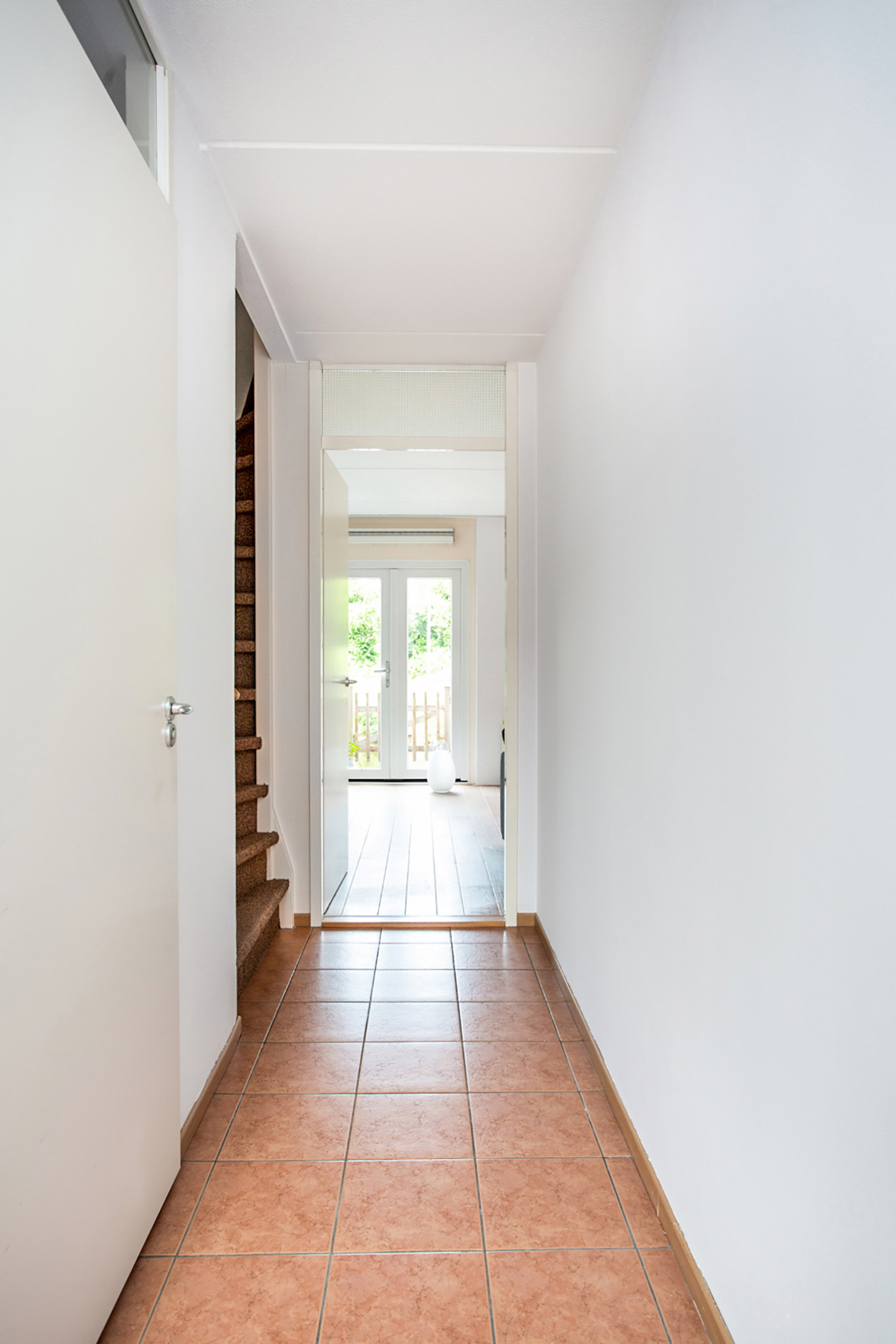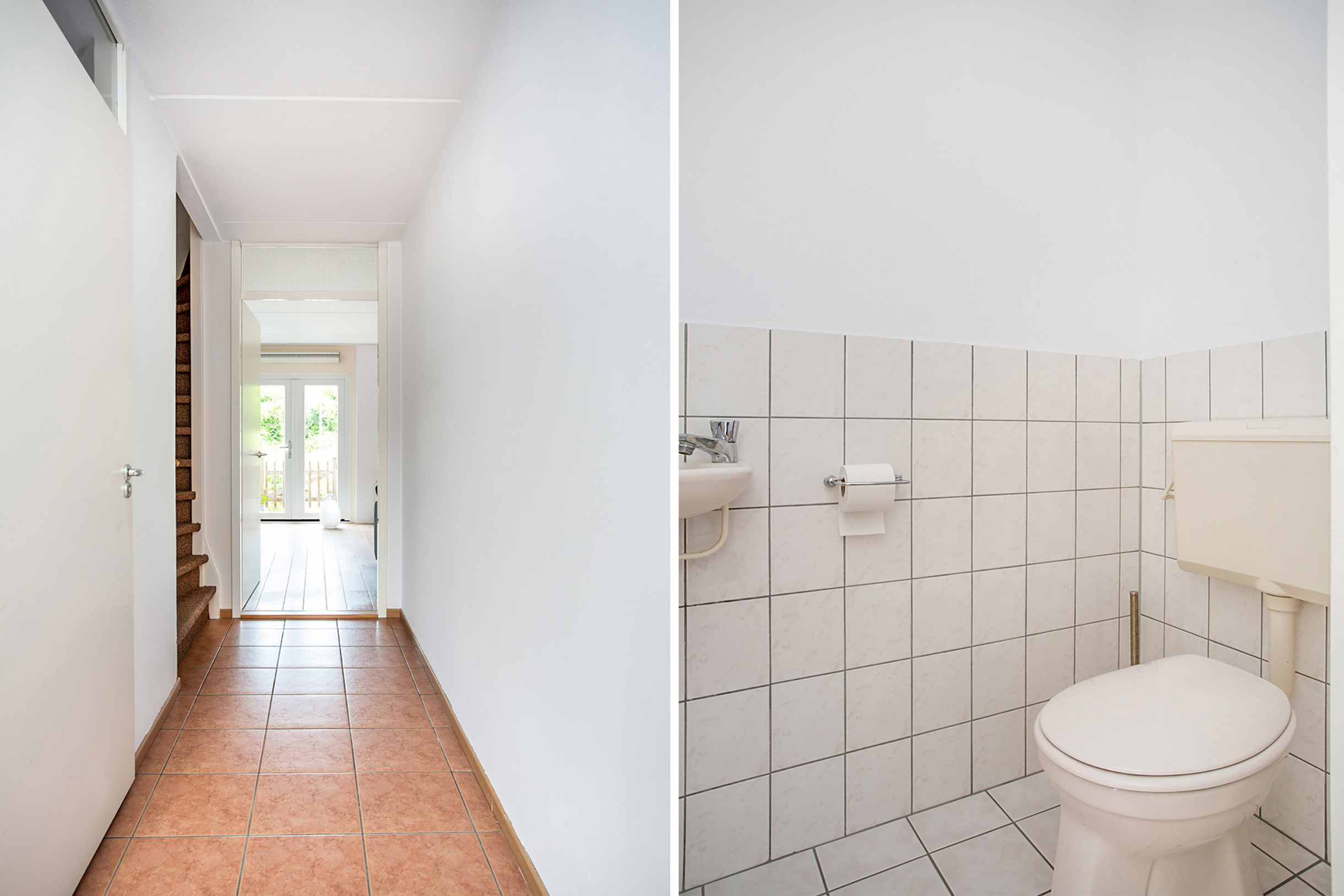 Entree/hal met plavuizen en toilet, woonkamer met een vaste eiken parketvloer (white wash) en