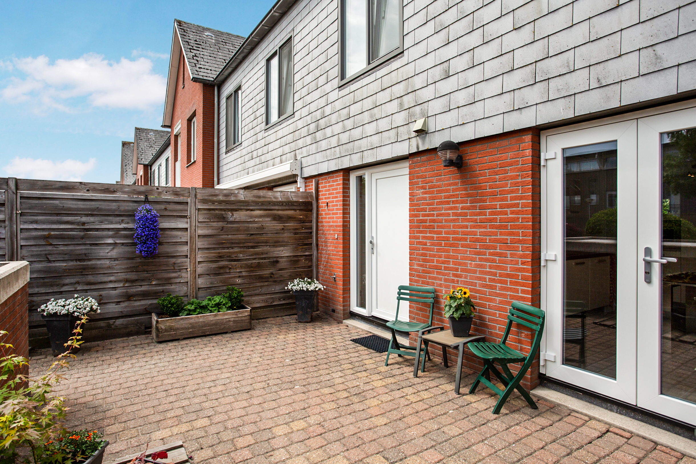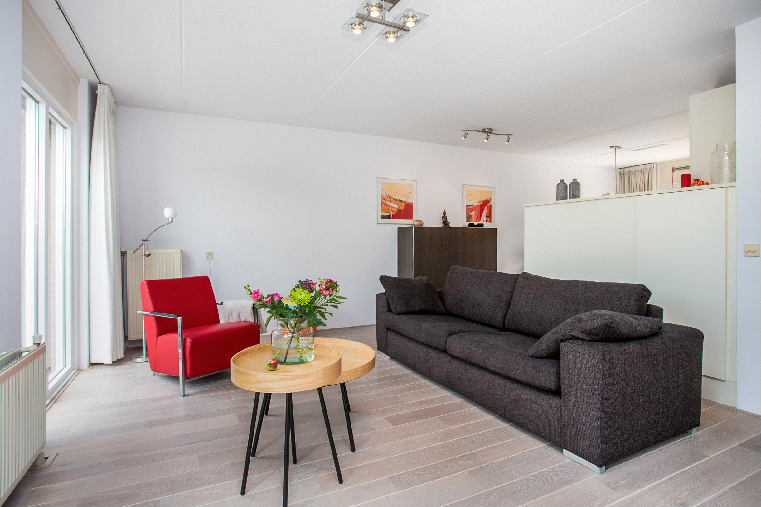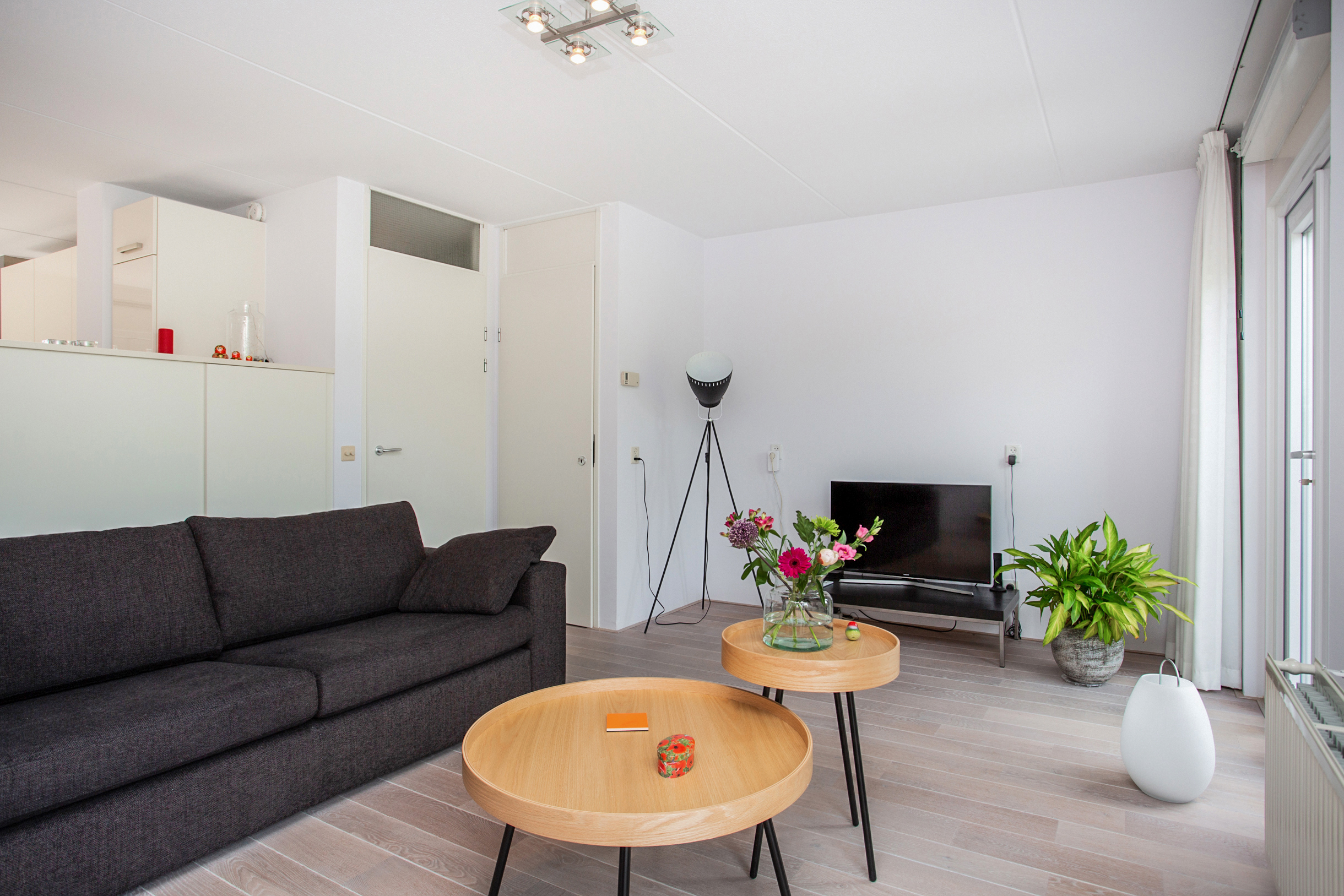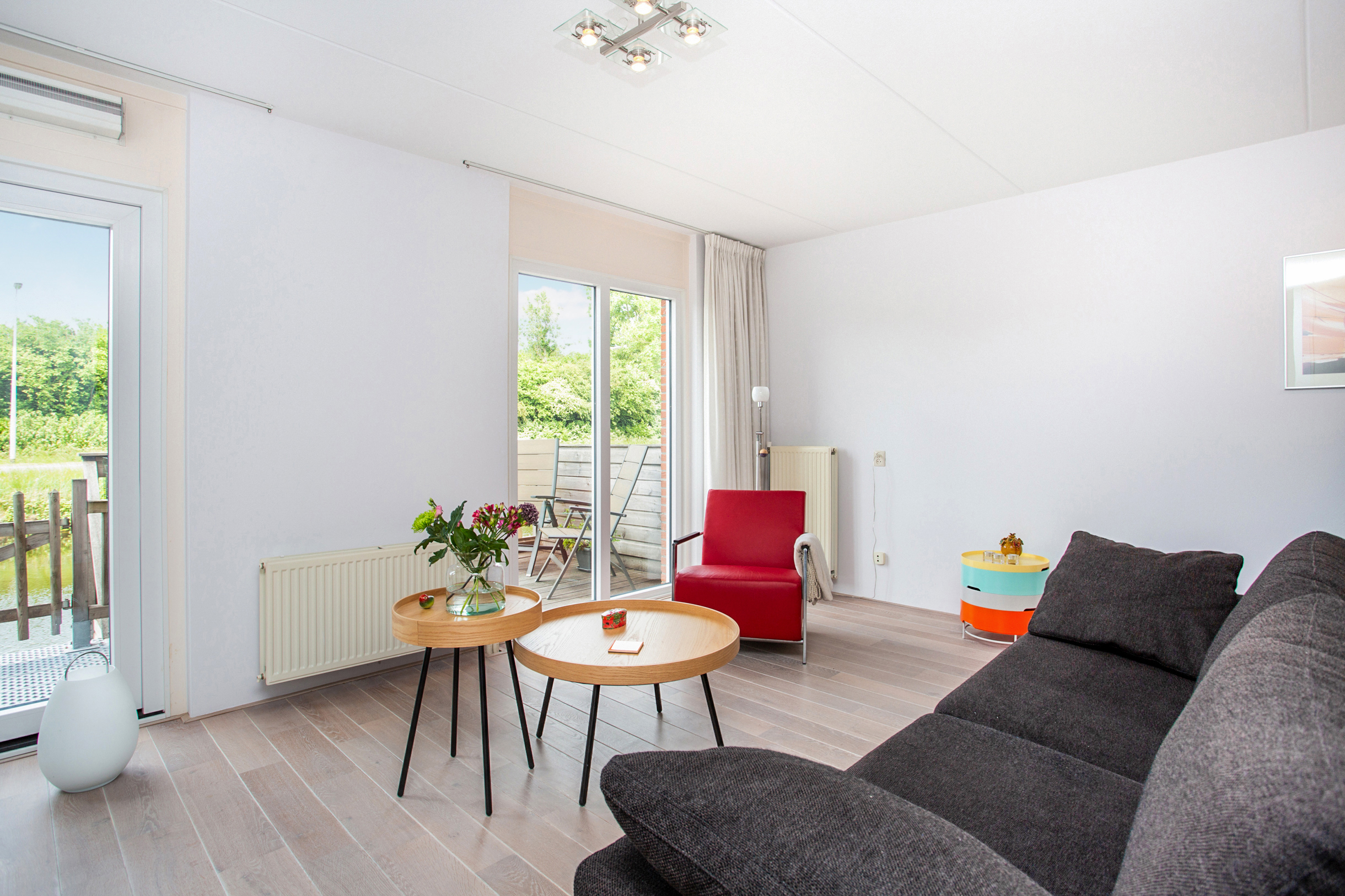 watergerichte woonkamer en een open keuken aan de voorzijde met een beschut zonneterras.