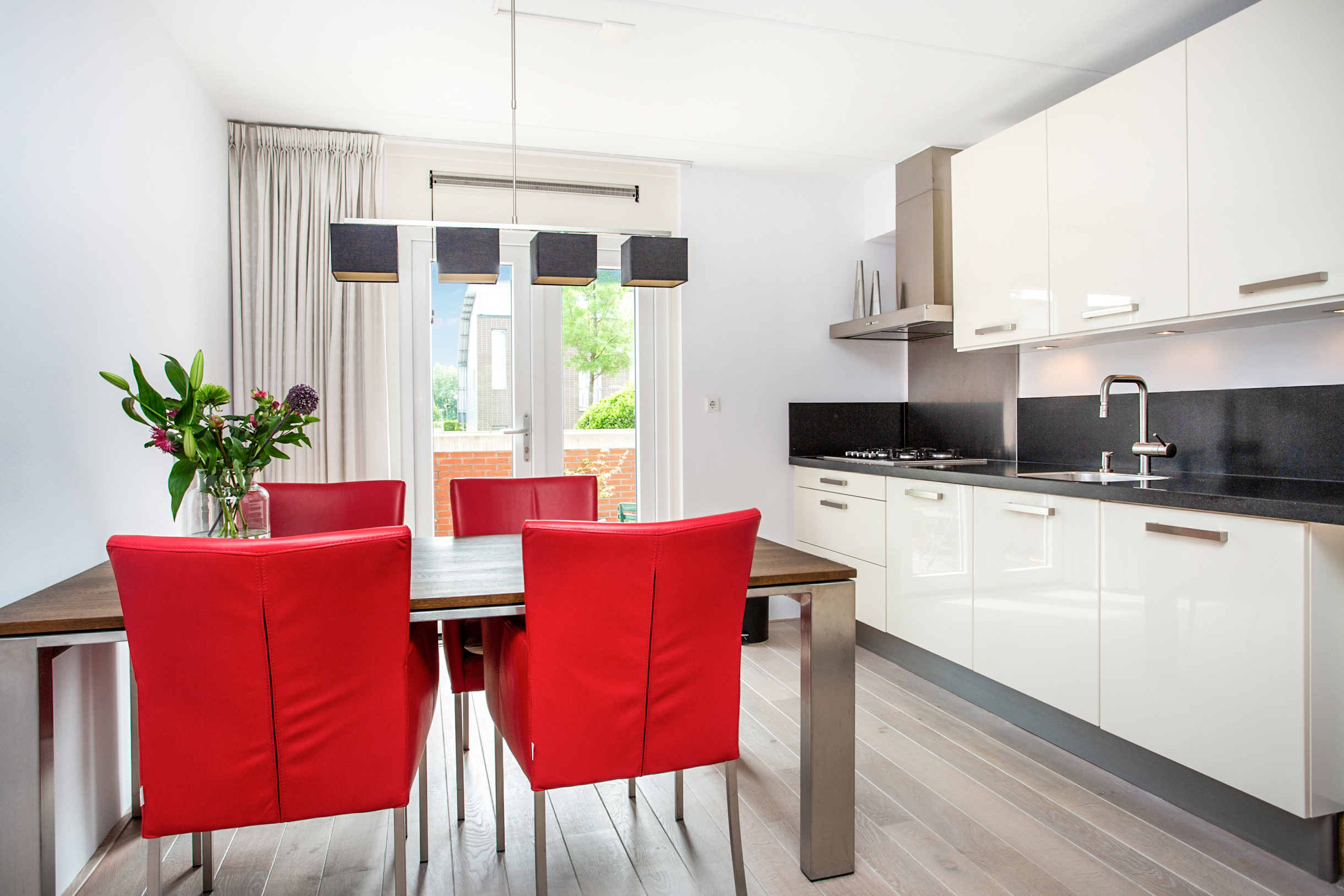 dubbele deuren naar het terras aan de voortuin van ca. 22 m². De keuken is voorzien van een keurige