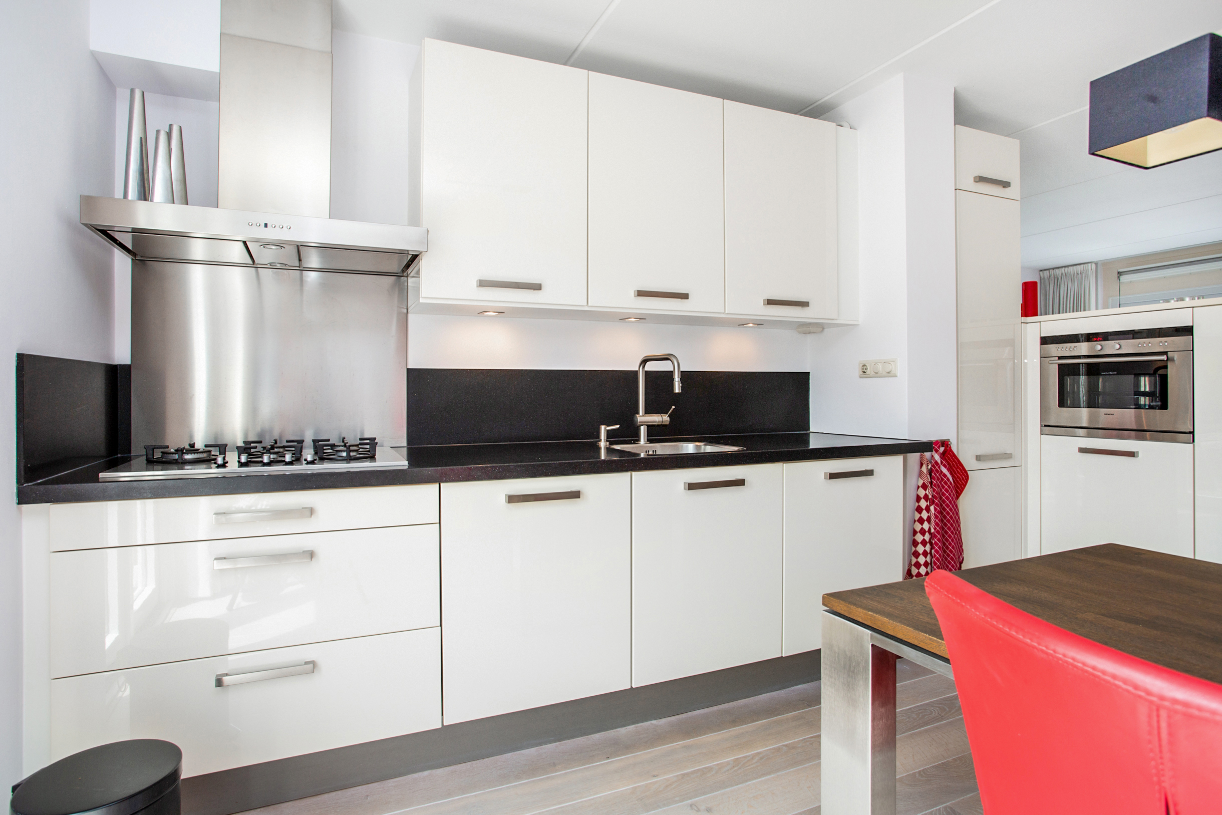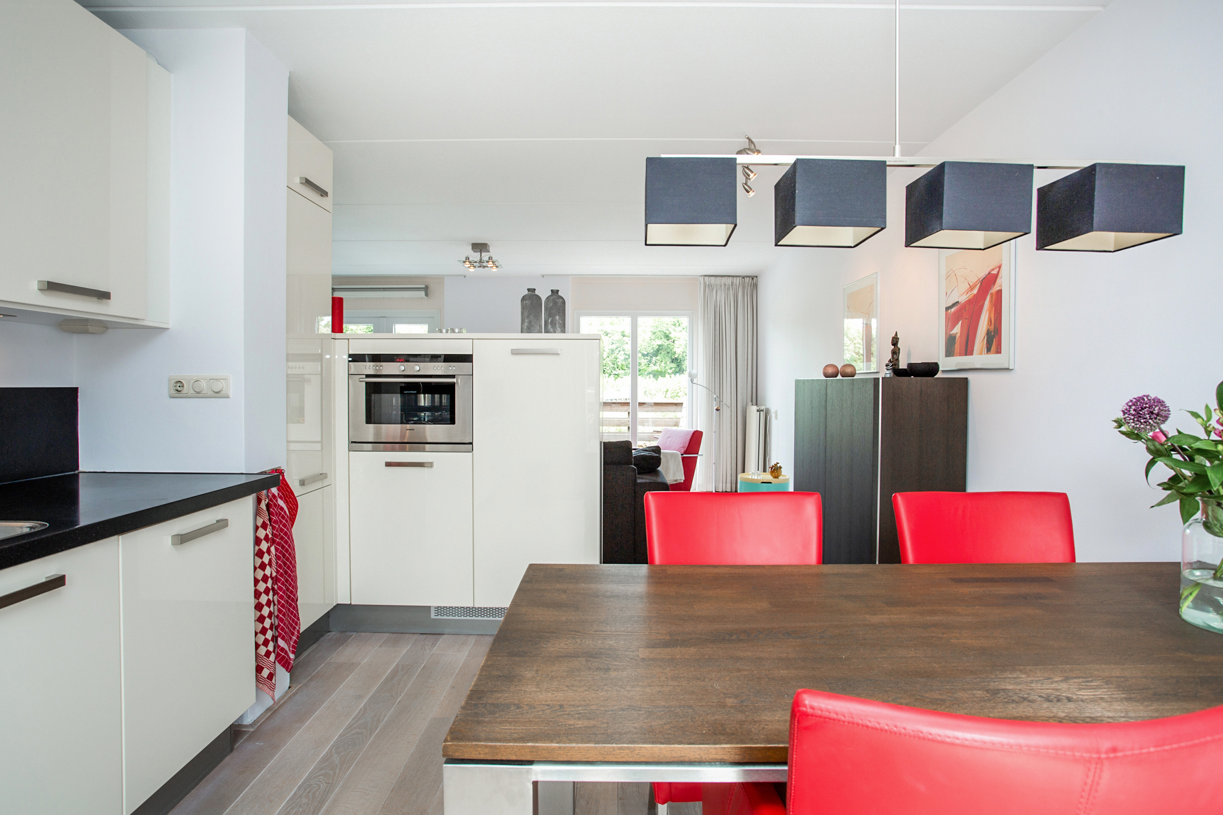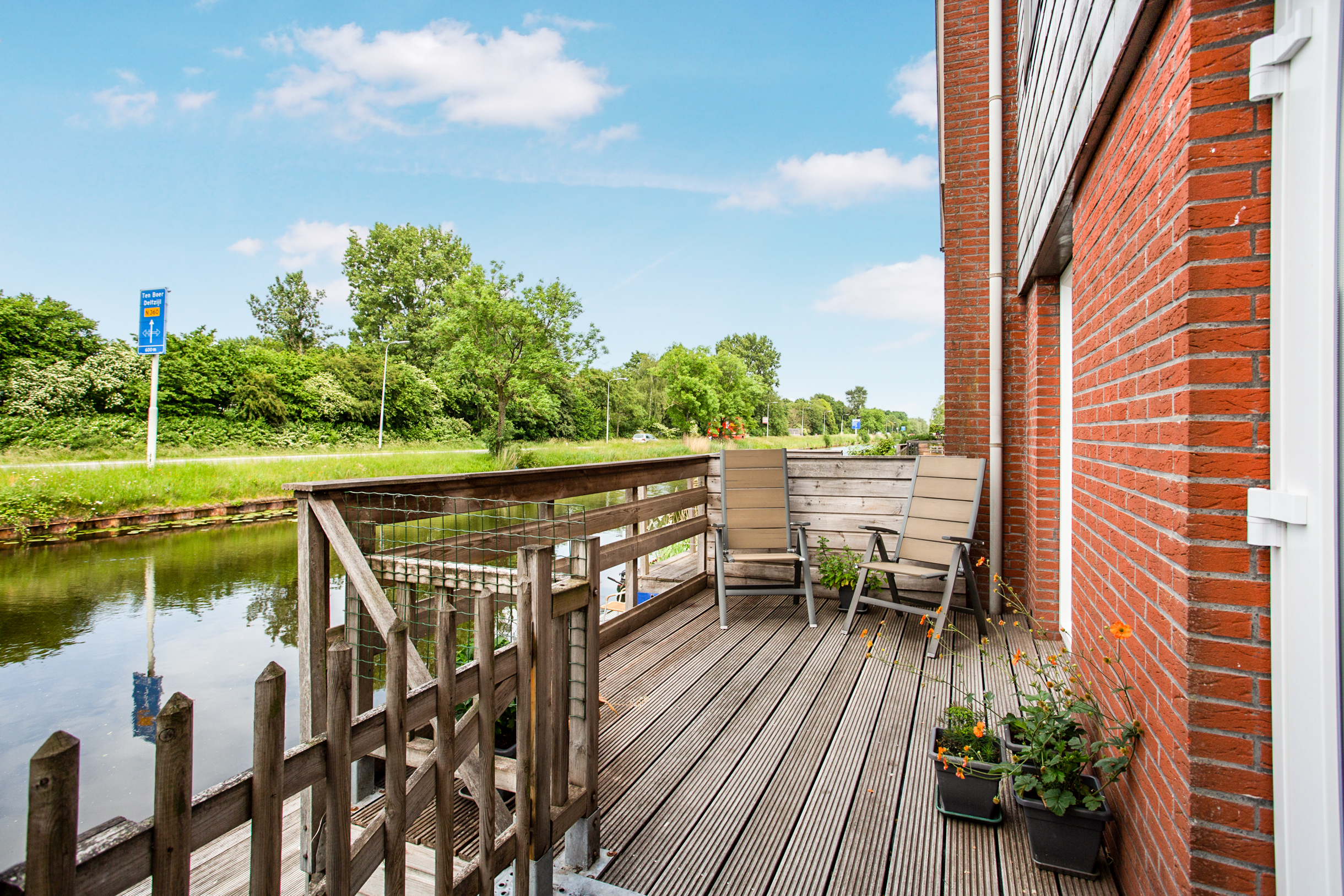 openslaande tuindeuren naar het terras van ca. 30 m² aan het water, provisiekast, open keuken met