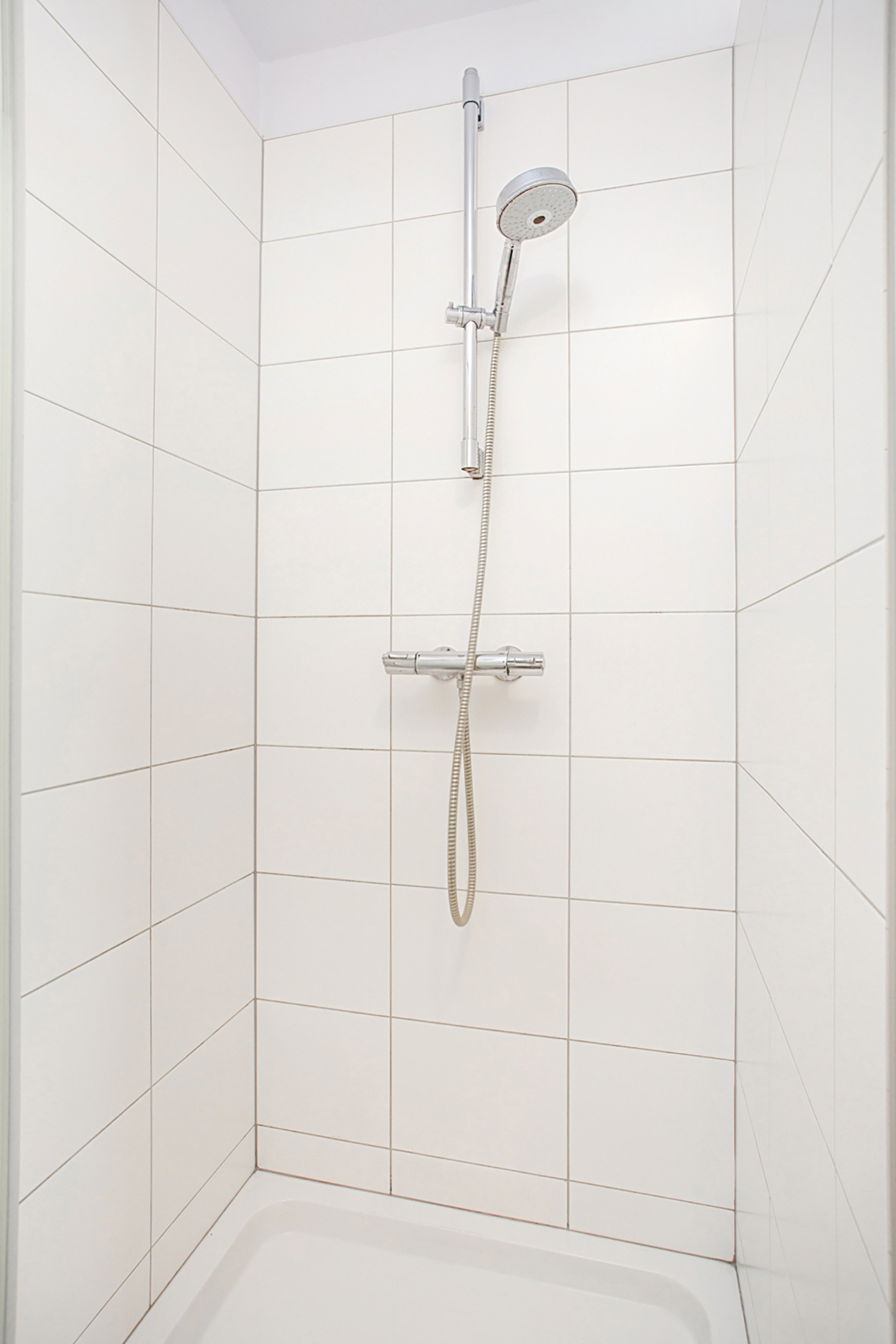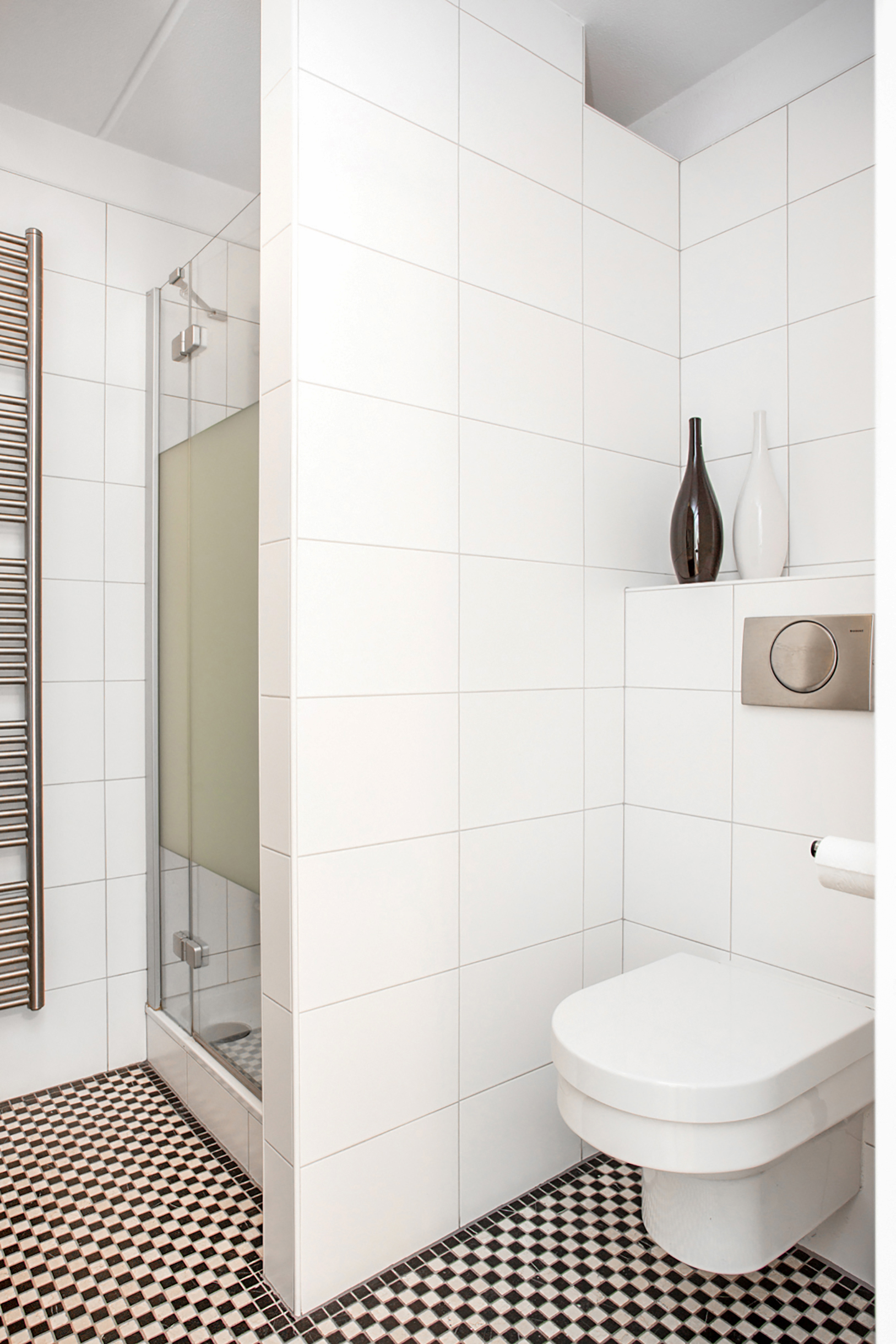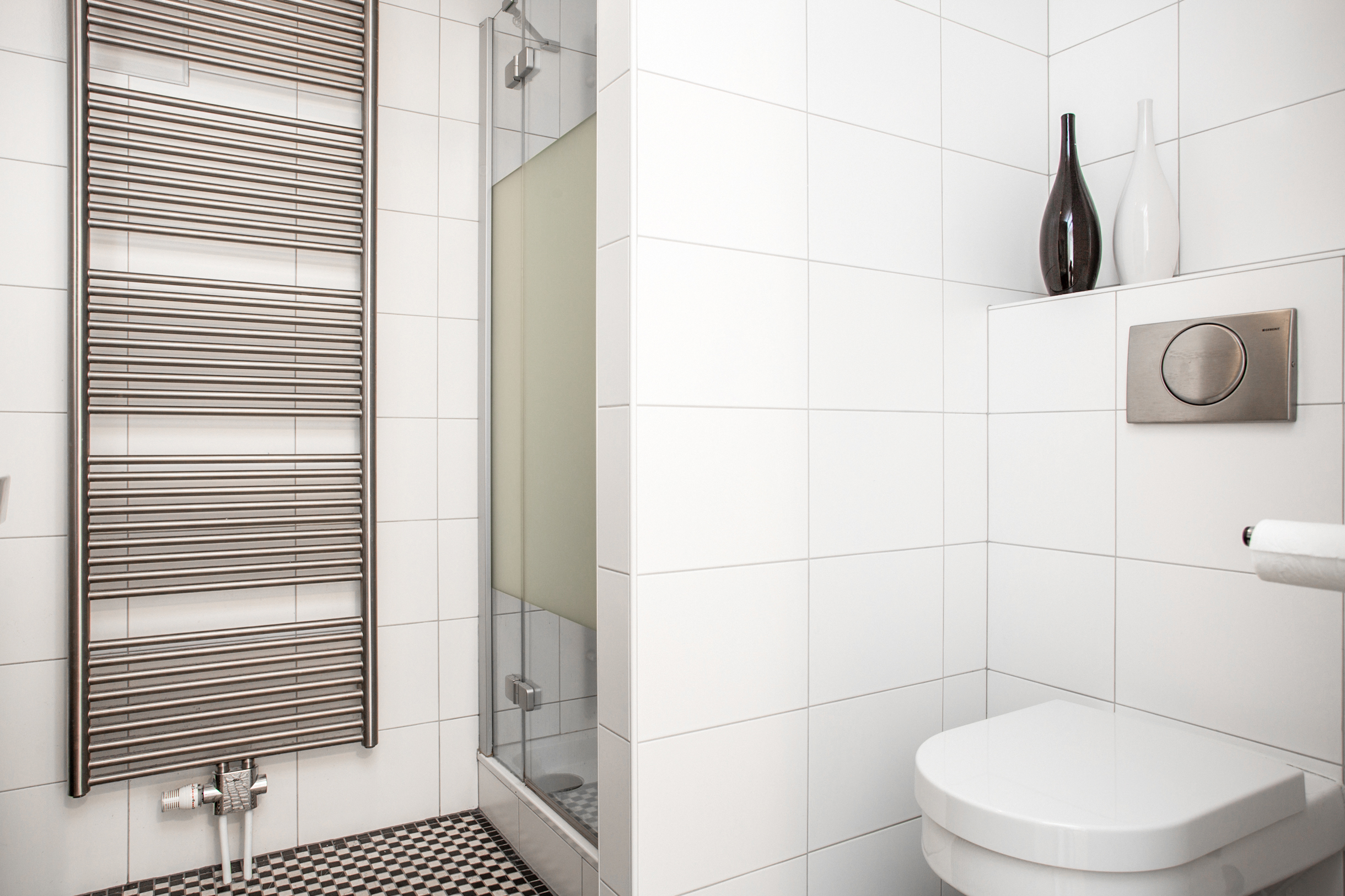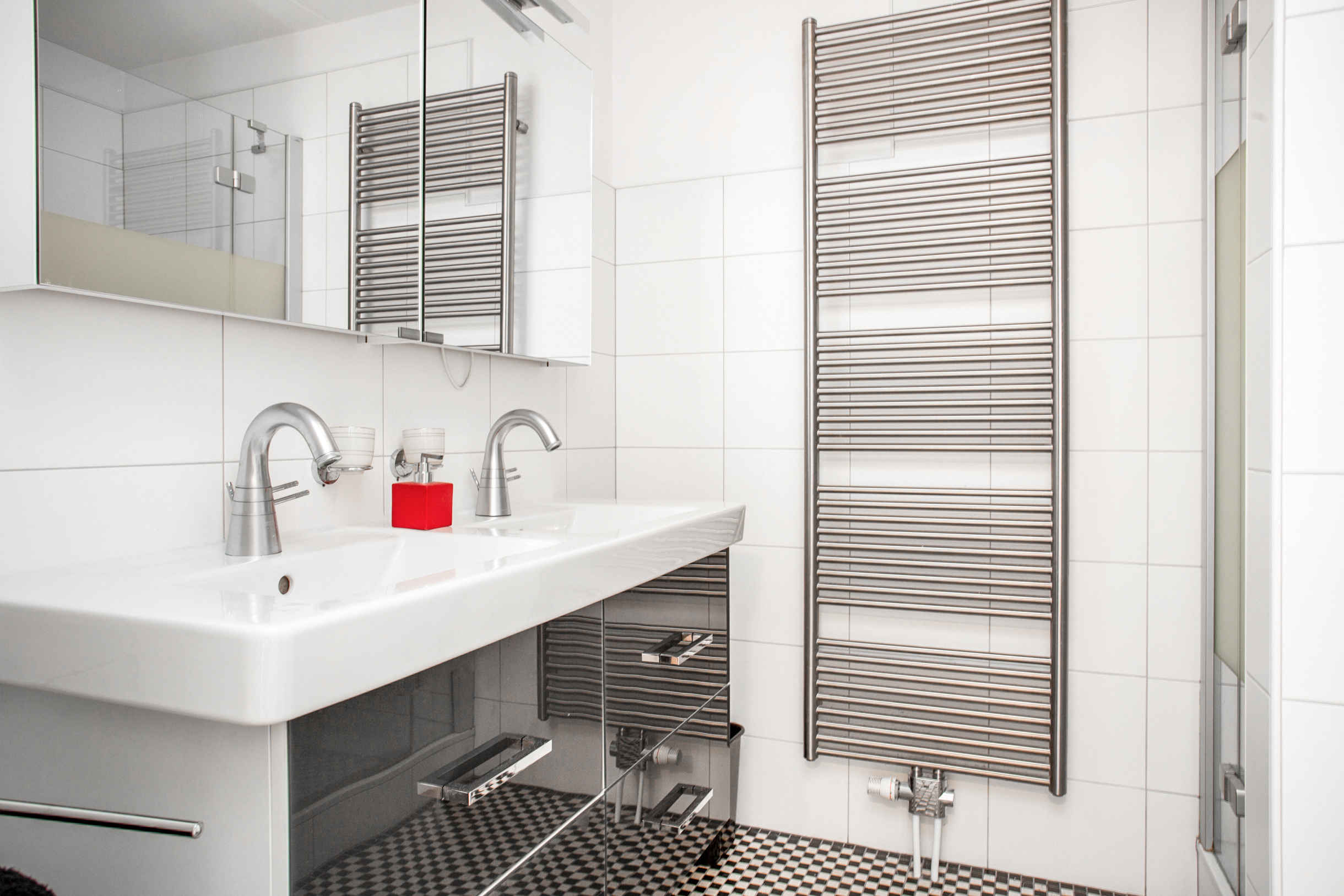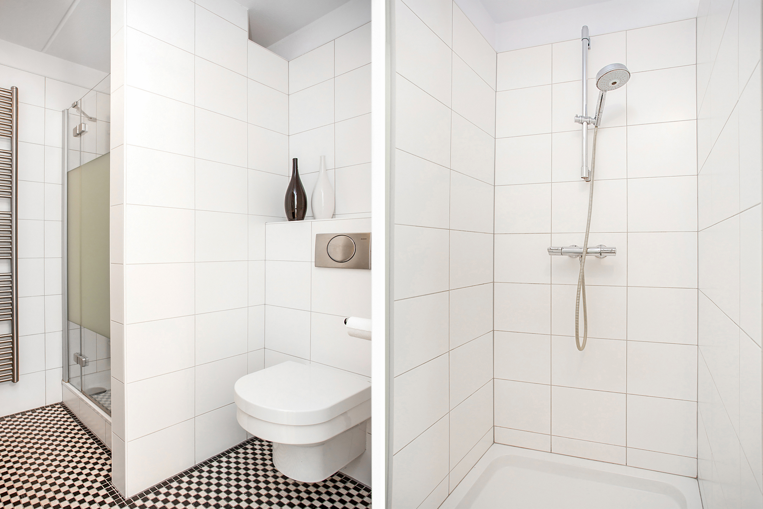 dubbele wastafel met meubel, douchecabine, 2e toilet en designradiator.