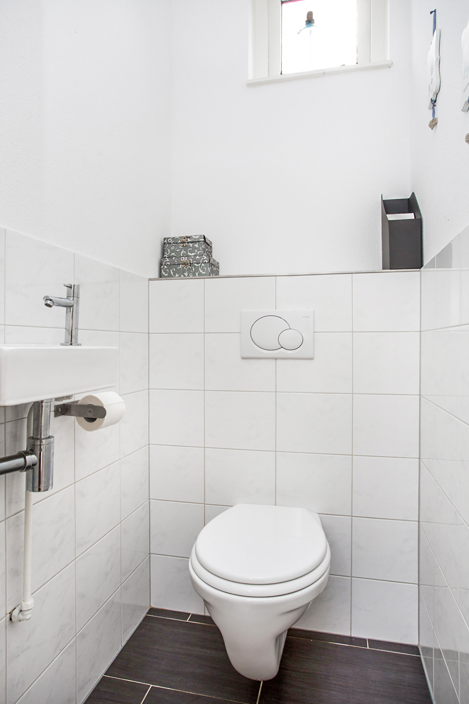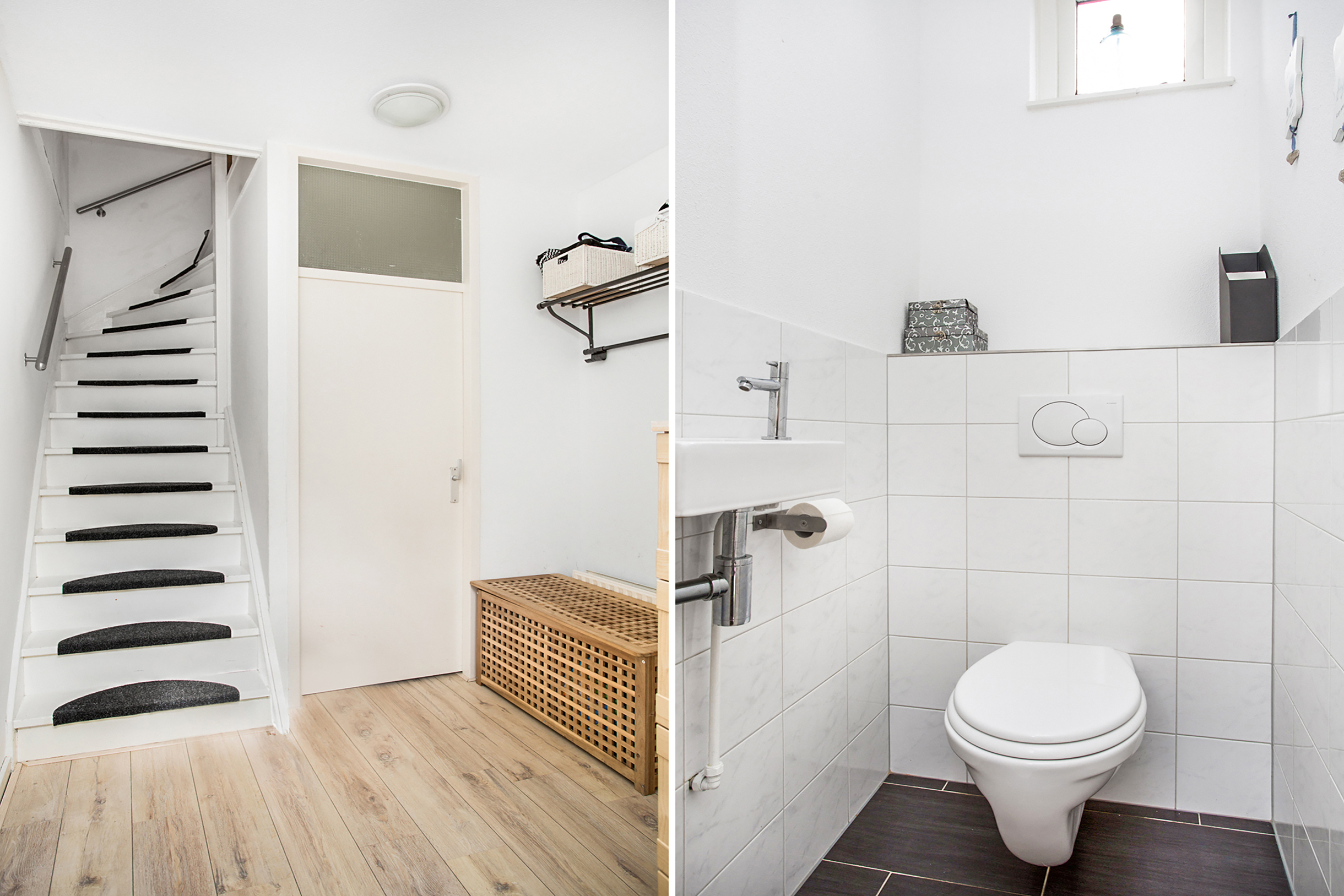Entree/hal met meterkast, half betegelde toiletruimte met wandcloset en fonteintje,