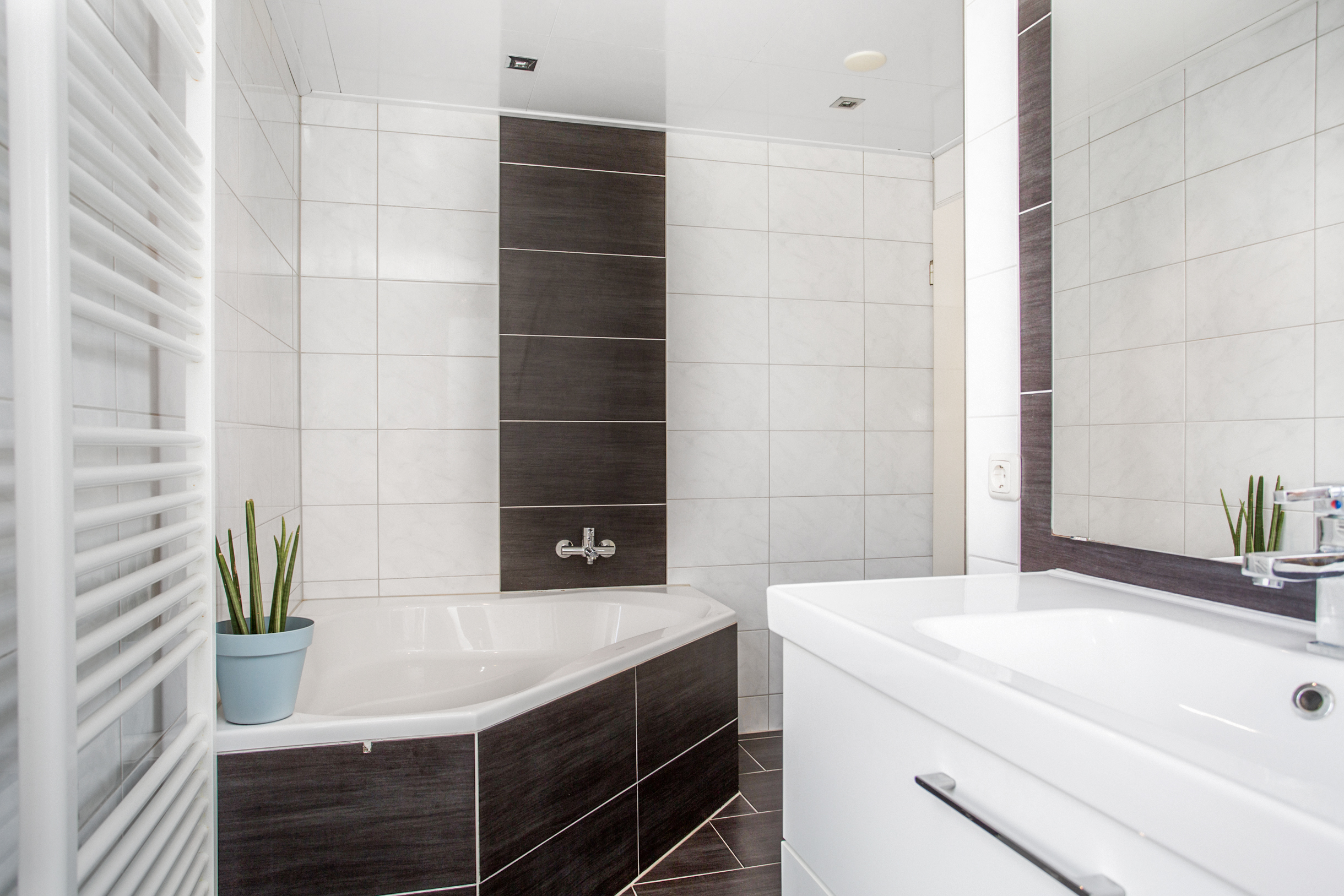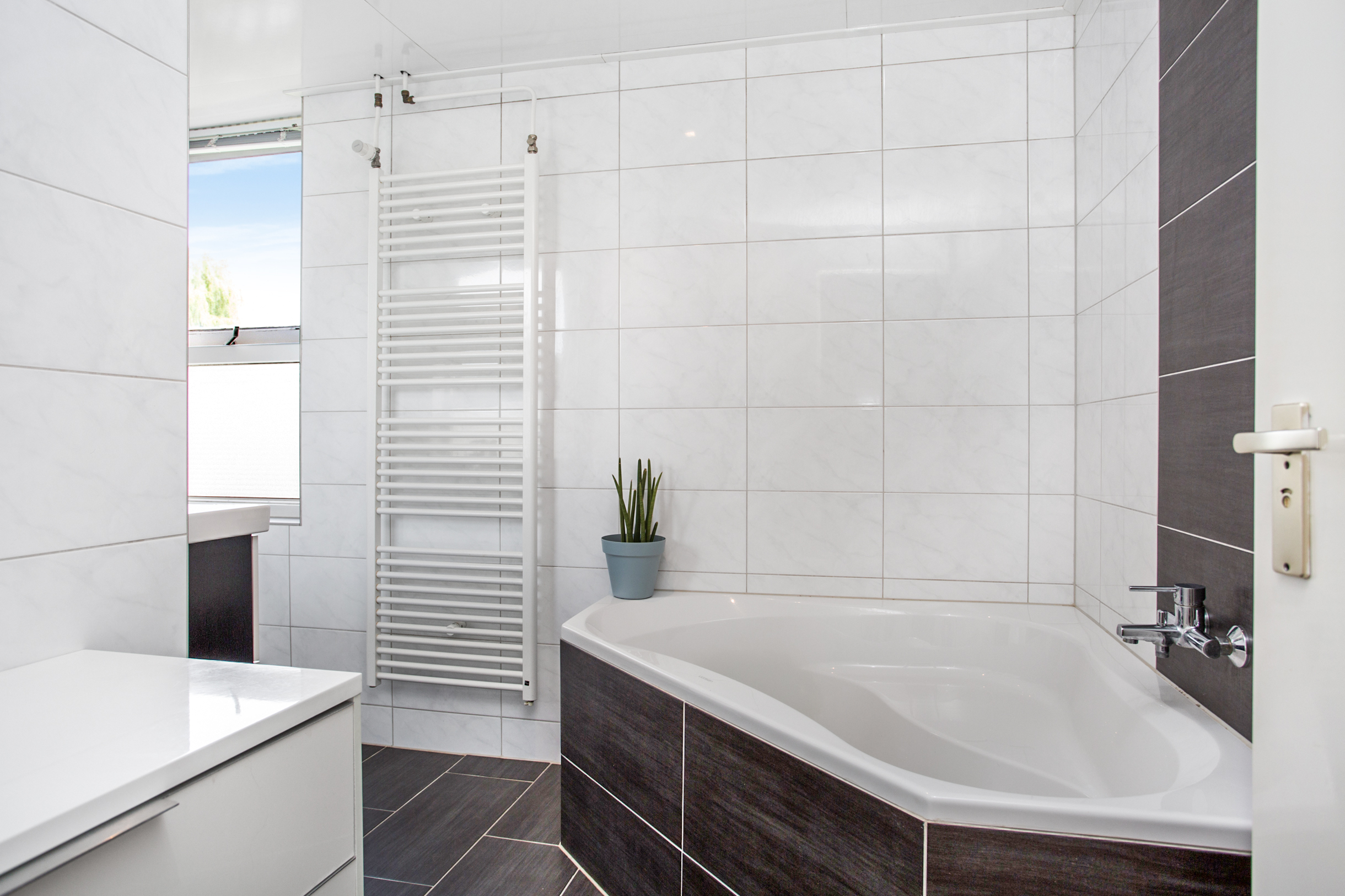 De moderne badkamer is voorzien van ligbad, wastafelmeubel, inloopdouche en