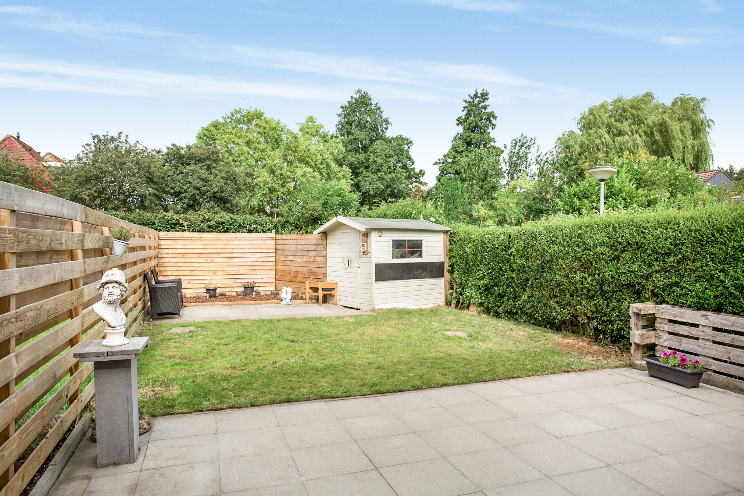 is voorzien van terras, gazon, borders, extra vrijstaande houten berging en achterom.