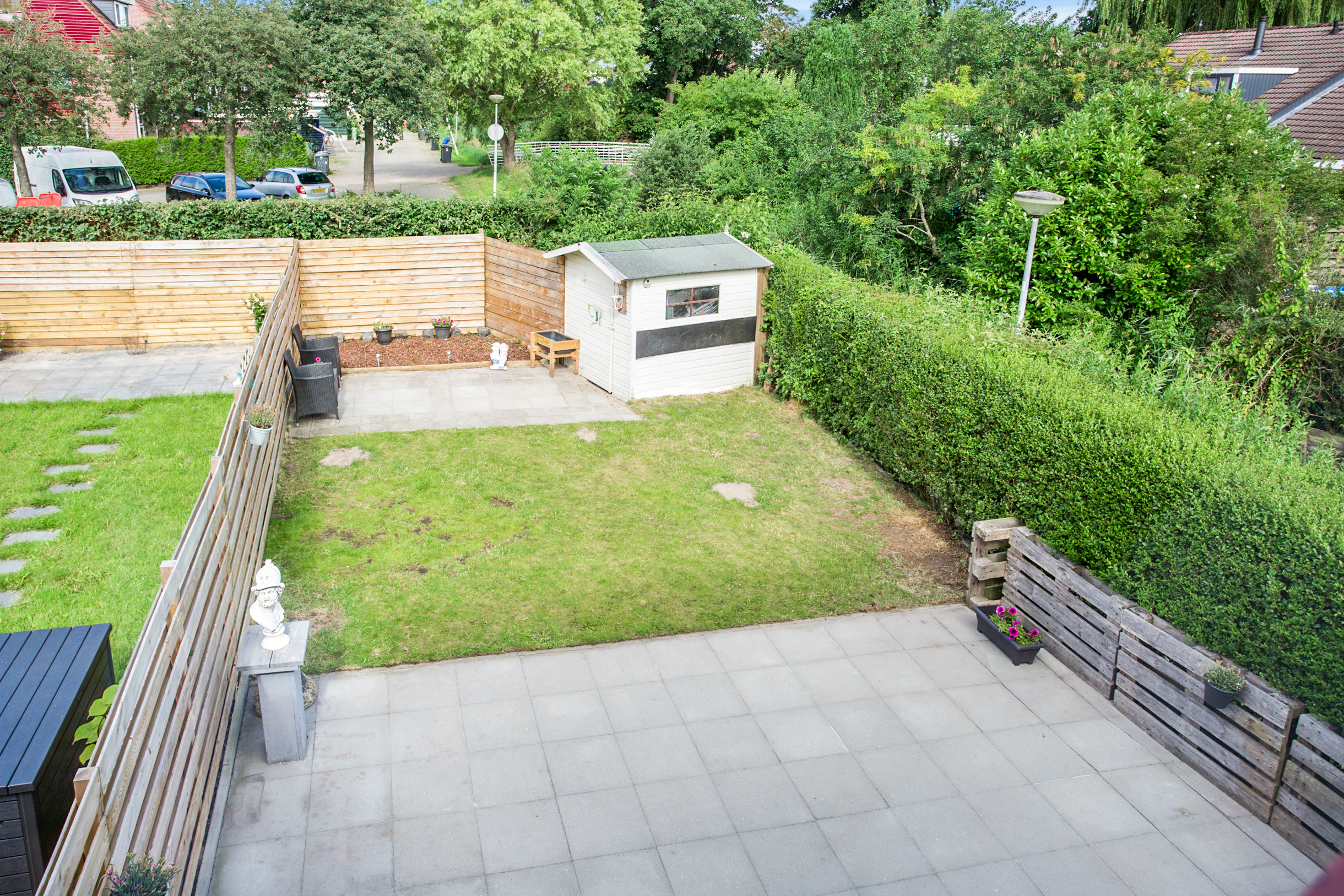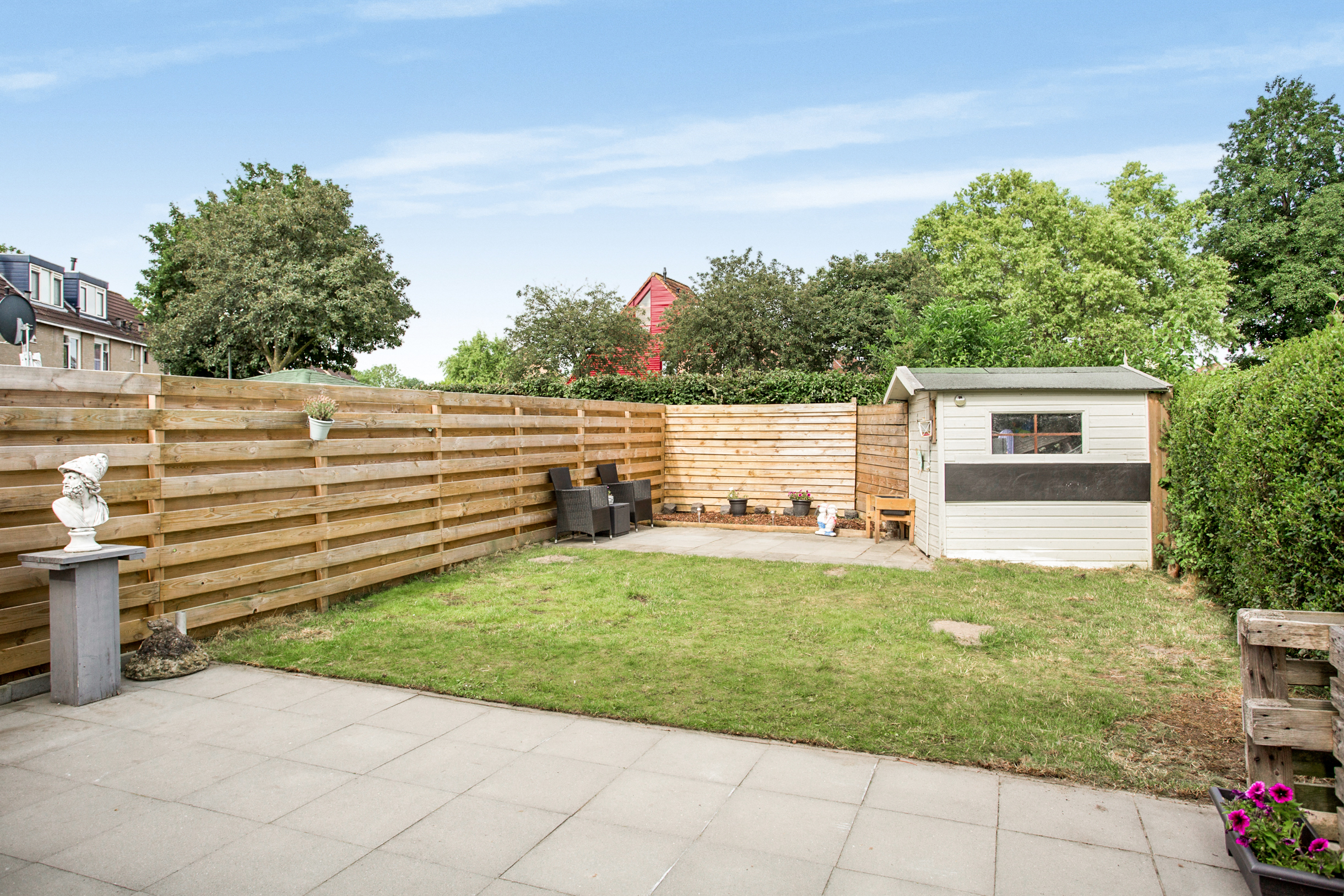 Ruime, diepe en zonnige achtertuin op het westen met veel middag- en avondzon welke