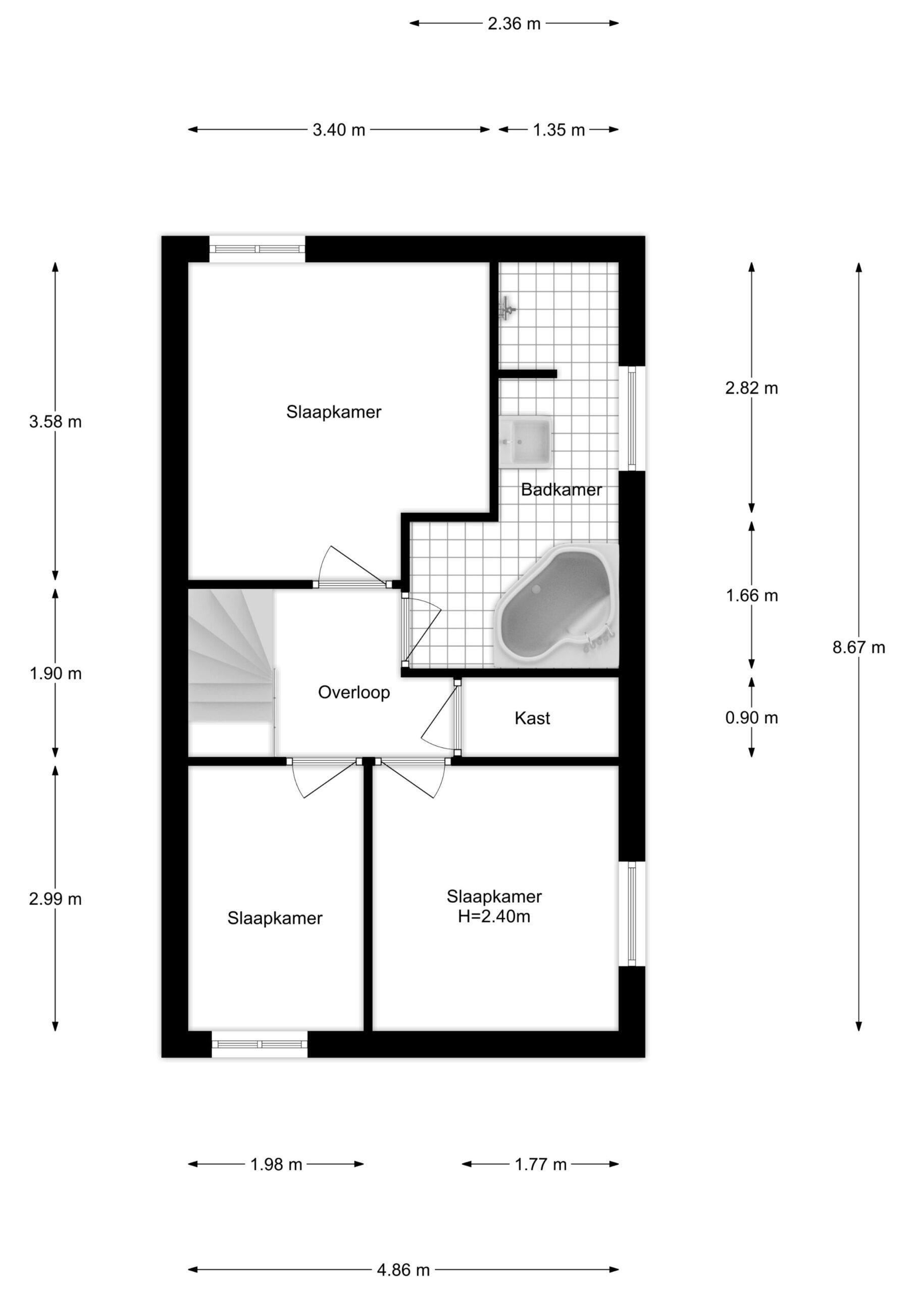 Overloop met toegang tot 3 ruime slaapkamers (ca. 11 m², 6 m² en 8 m²) en de badkamer.