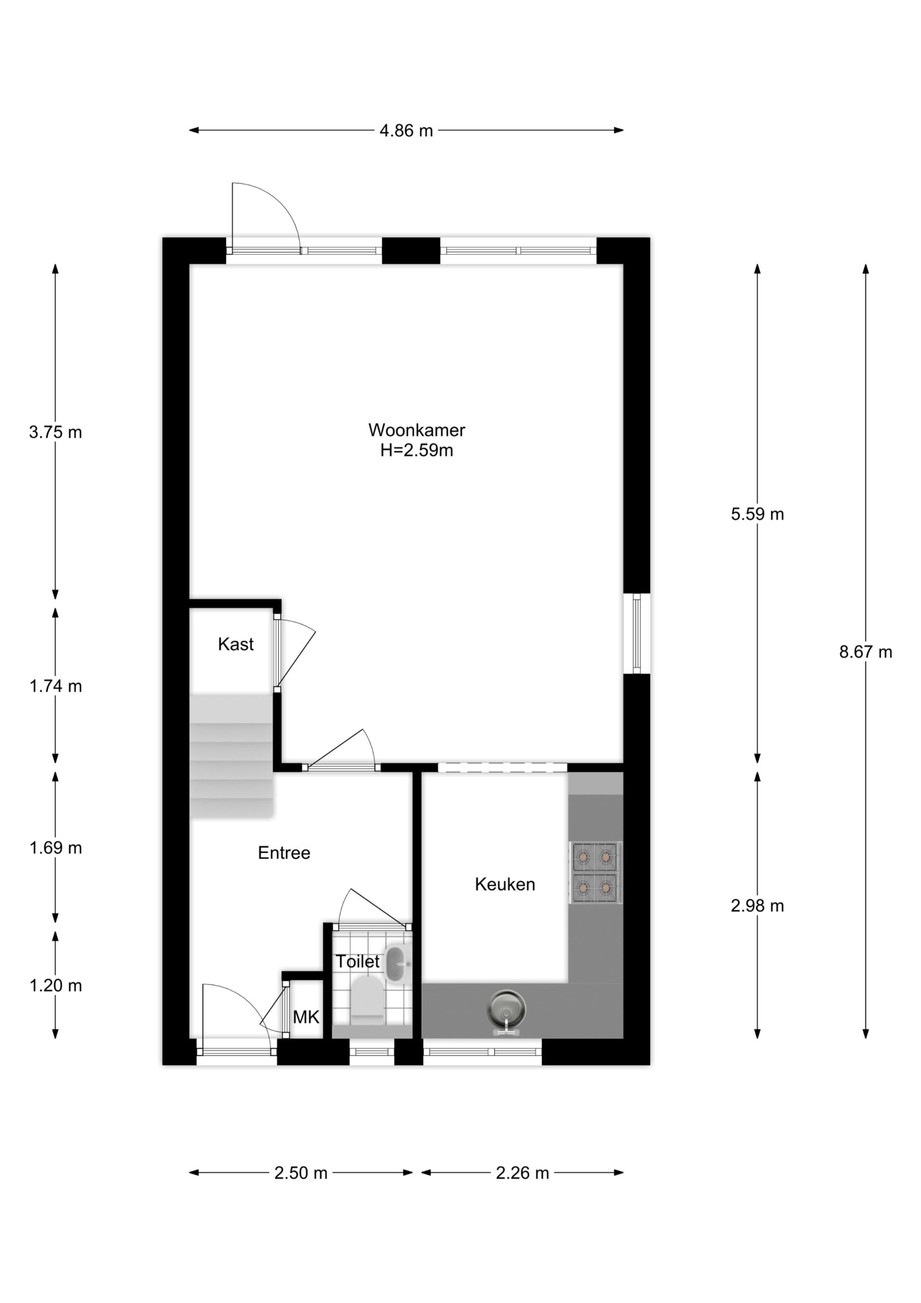 trapkast. Aan de voorzijde bevindt zich de open keuken. De moderne open keuken is