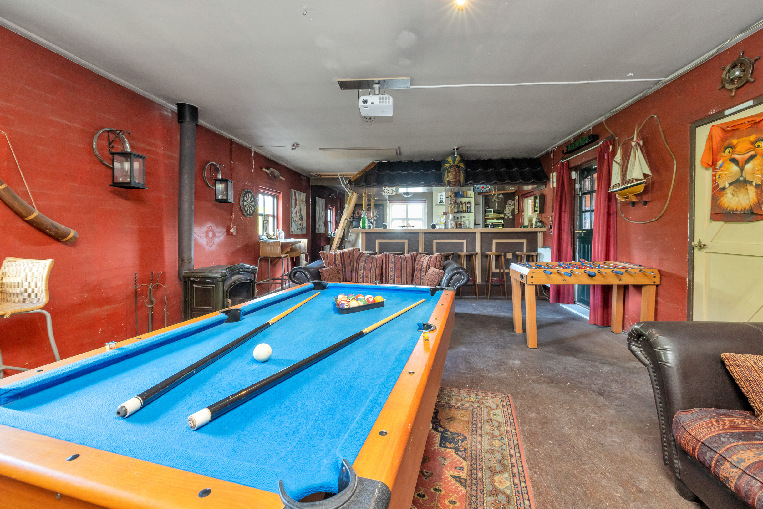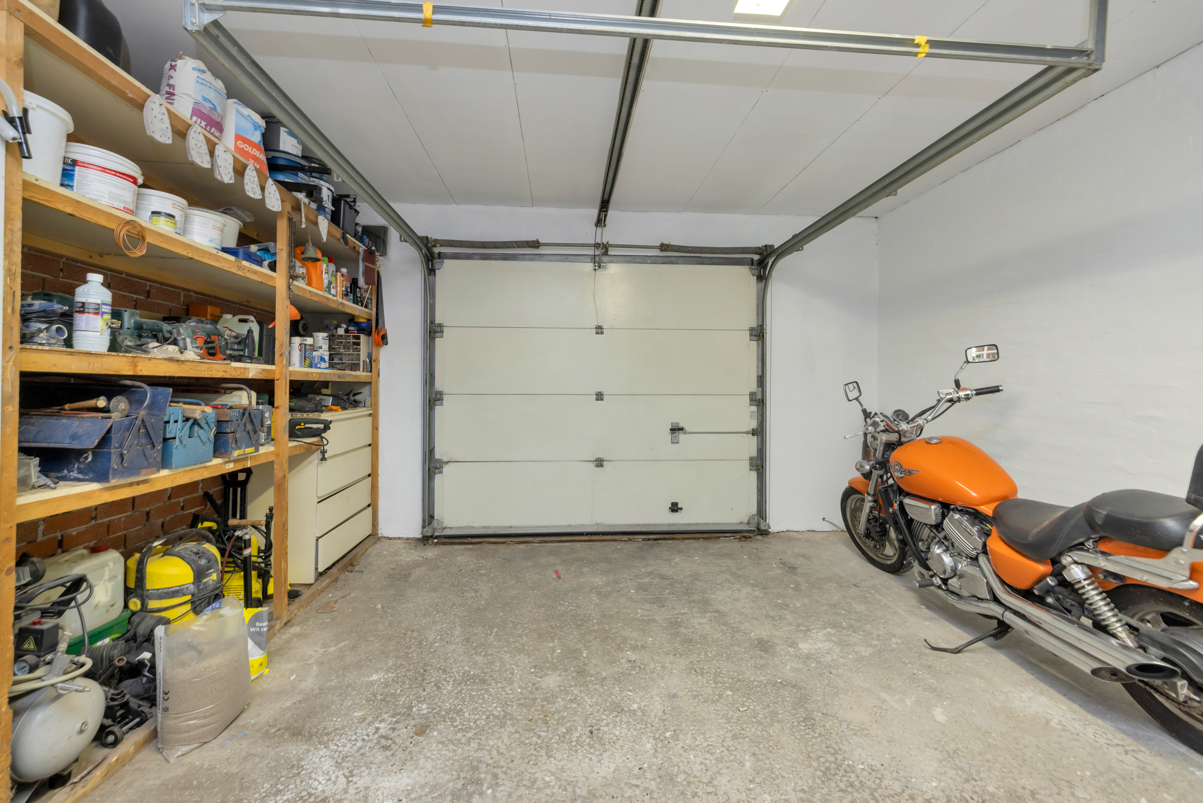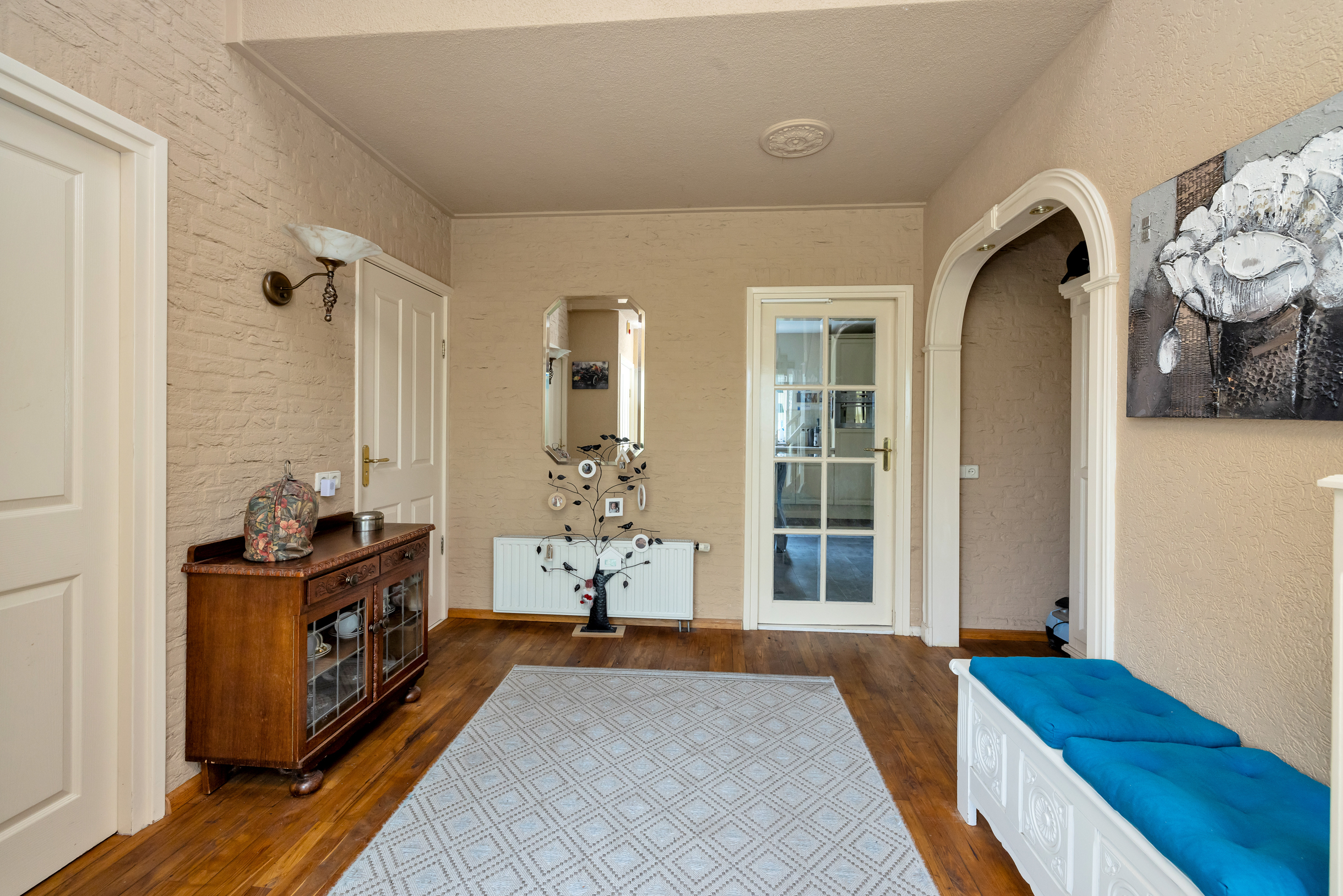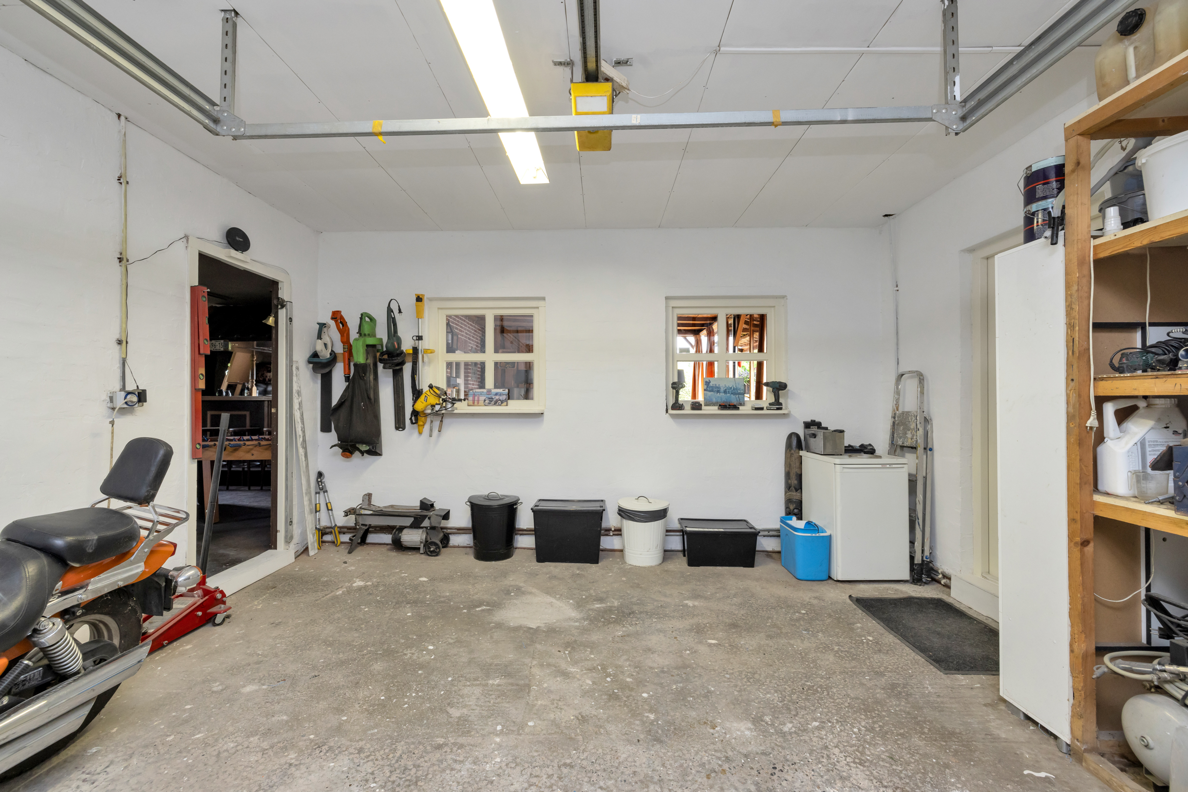 Naast de aangebouwde garage ligt een royale vrijstaande garage (ca. 5,06 x 9,09 m), geschikt voor meerdere auto’s of hobbyruimte. Links van de hal is een slaapkamer, ideaal voor gelijkvloers wonen of als kantoor/praktijkruimte.