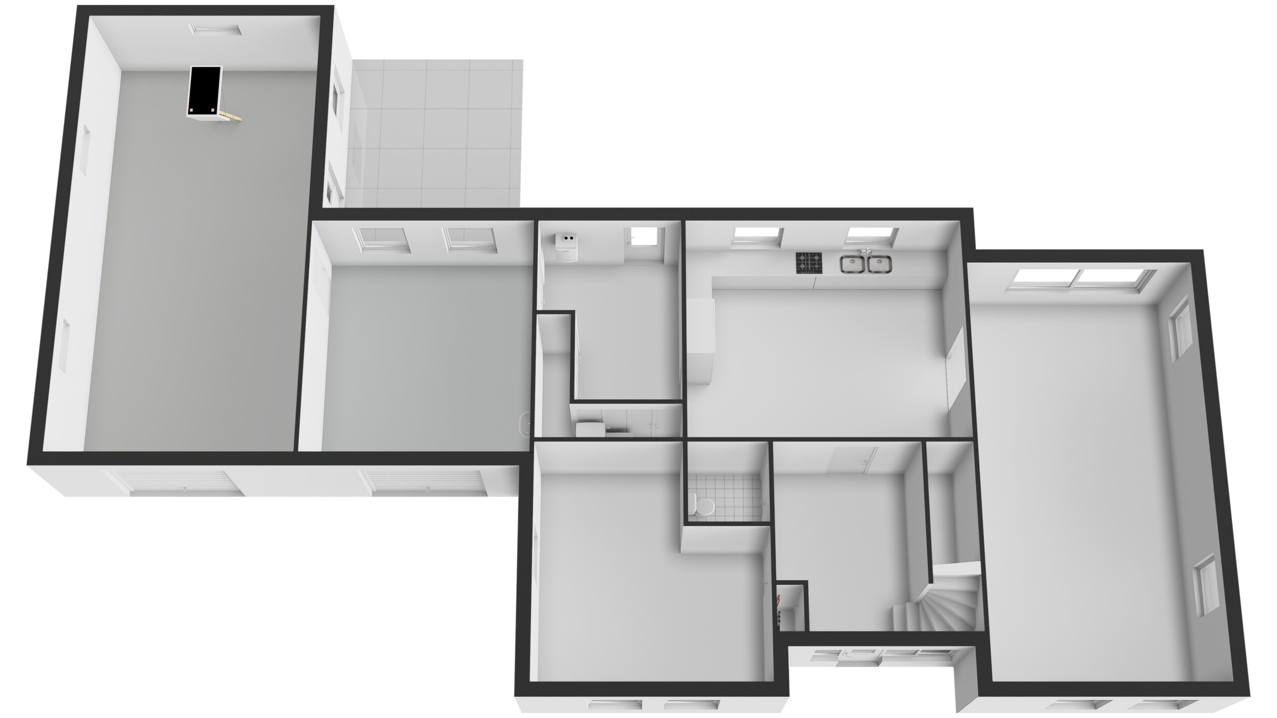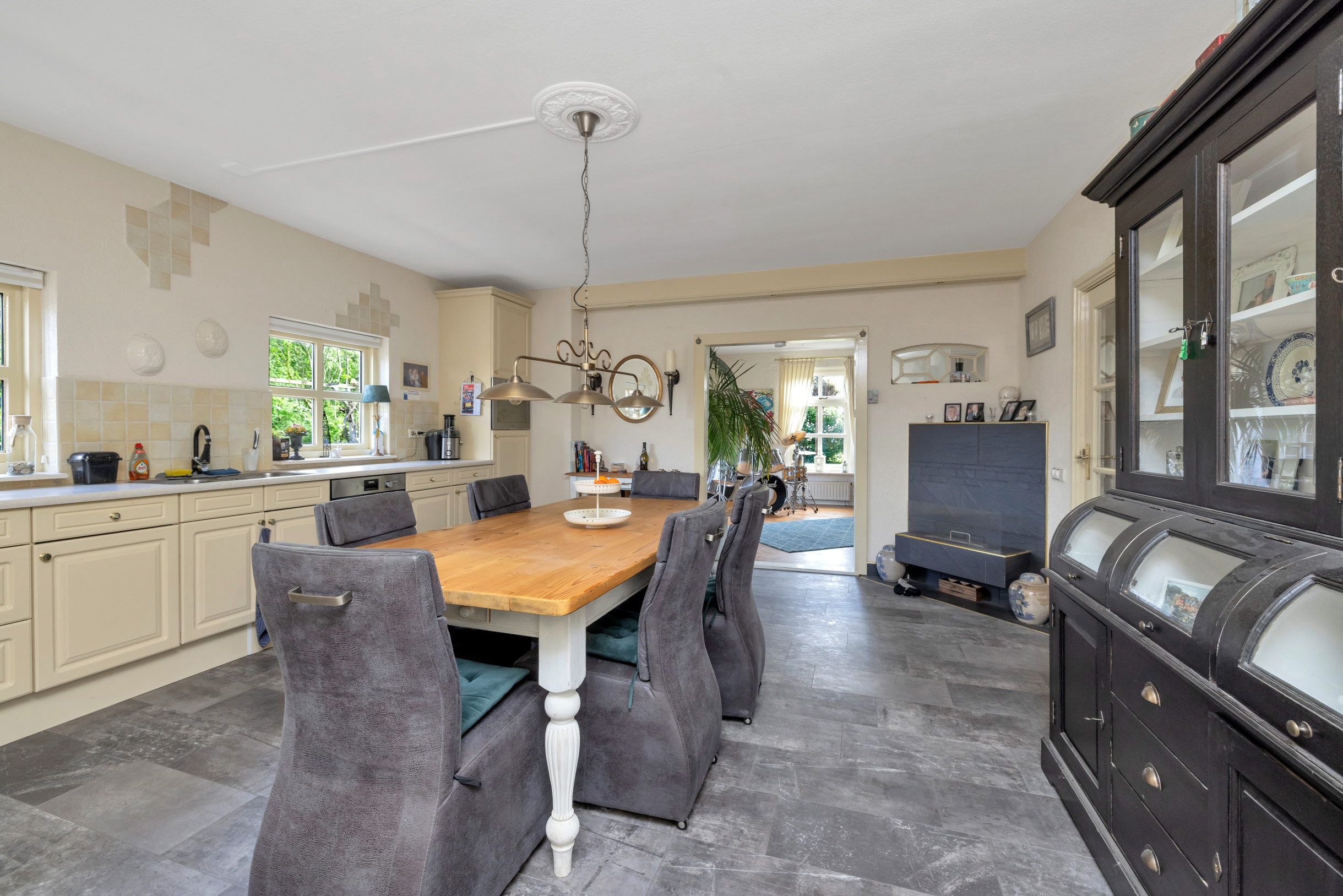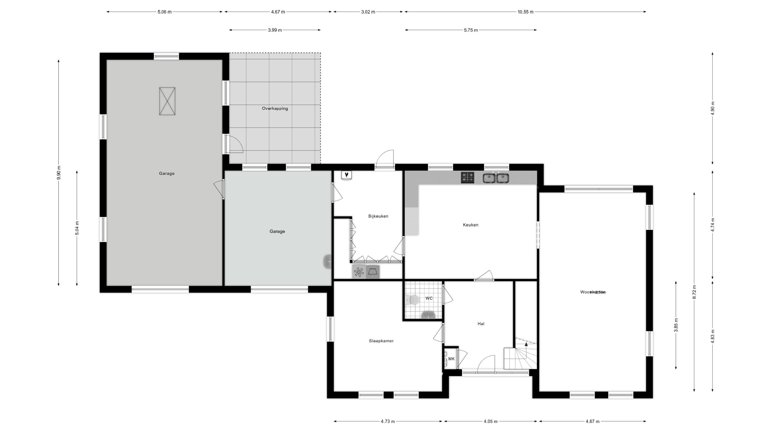 Via de voordeur kom je in een ruime hal met trap, meterkast en toilet. Rechts ligt de lichte woonkamer (ca. 38 m²) met grote ramen en ruimte voor een zit- en eethoek. Aansluitend vind je de open keuken (ca. 5,75 m breed) met dubbele spoelbakken en zicht op de tuin. De bijkeuken, met wasmachineaansluiting en extra bergruimte, grenst aan de keuken en garage. Vanuit hier bereik je de overkapping in de tuin.