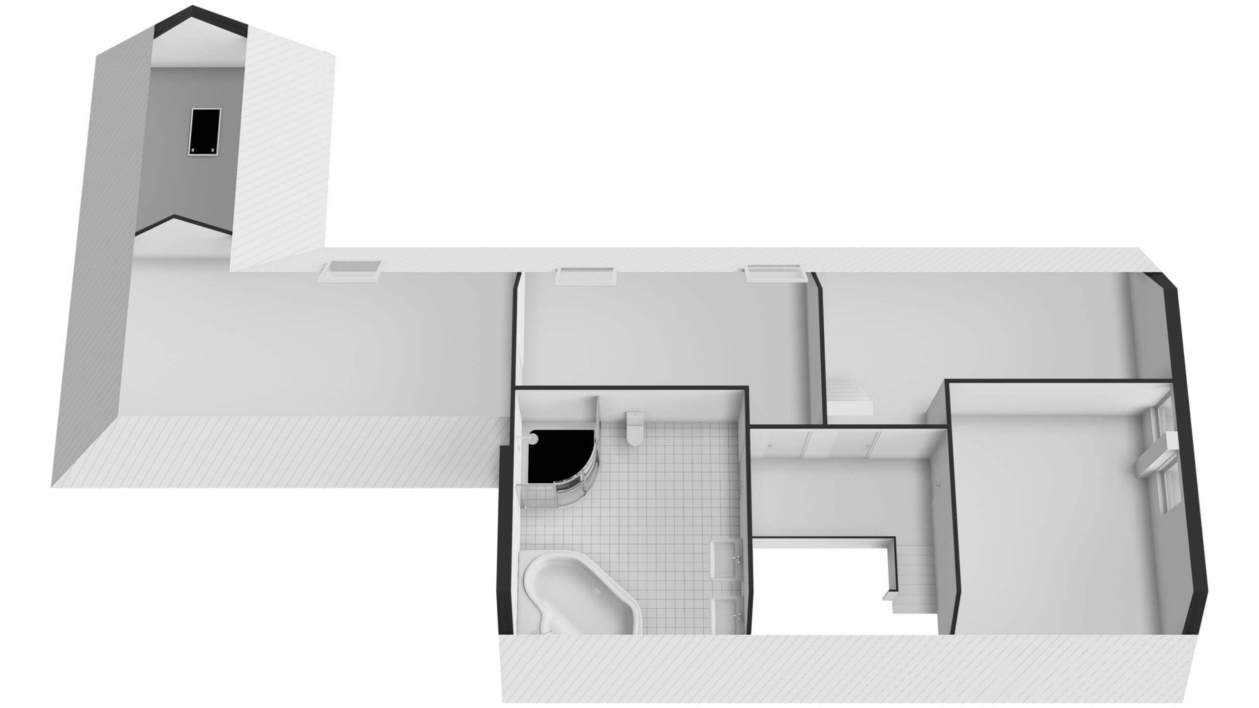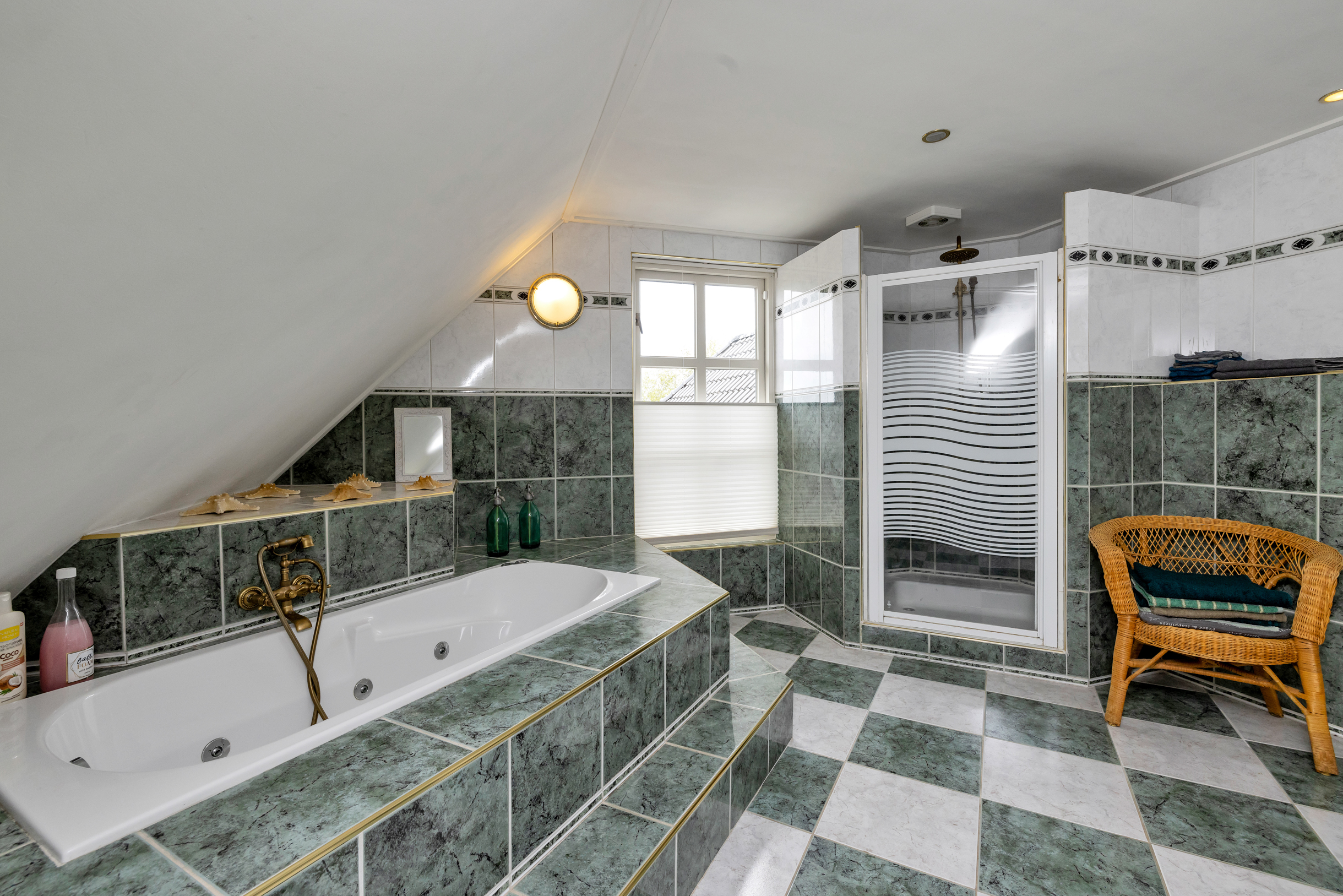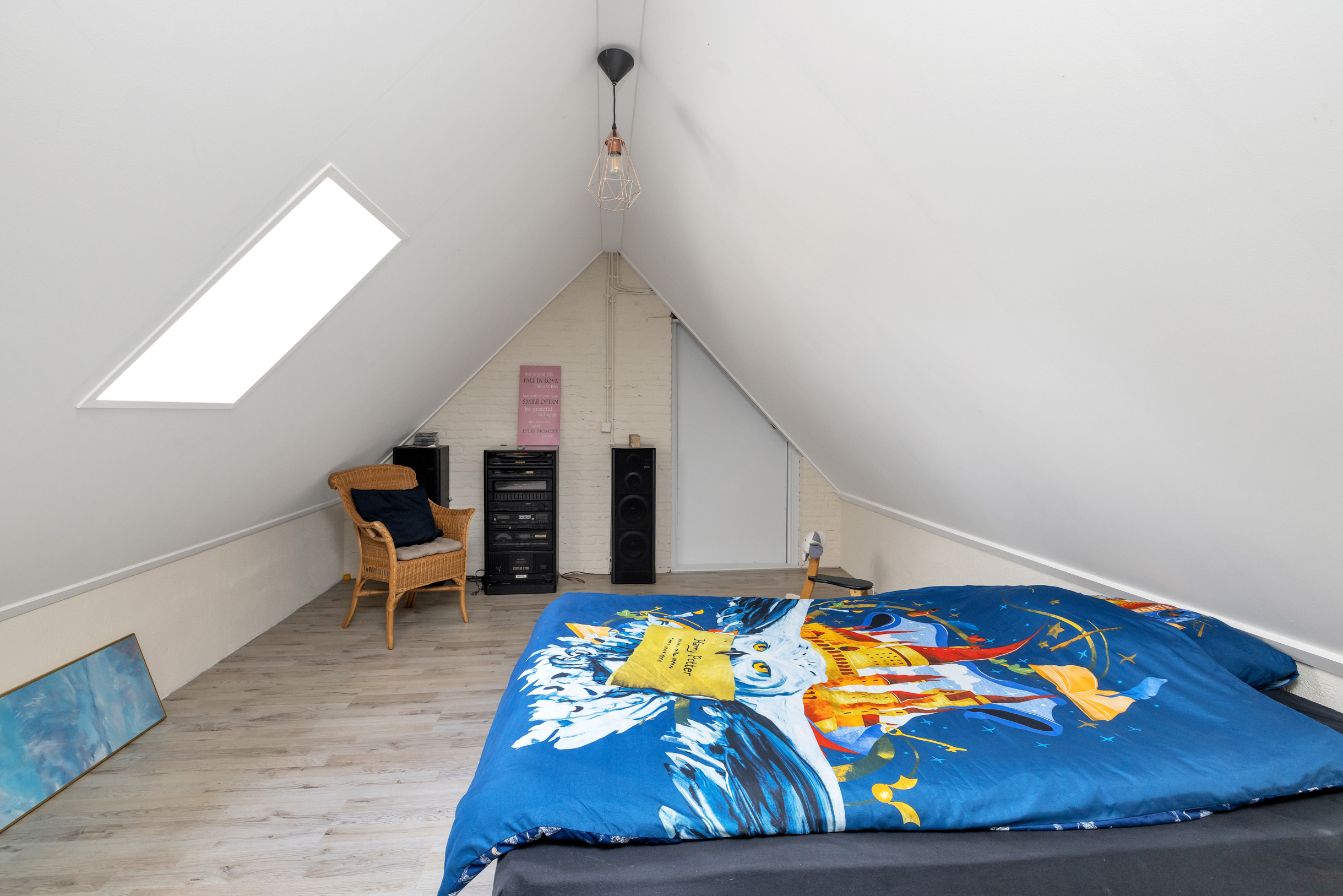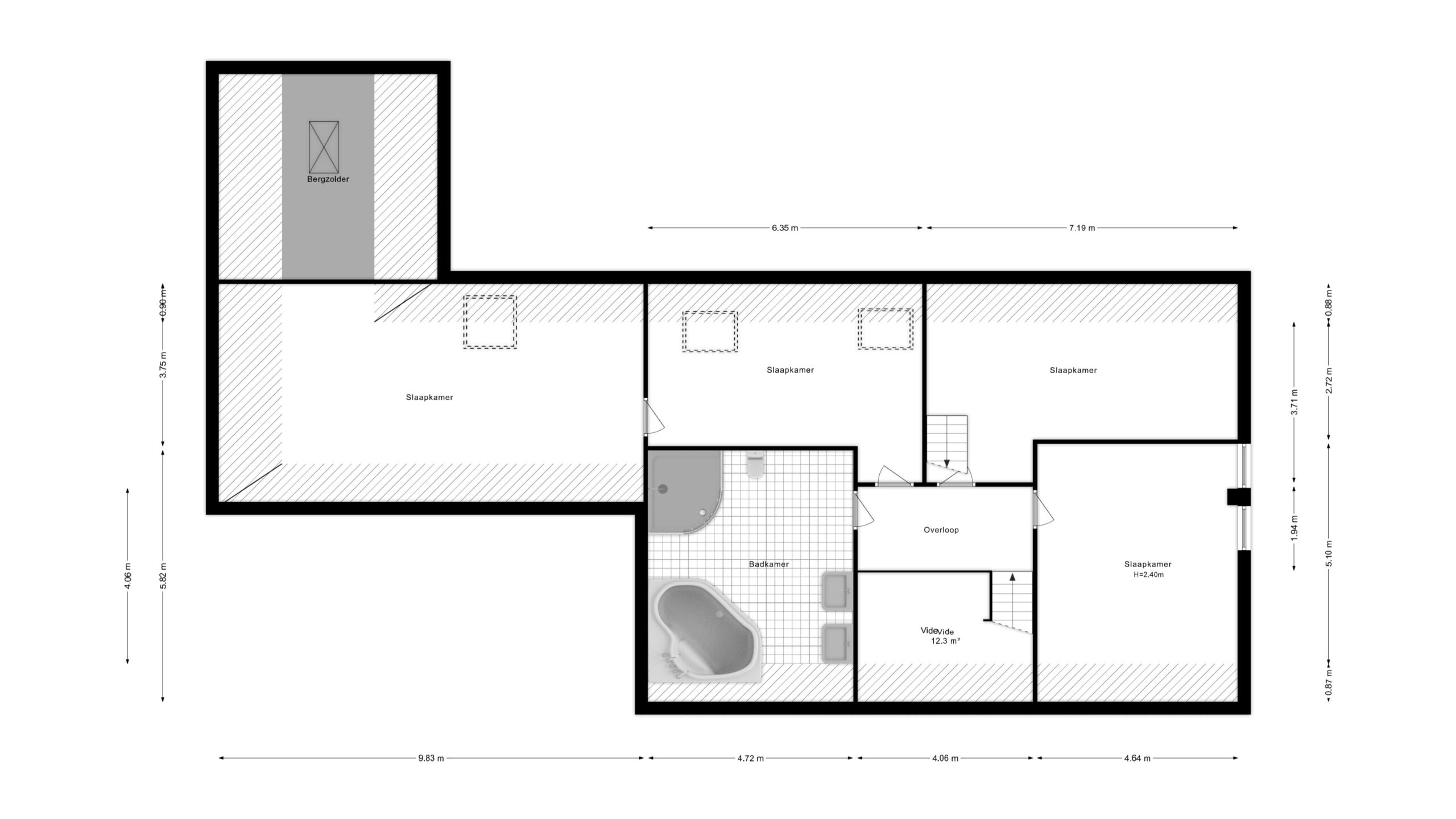 Op de verdieping bevinden zich vier ruime slaapkamers en een royale badkamer met ligbad, douche, dubbele wastafel en toilet. De grootste kamer (ca. 4,64 x 5,10 m) is ook geschikt als werk- of speelkamer. Een tweede grote kamer (ca. 3,71 x 7,19 m) biedt veel licht en flexibiliteit. Achterin liggen twee slaapkamers met schuine wanden en bergruimte. Eén kamer geeft toegang tot de bergzolder. De vide (ca. 12,3 m²) zorgt voor een ruimtelijk effect en verbindt visueel met de hal beneden.