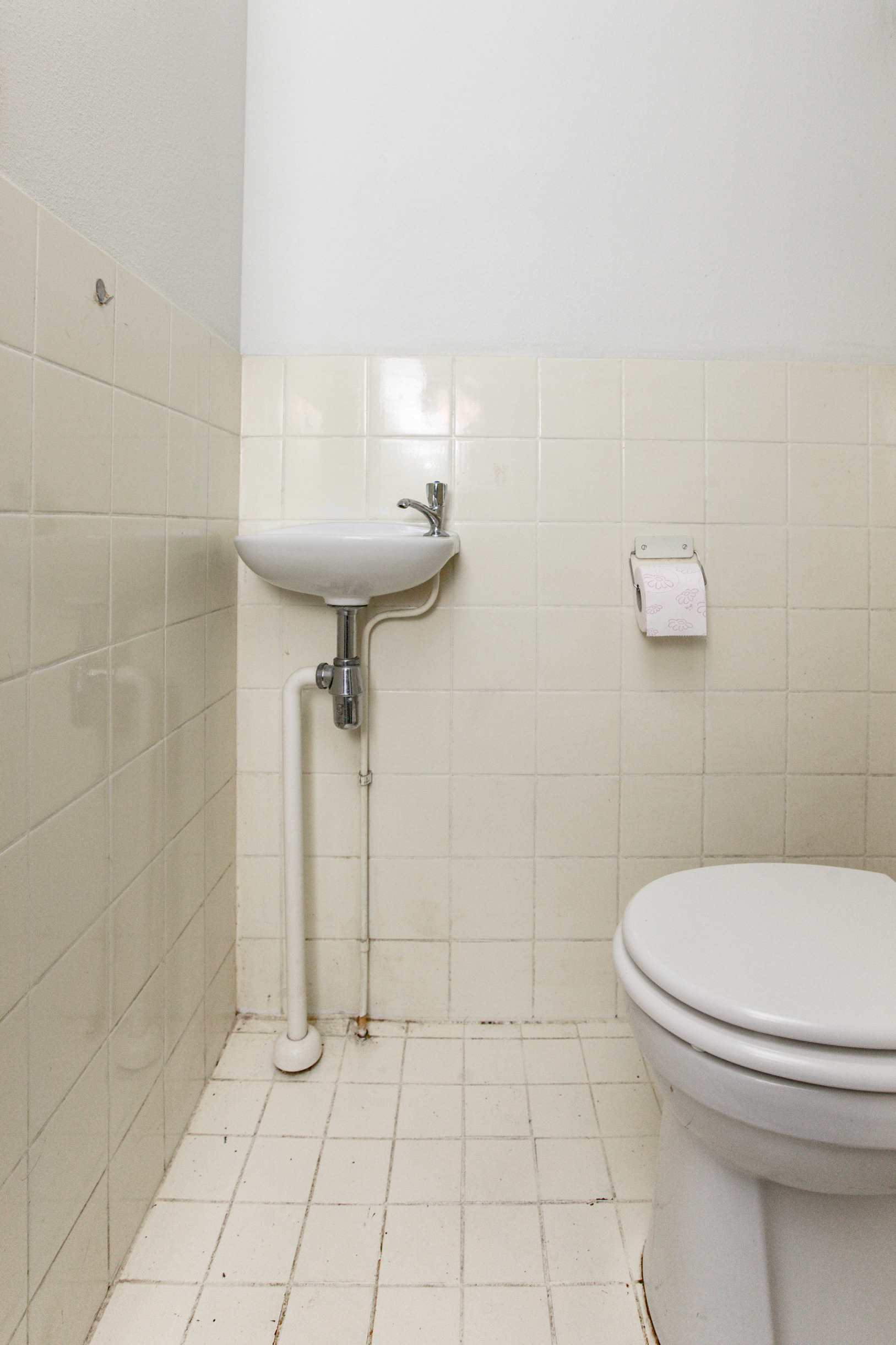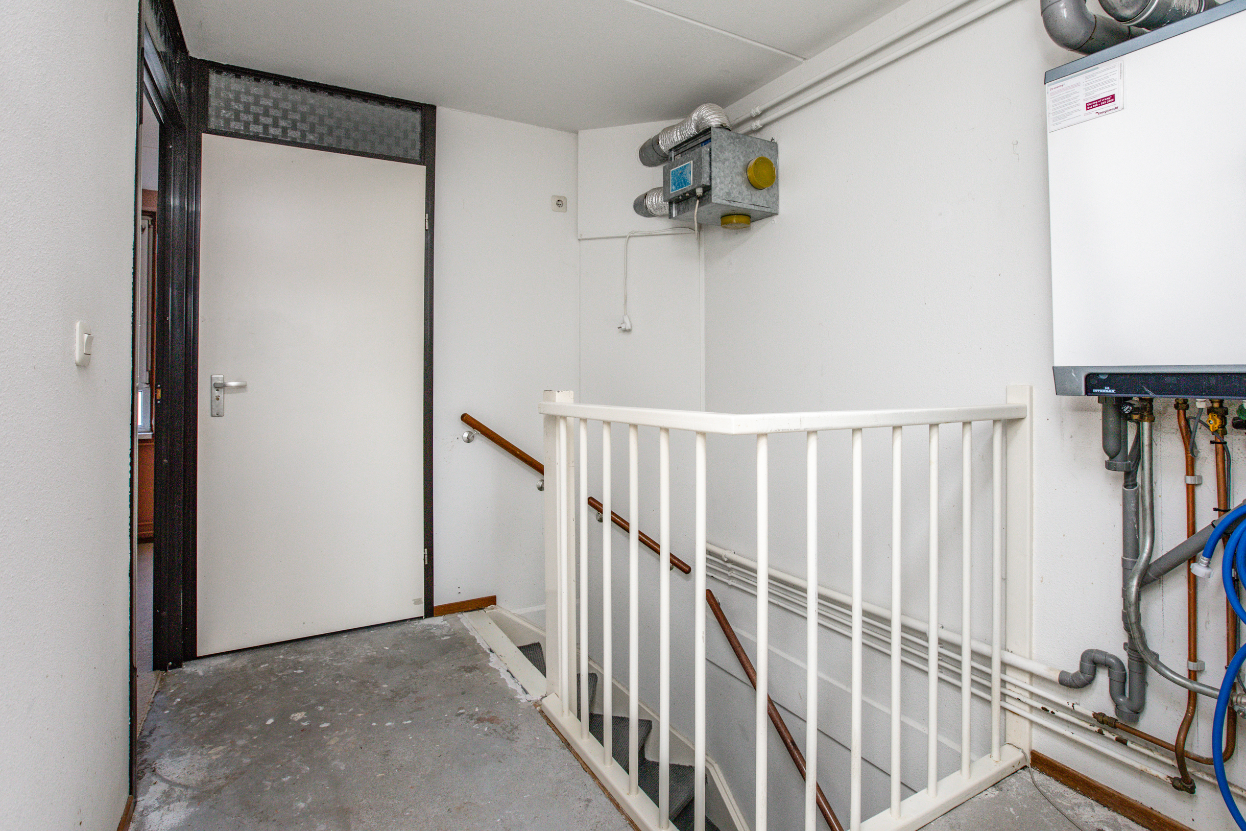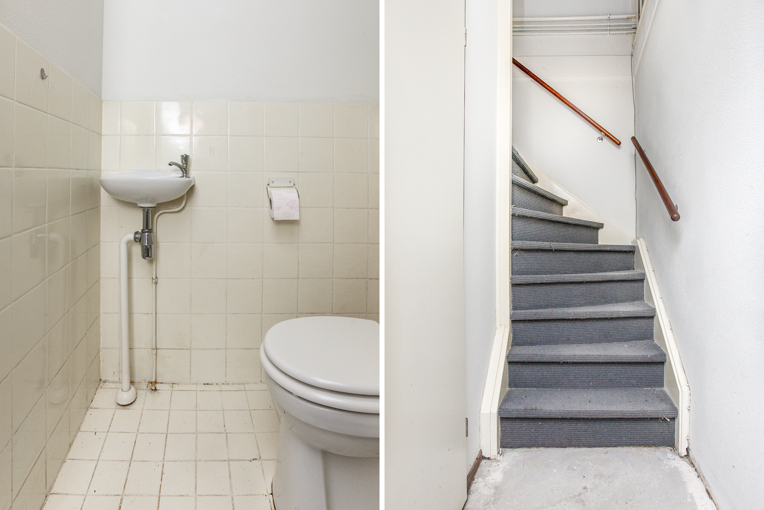 Tussenhal met toiletruimte met fonteintje en trapopgang naar de 1e verdieping.