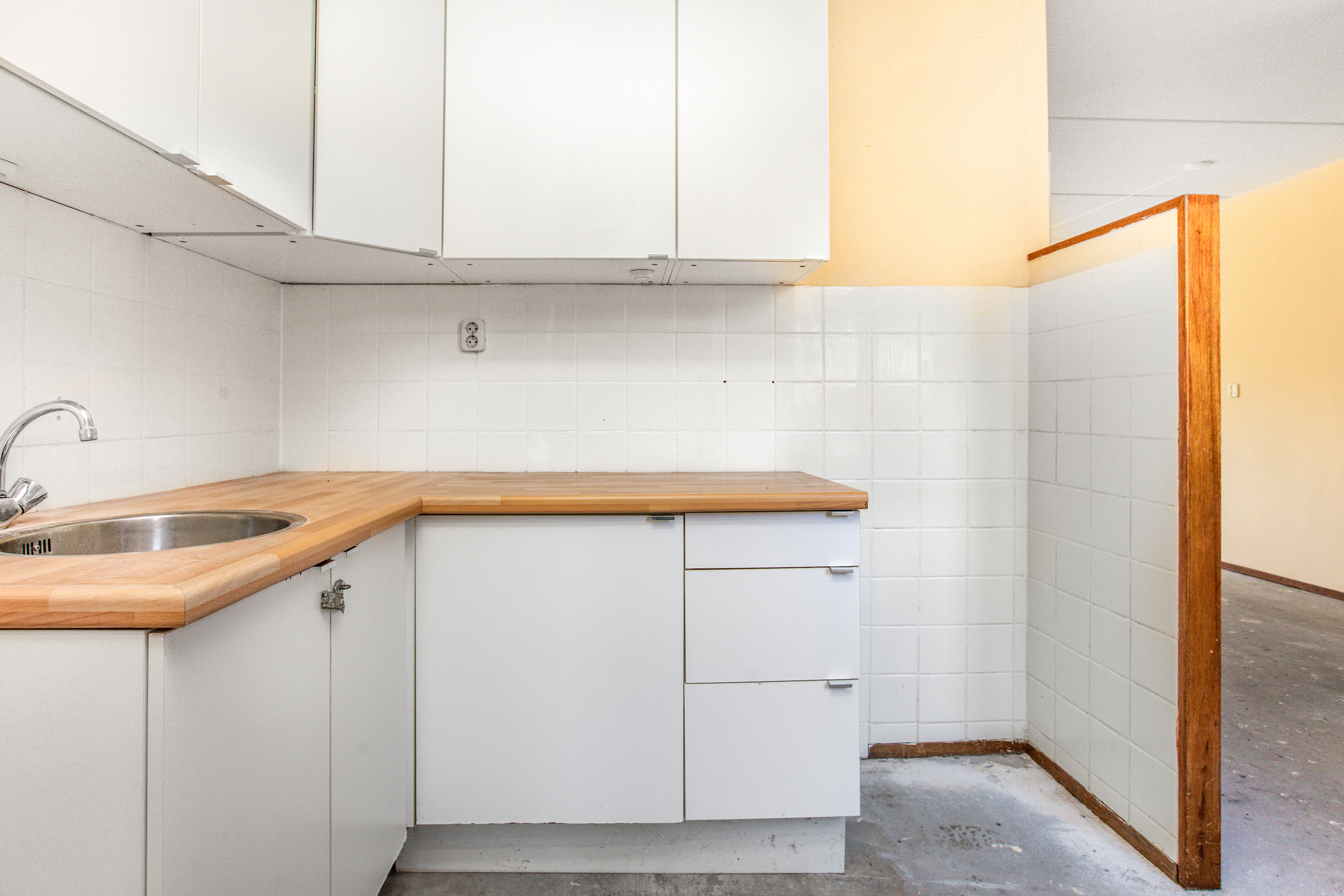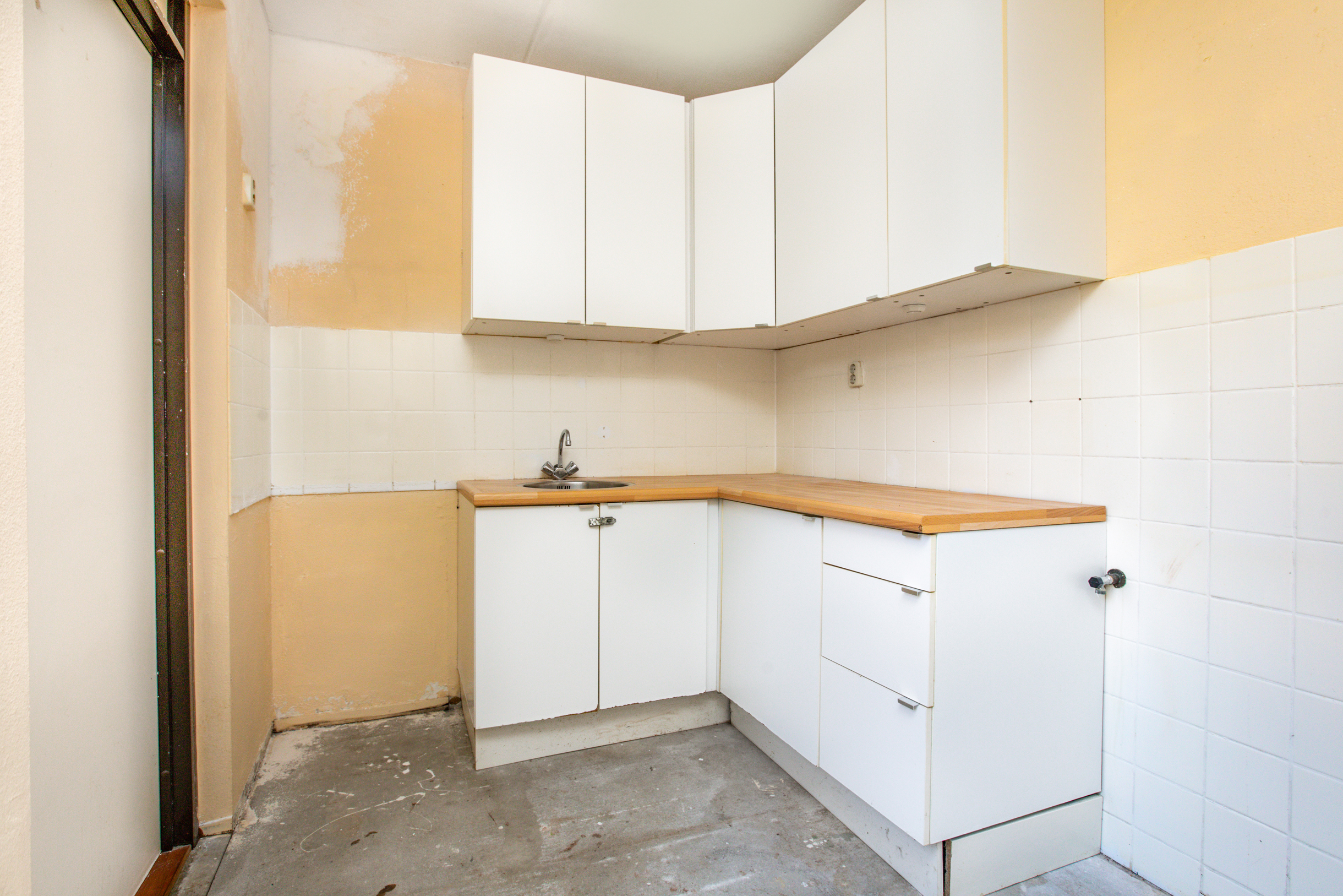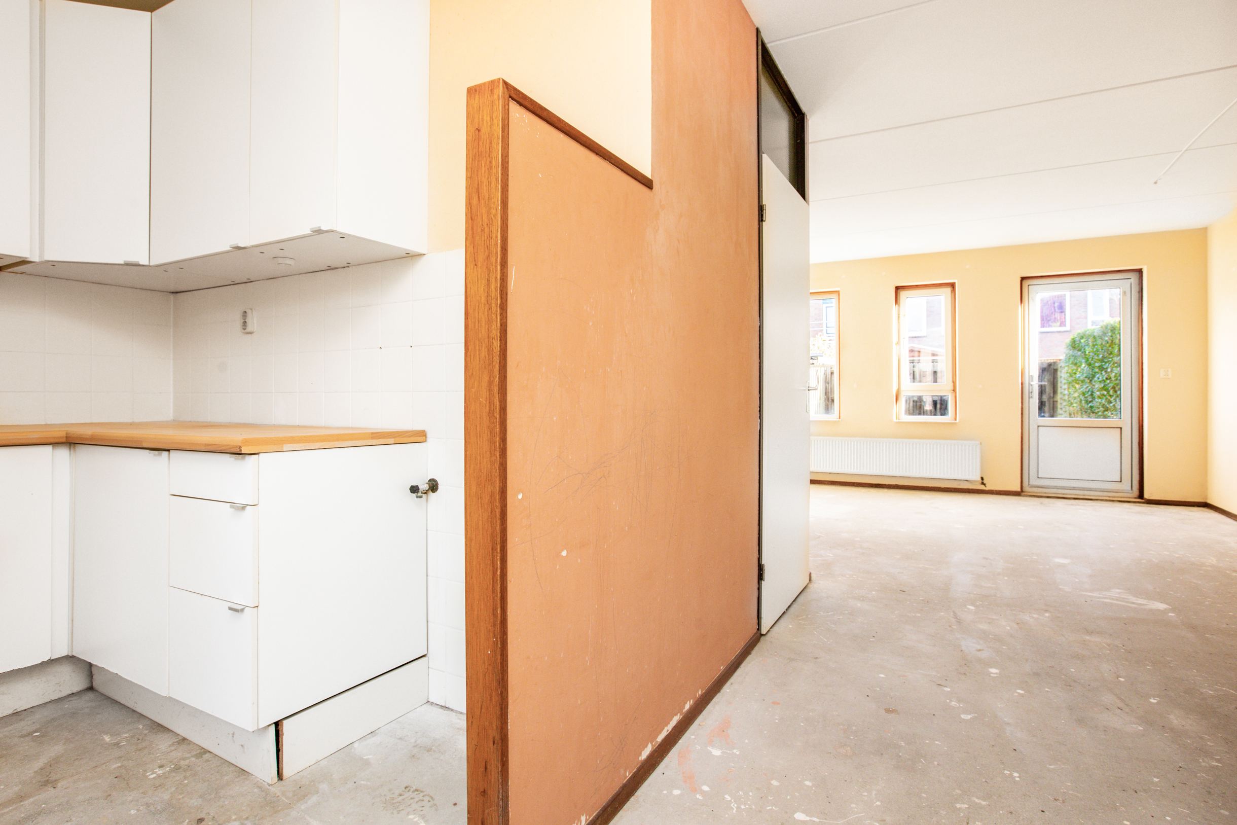 Ruime en tuingerichte woon-/eetkamer met aan de voorzijde de halfopen keuken. De keuken is op dit moment voorzien van een keukenblok in hoekopstelling met onder- en bovenkastjes en een spoelbak. Vanuit de keuken is de inpandige berging/bijkeuken te bereiken. Deze ruimte is voorzien van elektra en is eveneens vanaf buiten te bereiken.