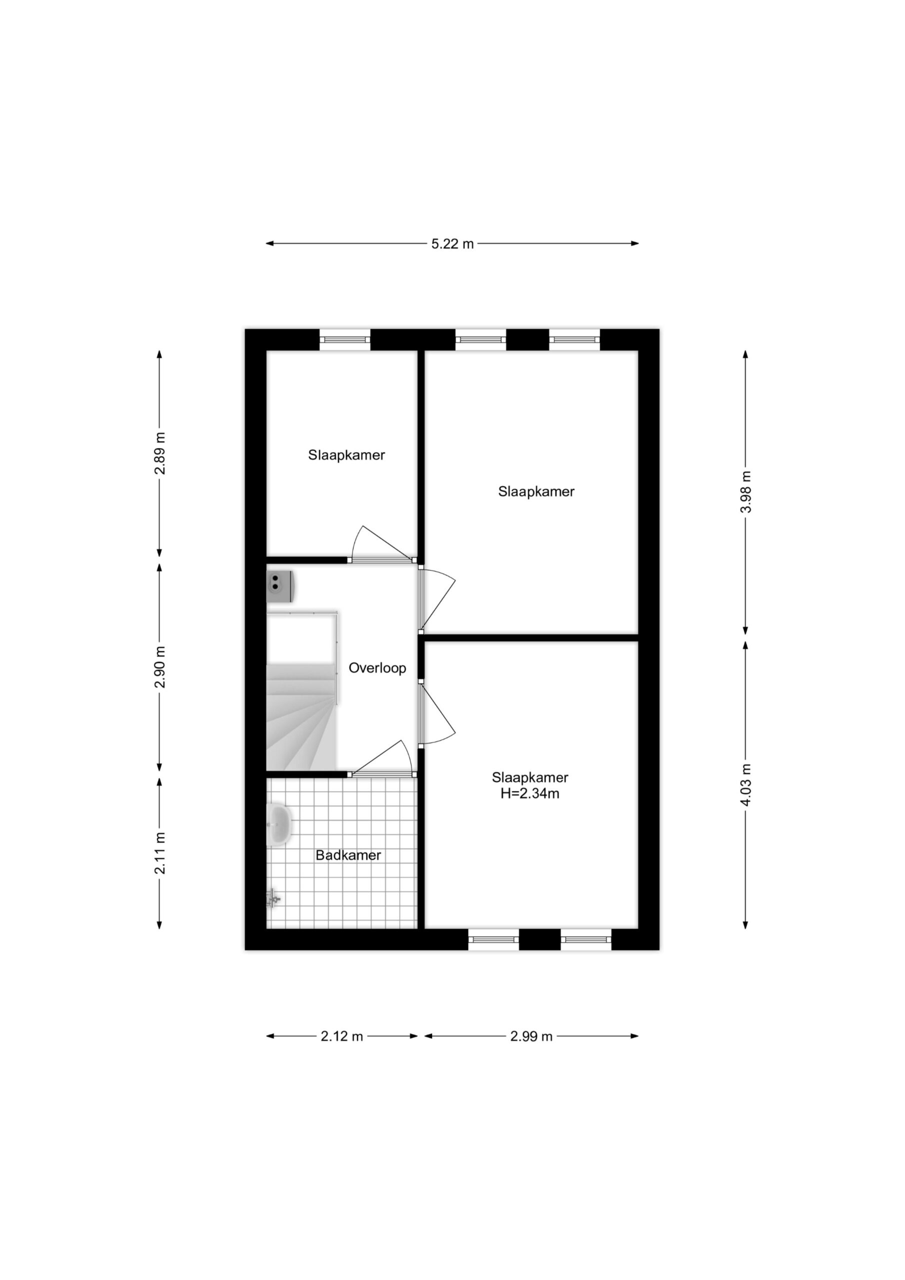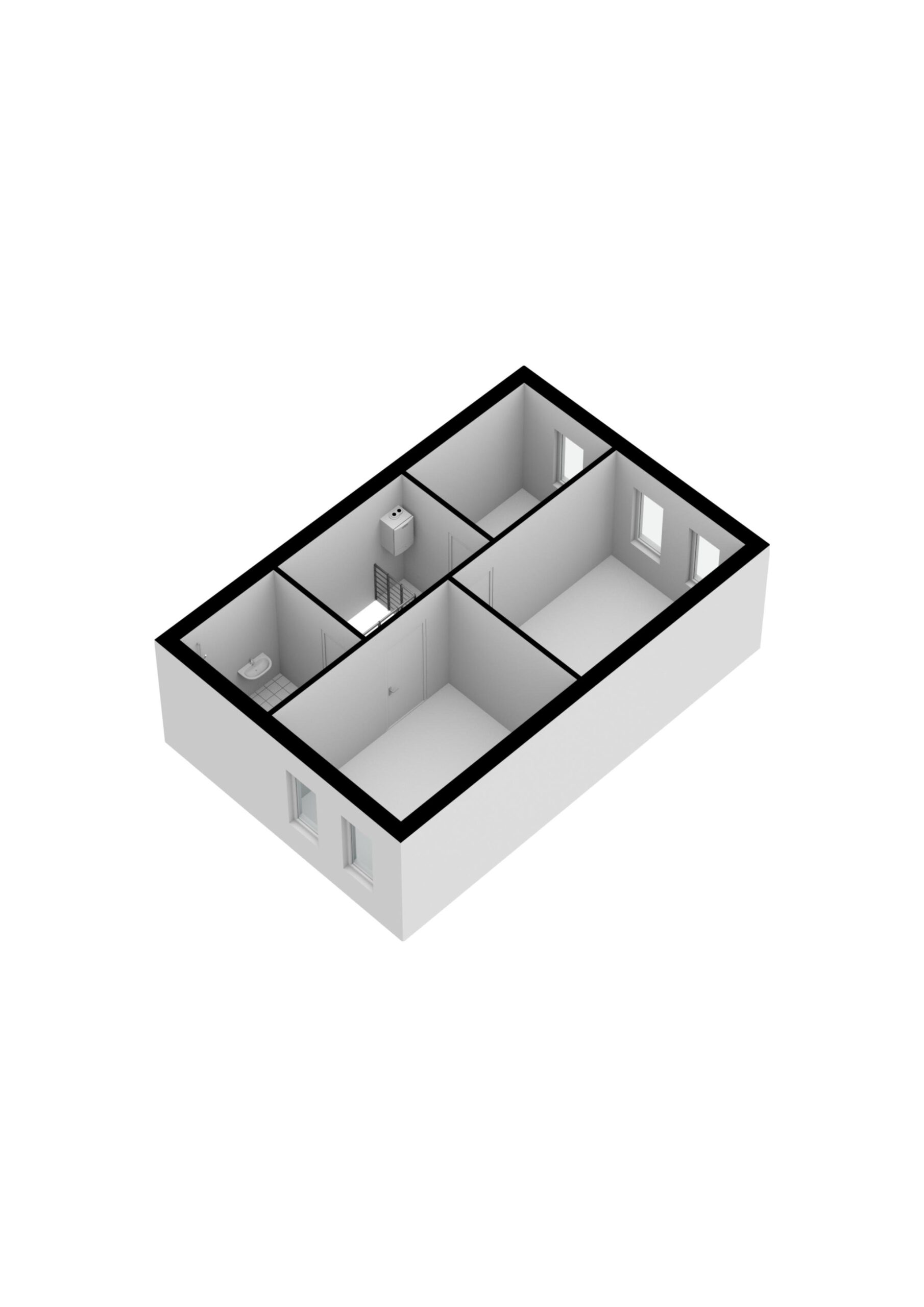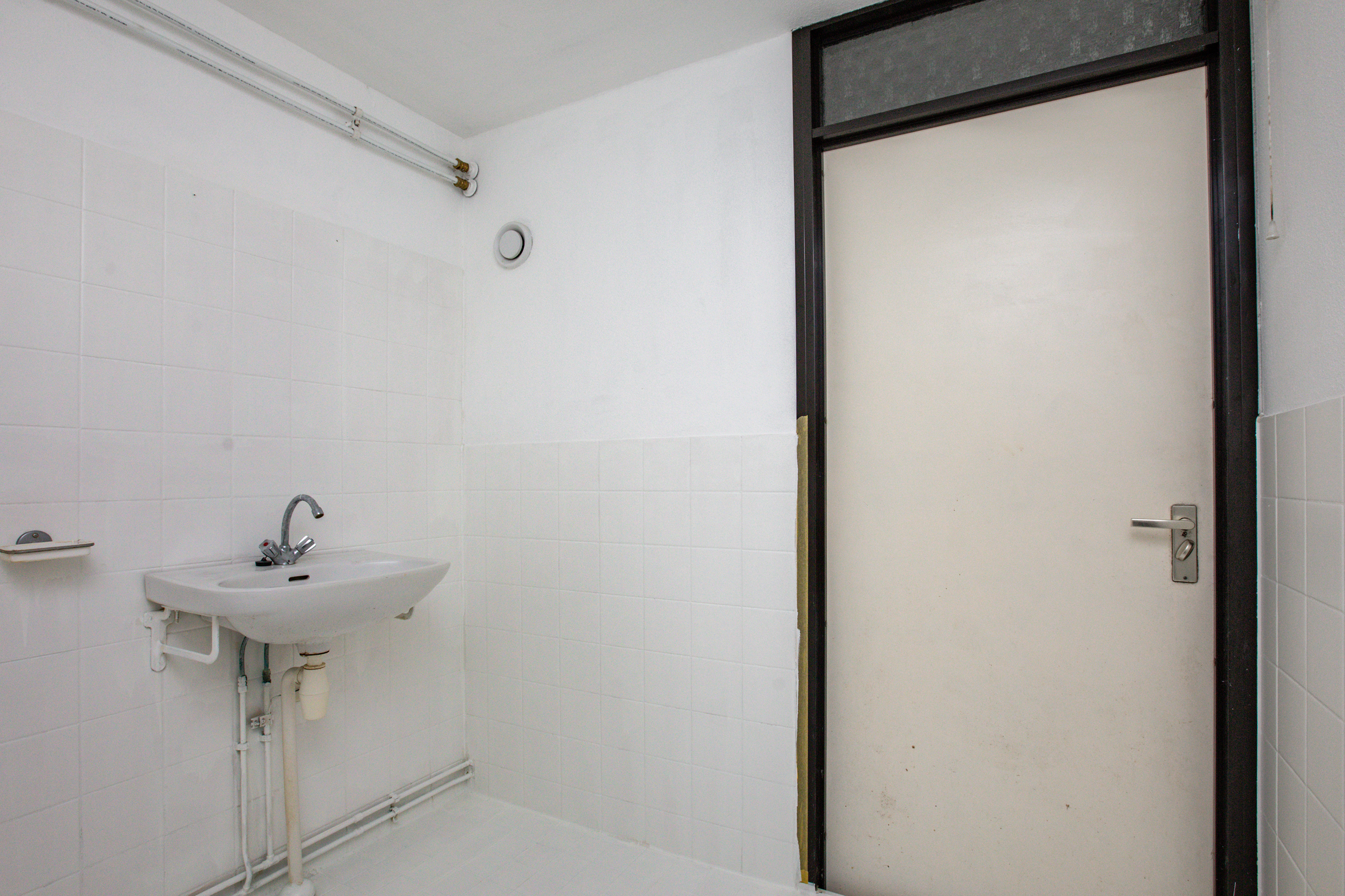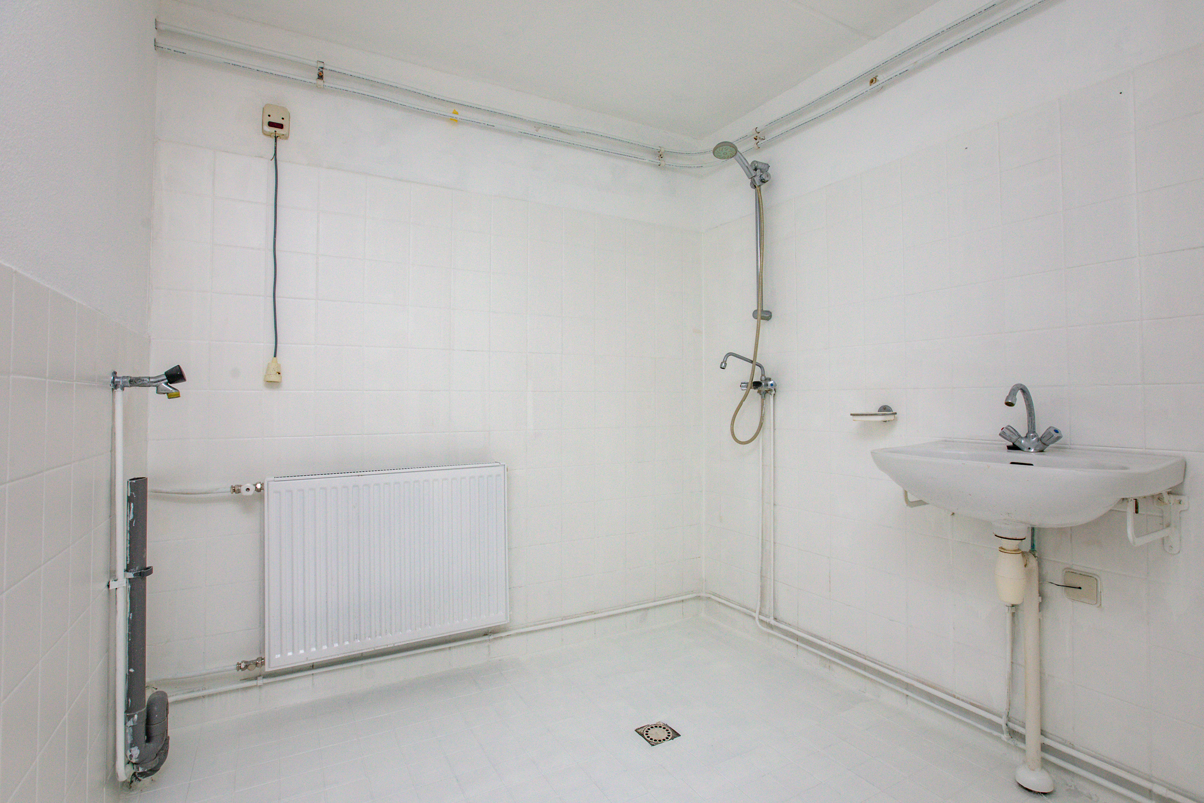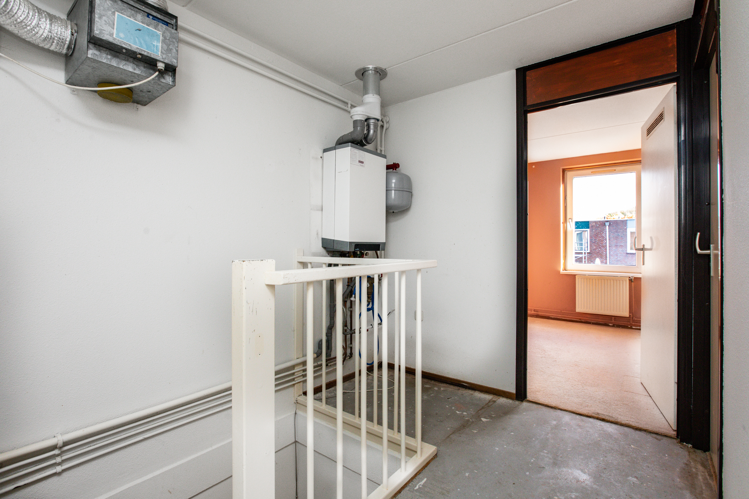 Overloop met opstelling CV-ketel en toegang tot 3 ruime slaapkamers en de badkamer. De badkamer is voorzien van een wastafel, douche, radiator en wasmachineaansluiting.
