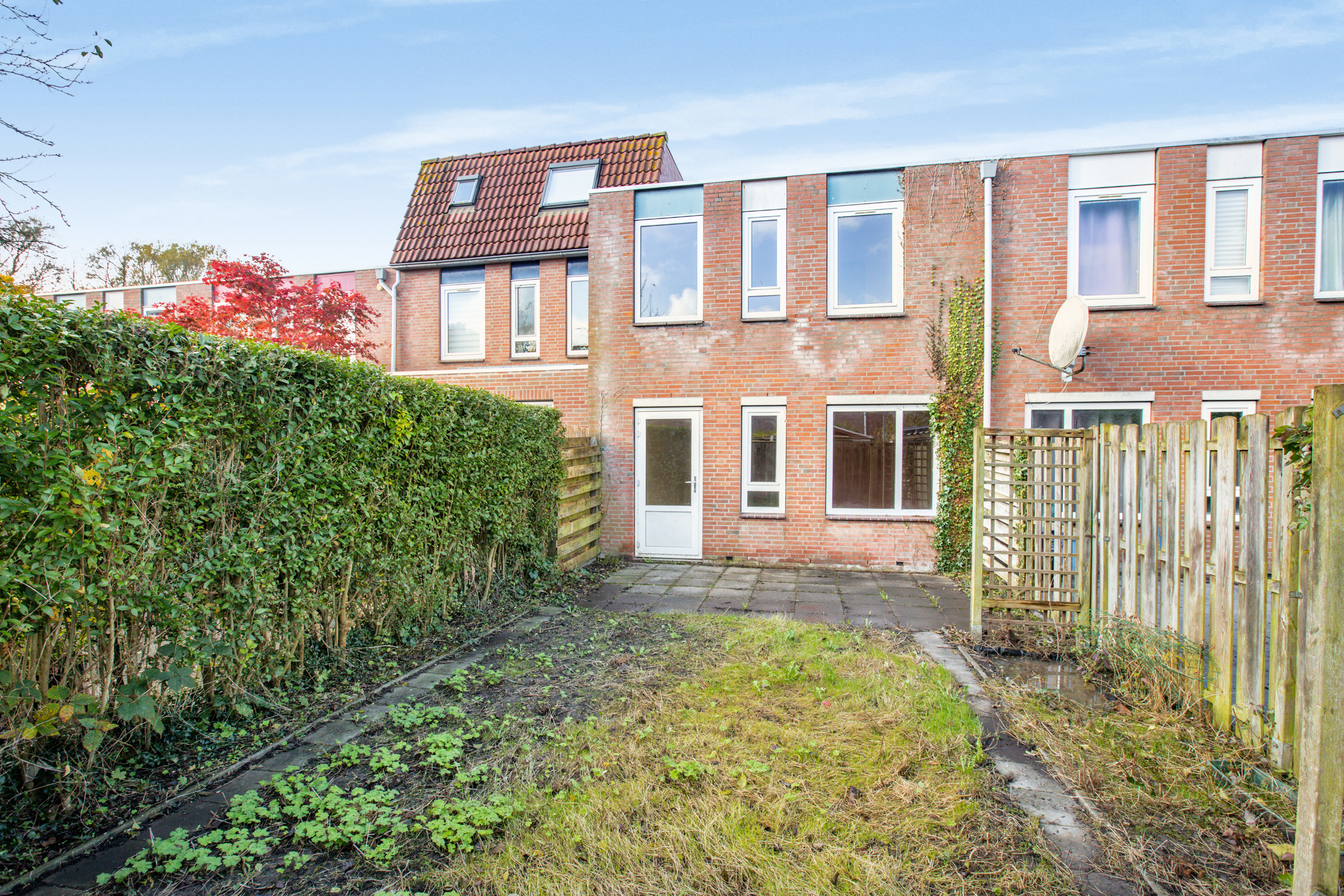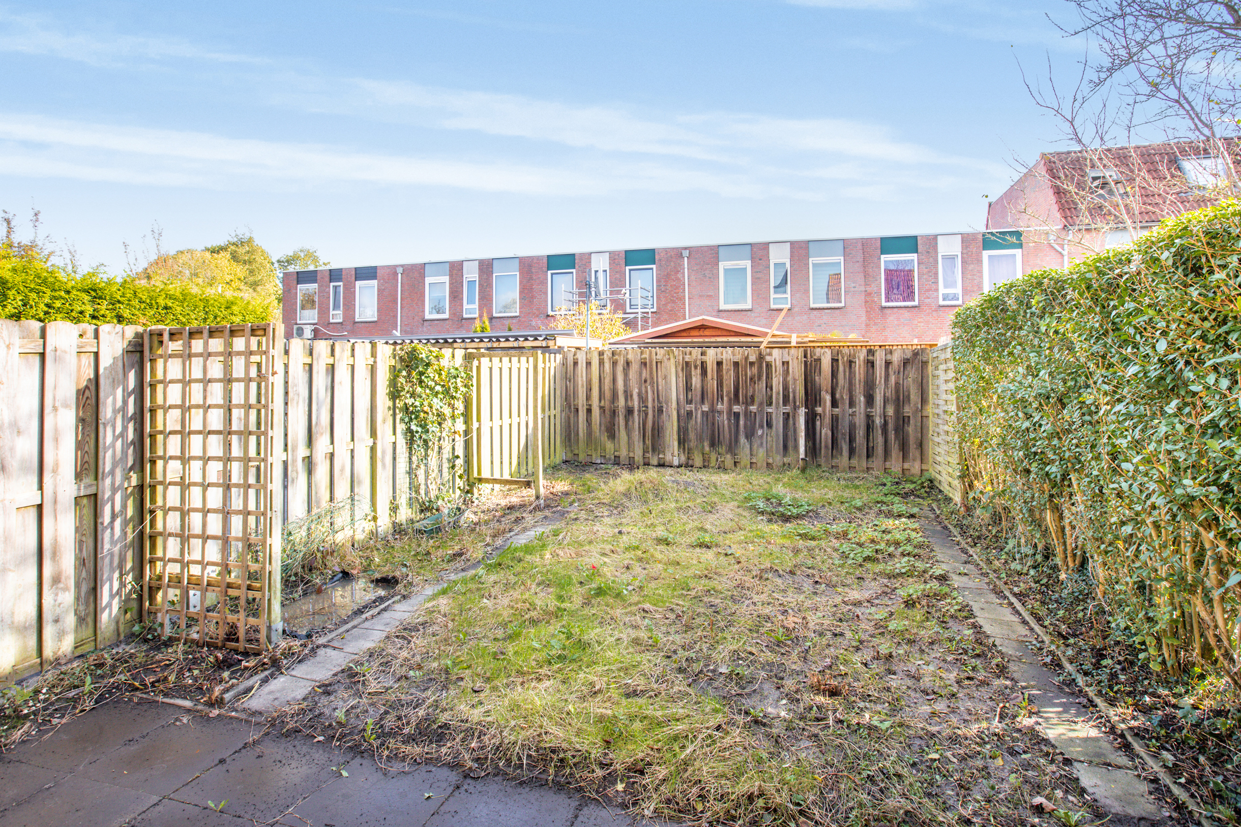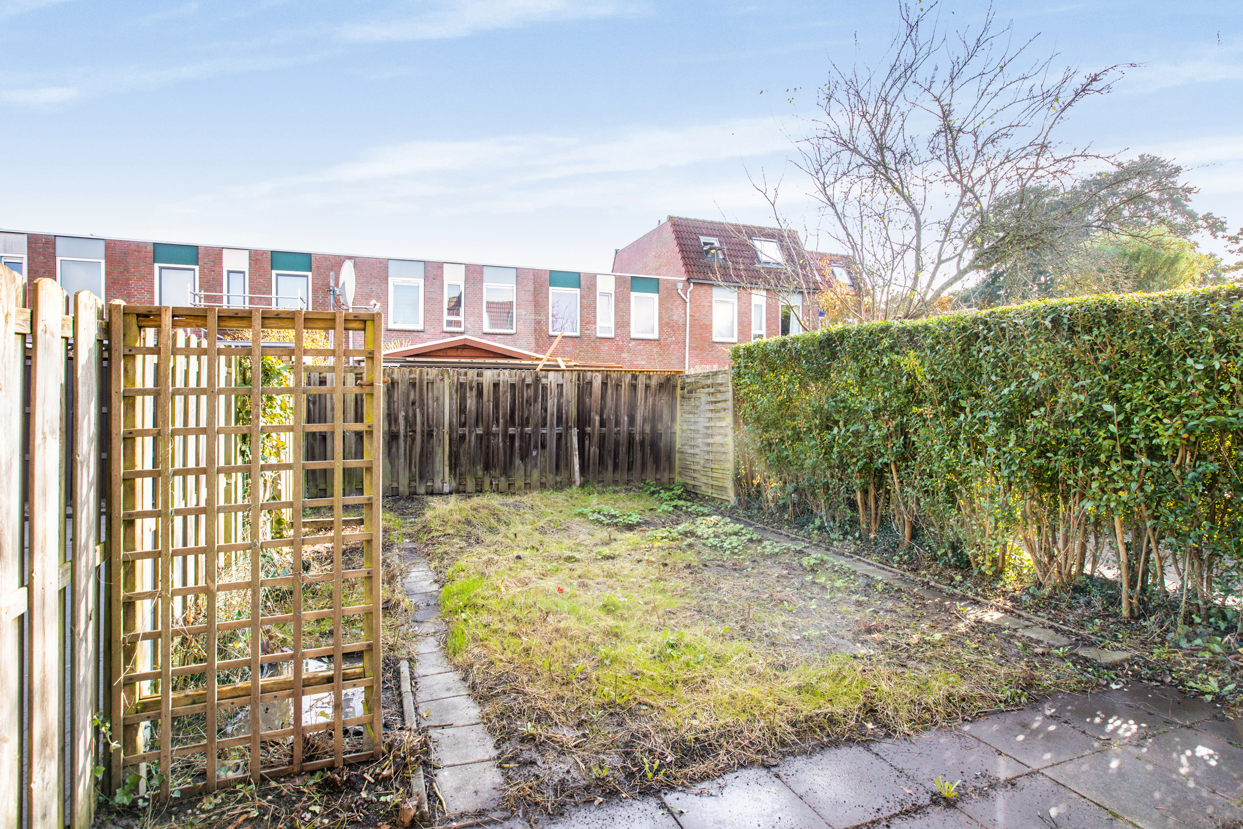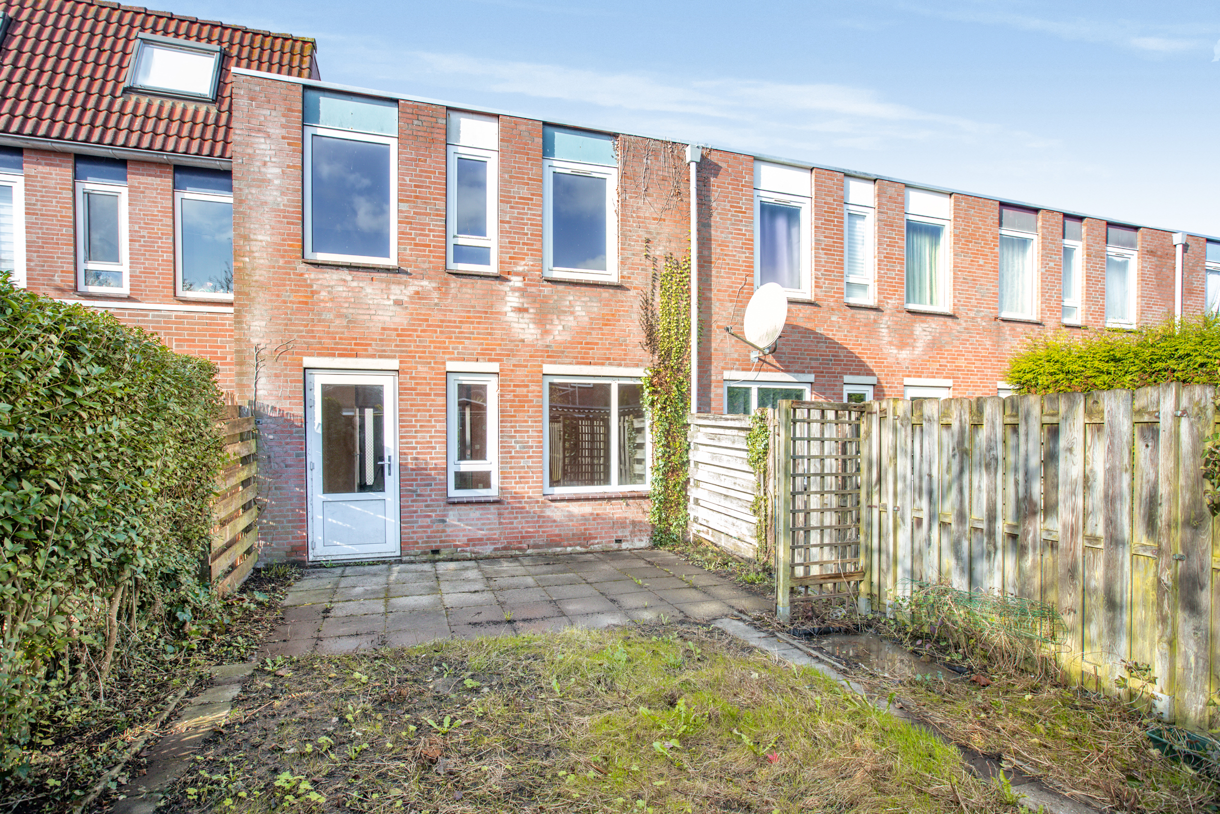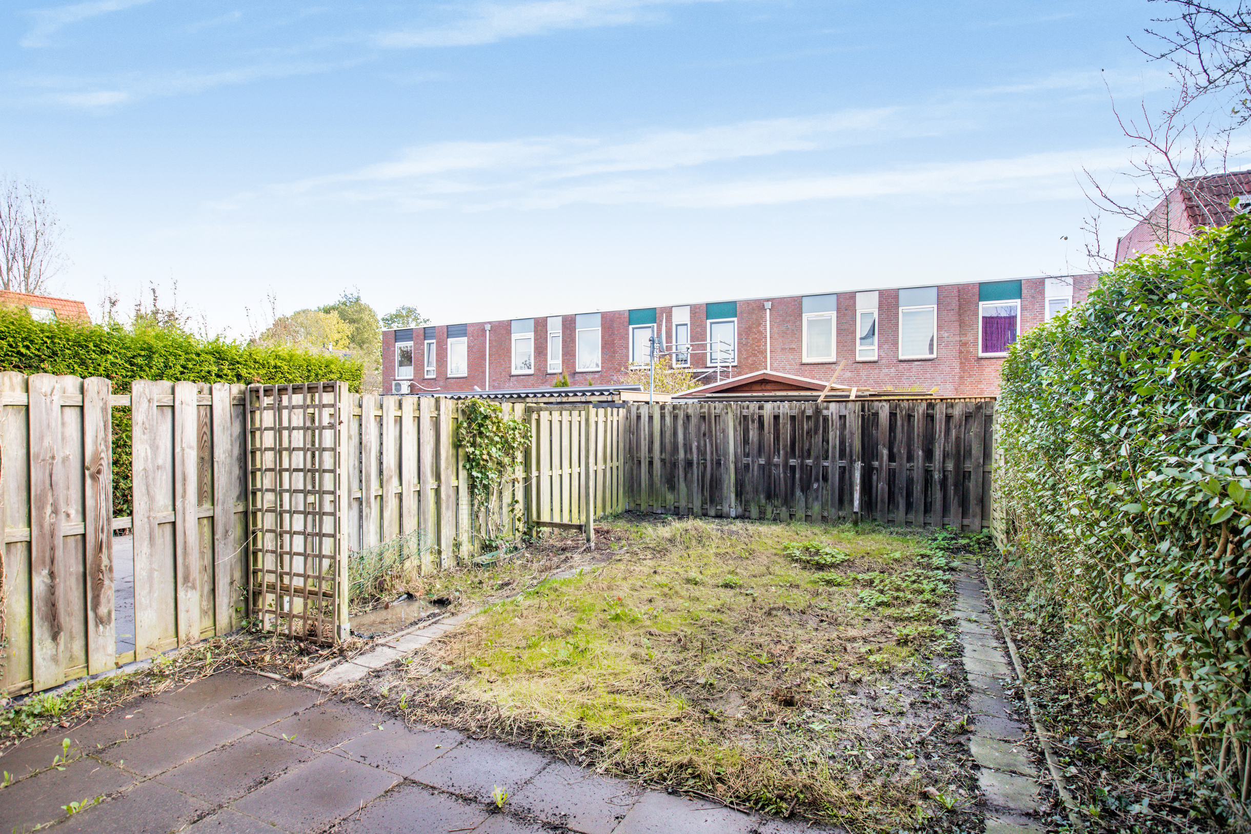 Middels een loopdeur aan de achterzijde is de besloten achtertuin te bereiken. De achtertuin is gelegen op het oosten en is voorzien van een terras, overige bestrating en diverse beplanting.