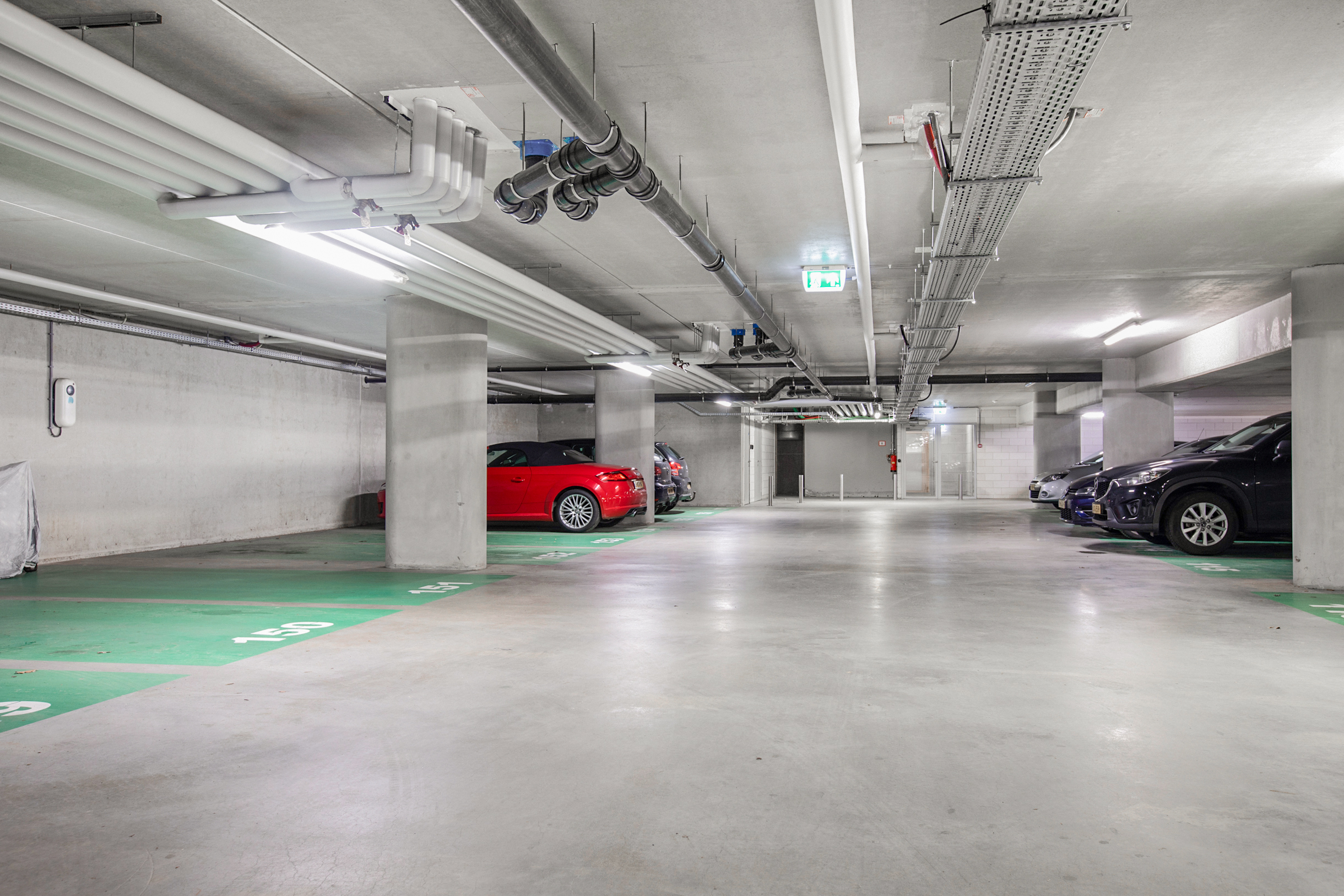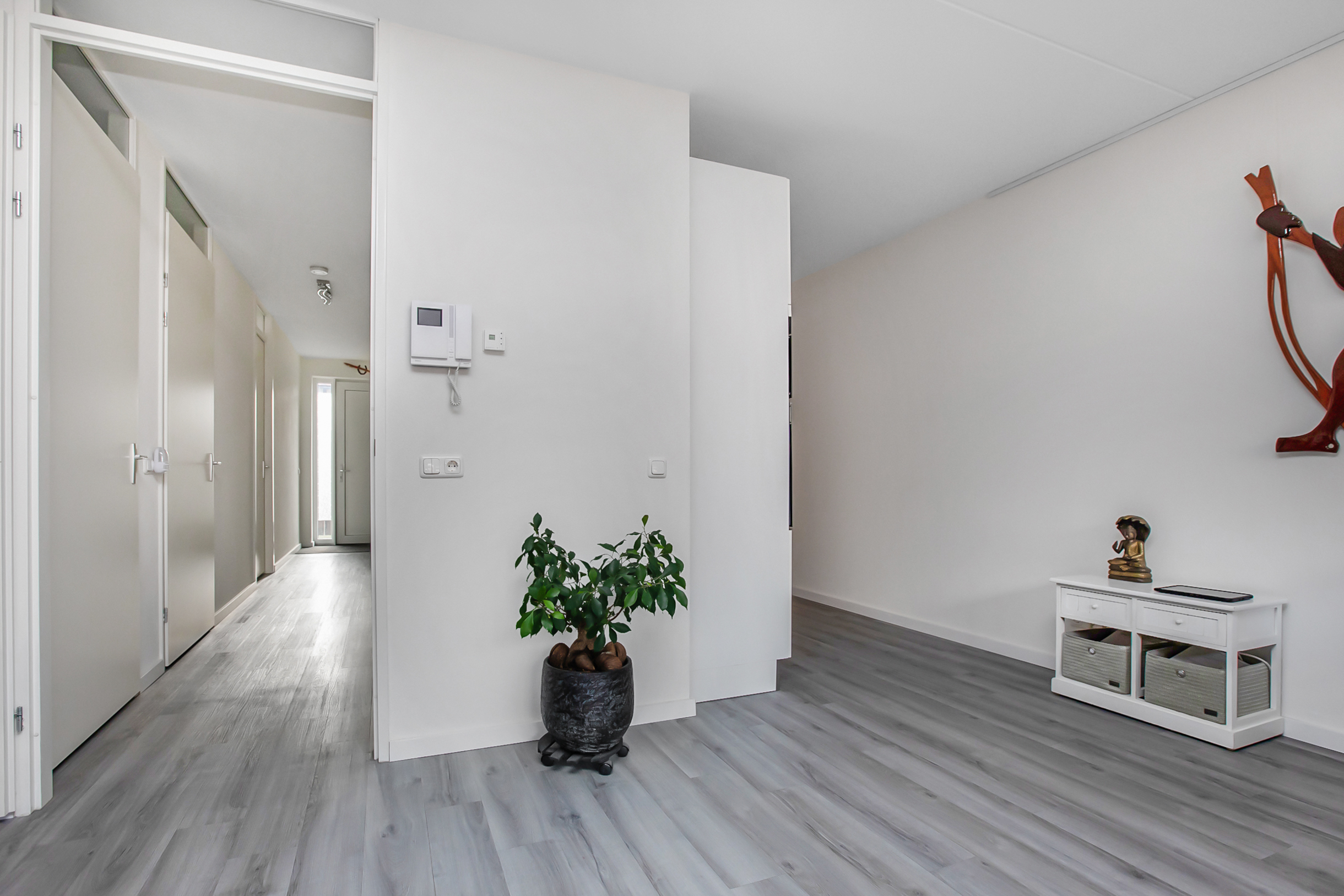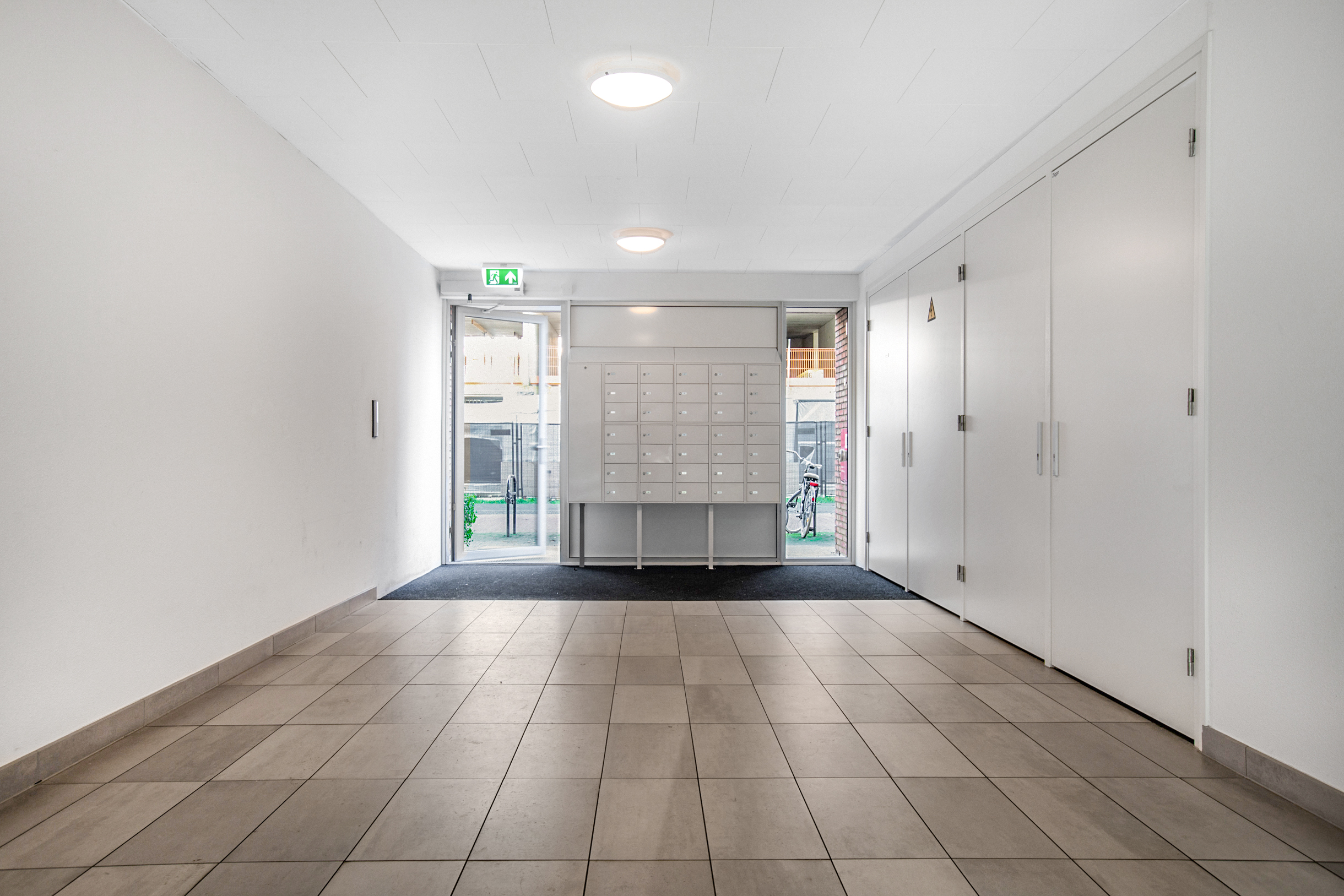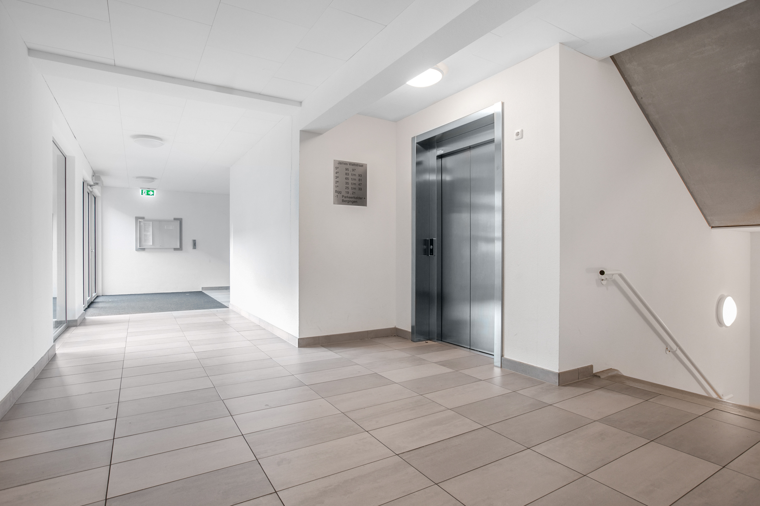 Om naar de berging en parkeergarage te kunnen, moeten we eerst terug naar de afgesloten entree, waar zich tevens een intercomsysteem bevindt. Deze ruimte geeft toegang tot de kelder, waar u de inpandige berging treft, maar ook de overdekte, afgesloten parkeergarage en de gezamenlijke binnentuin