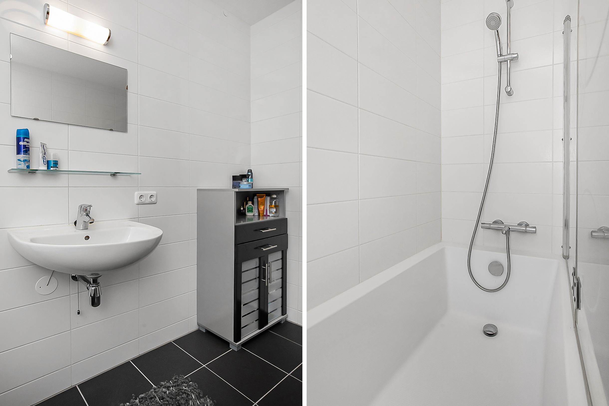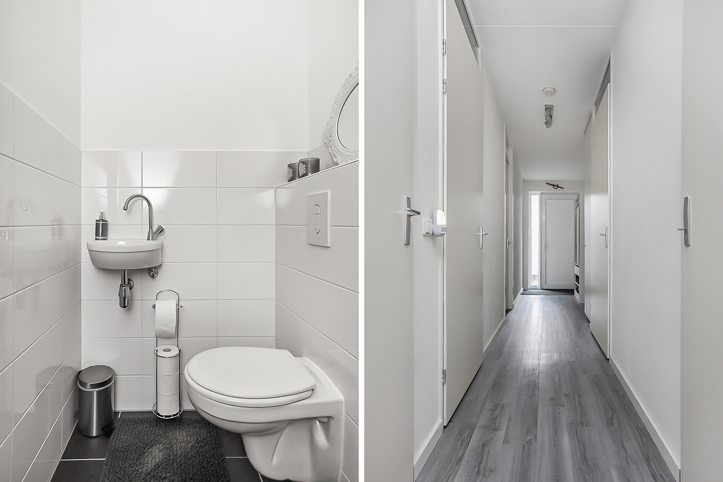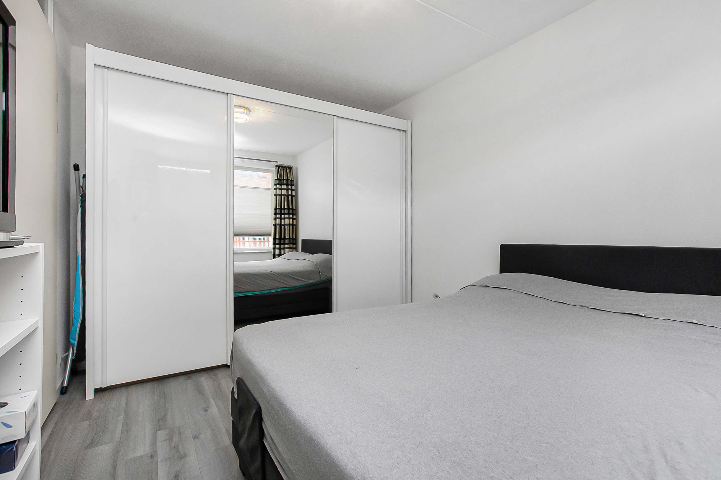 Als we weer terug naar de hal gaan hebben we aan de rechterkant van de hal de berging, maar ook de toiletruimte. Deze ruimte is voorzien van een zweeftoilet en fonteintje. Aan de linkerkant hebben we als eerst een wasruimte, welke grenst aan de badkamer. De badkamer is erg netjes afgewerkt en voorzien van douche, ligbad en wastafel met wastafelmeubel. Teruglopend naar de voordeur eindigen we met de twee slaapkamers.