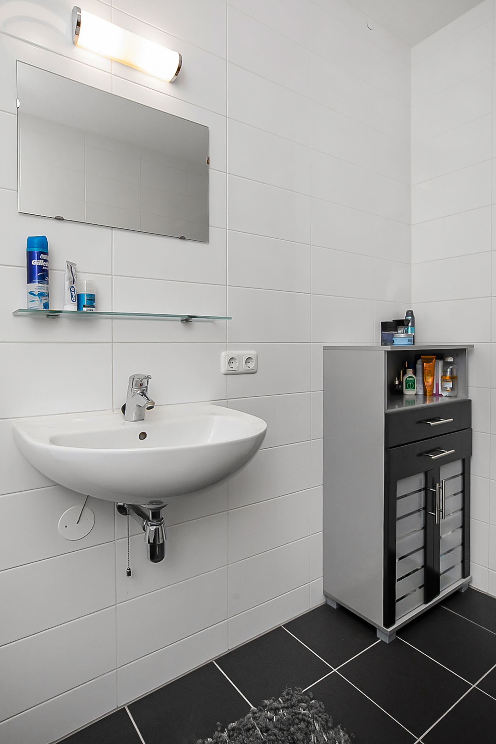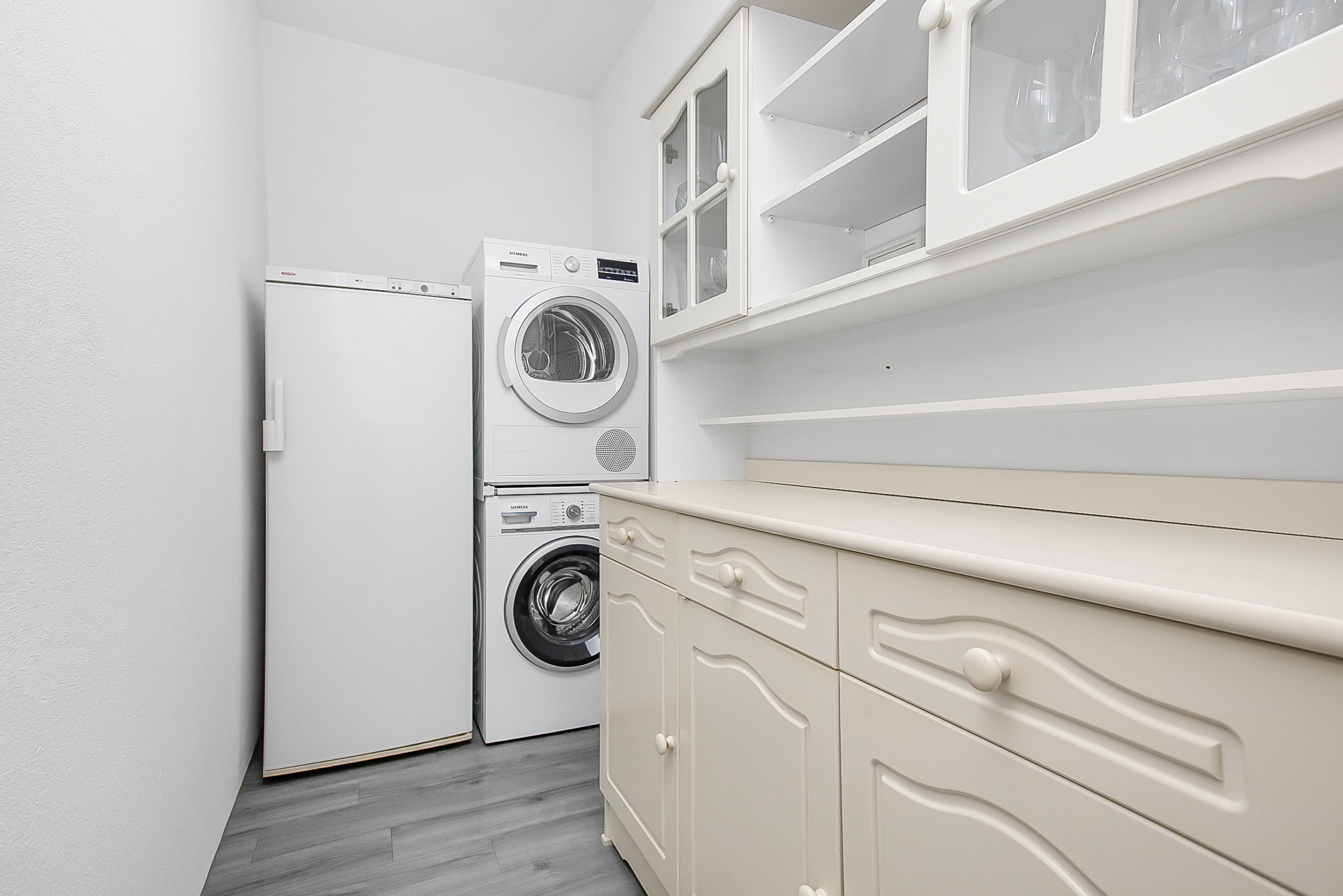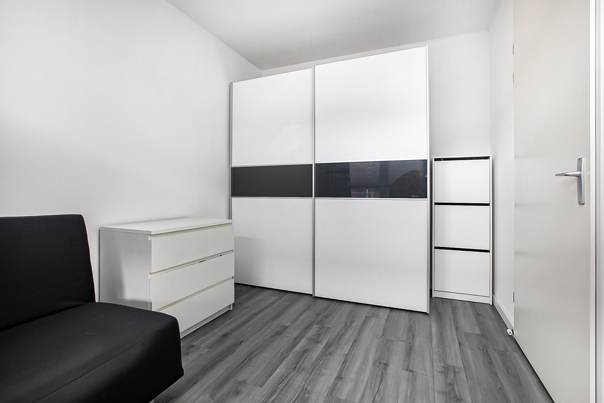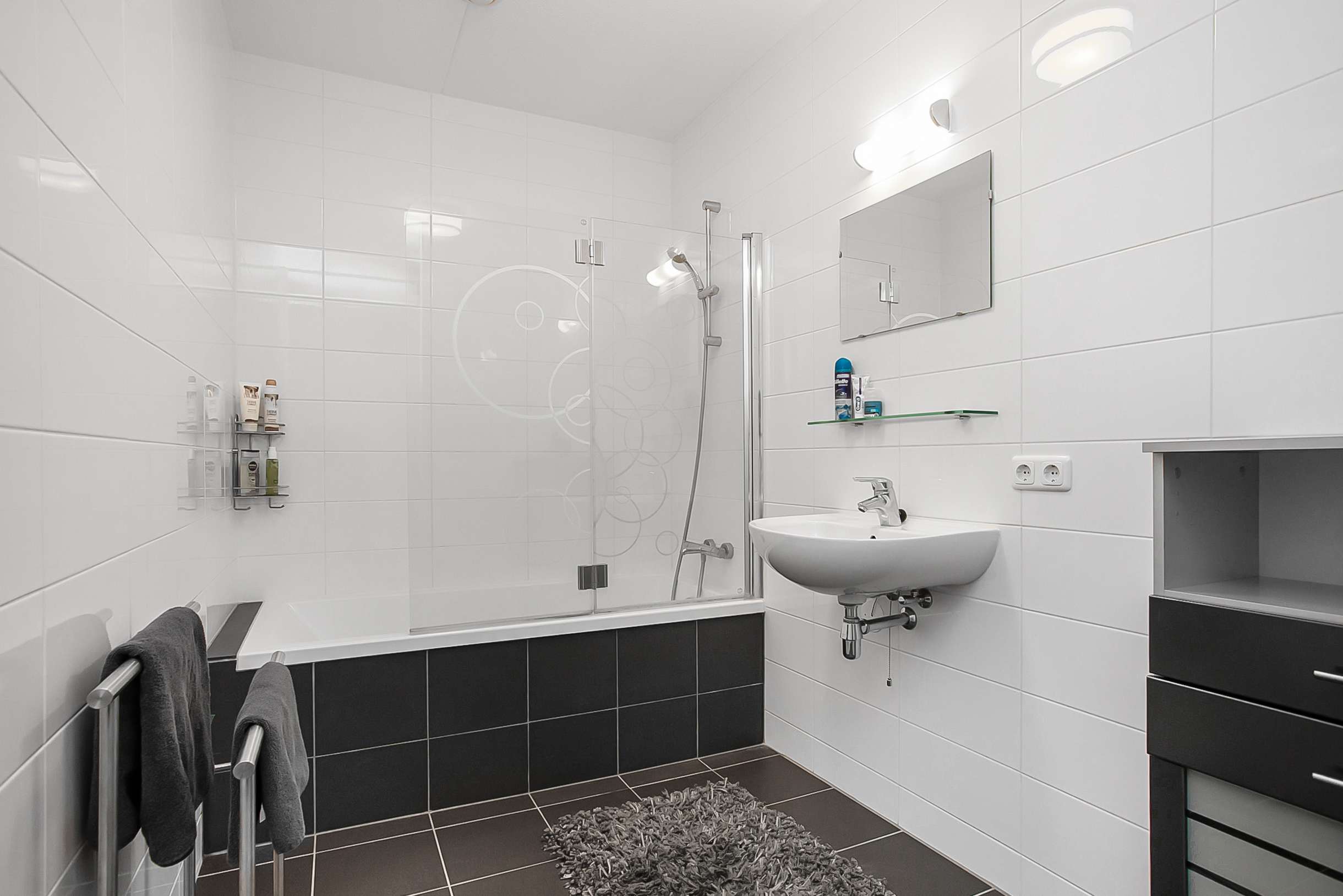 Als we weer terug naar de hal gaan hebben we aan de rechterkant van de hal de berging, maar ook de toiletruimte. Deze ruimte is voorzien van een zweeftoilet en fonteintje. Aan de linkerkant hebben we als eerst een wasruimte, welke grenst aan de badkamer. De badkamer is erg netjes afgewerkt en voorzien van douche, ligbad en wastafel met wastafelmeubel. Teruglopend naar de voordeur eindigen we met de twee slaapkamers.