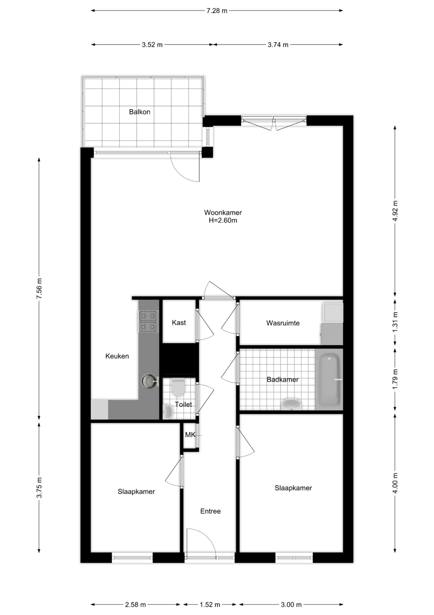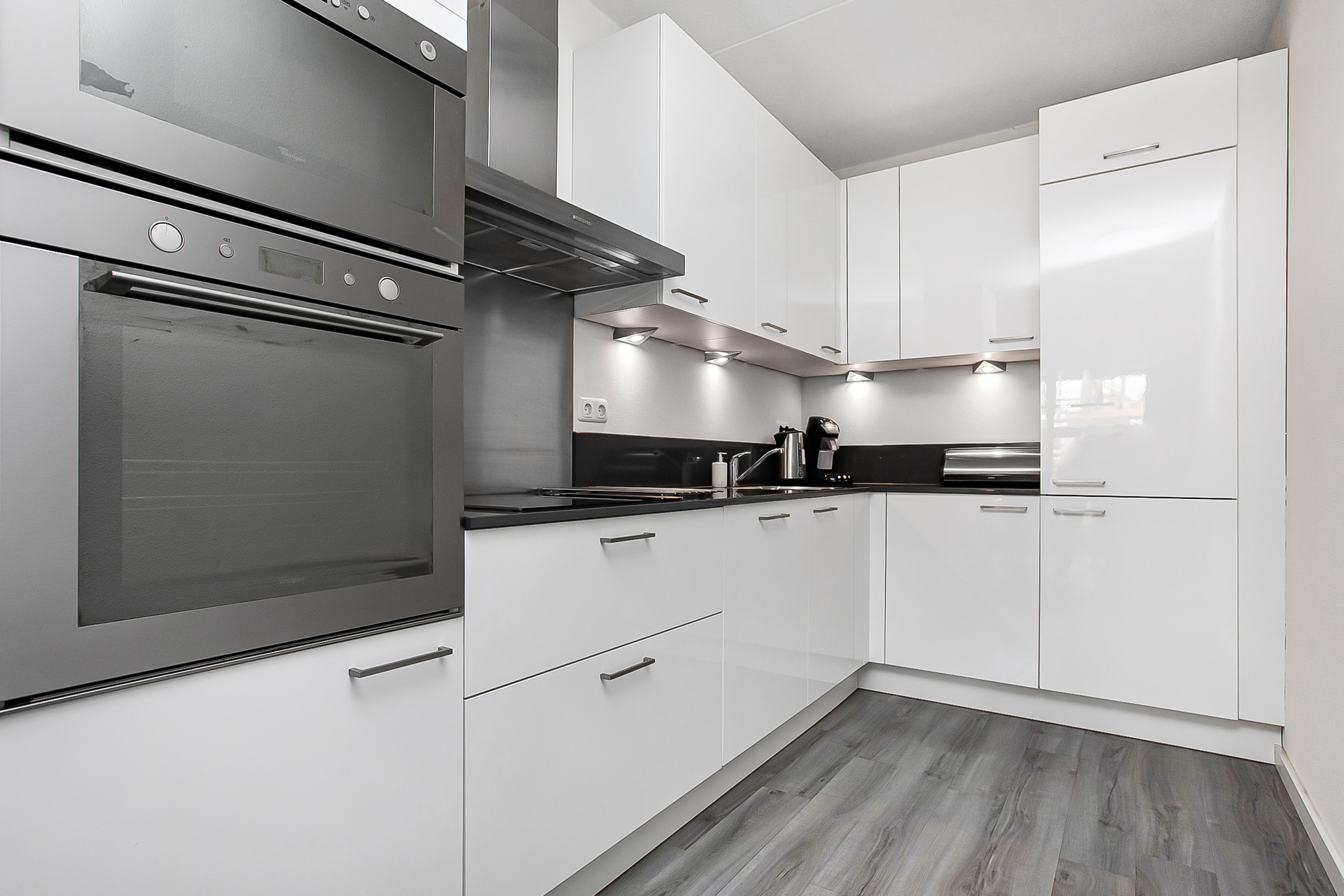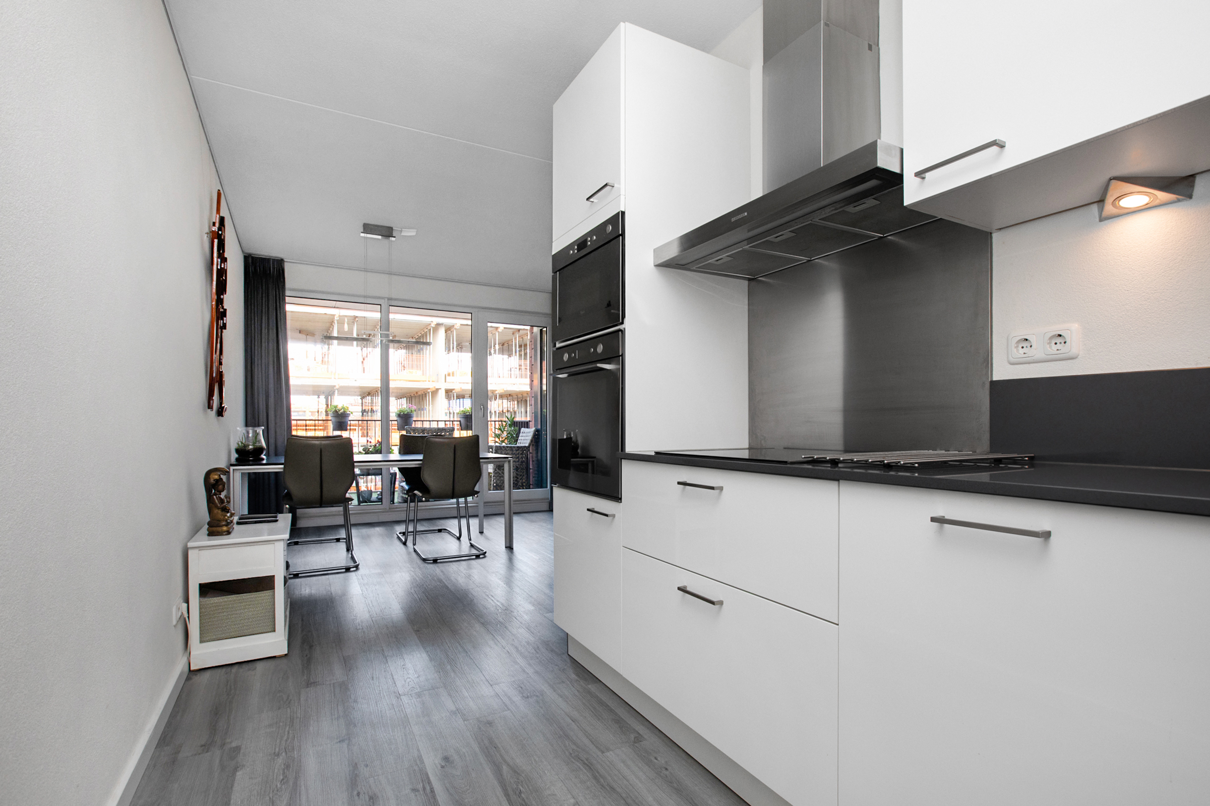 Via de entree kom je uit in een ruime hal, welke toegang geeft tot alle ruimtes in de woning. Helemaal achterin bevindt zich de woonkamer, laten we daar beginnen. Vanuit de woonkamer heb je middels openslaande deuren toegang tot het balkon, maar ook tot de open keuken. Om de woonkamer en keuken met elkaar te verbinden kan de tussenruimte prima ingericht worden als eethoek. Het betreft een moderne keuken, welke voorzien is van inbouwapparatuur zoals vaatwasmachine, combi magnetron/oven, koelkast, keramische kookplaat en een design afzuigkap.