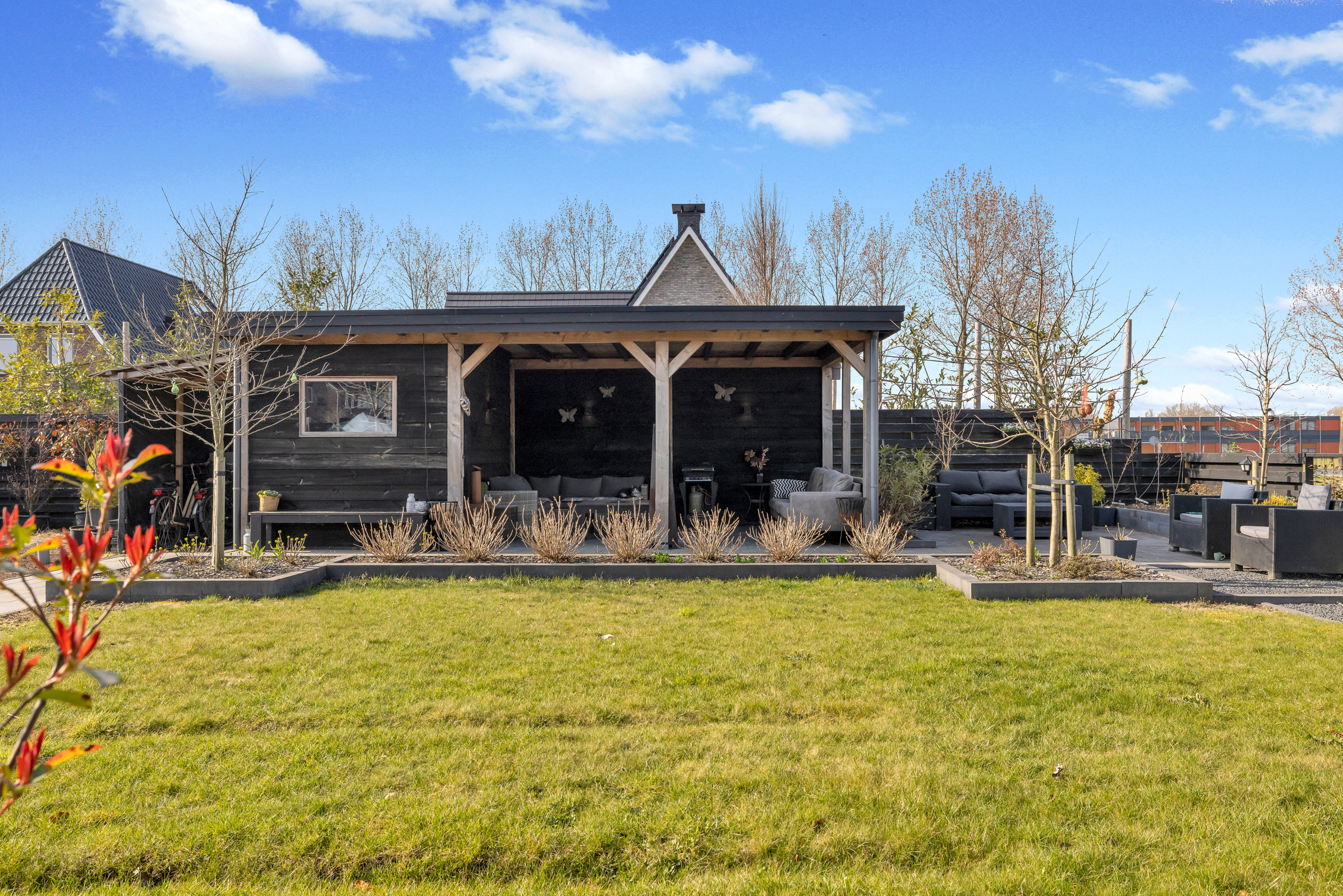 De riante achtertuin beschikt over een sfeervolle houten veranda met berging aan de achterzijde – de perfecte plek om te ontspannen of te genieten van lange zomeravonden.