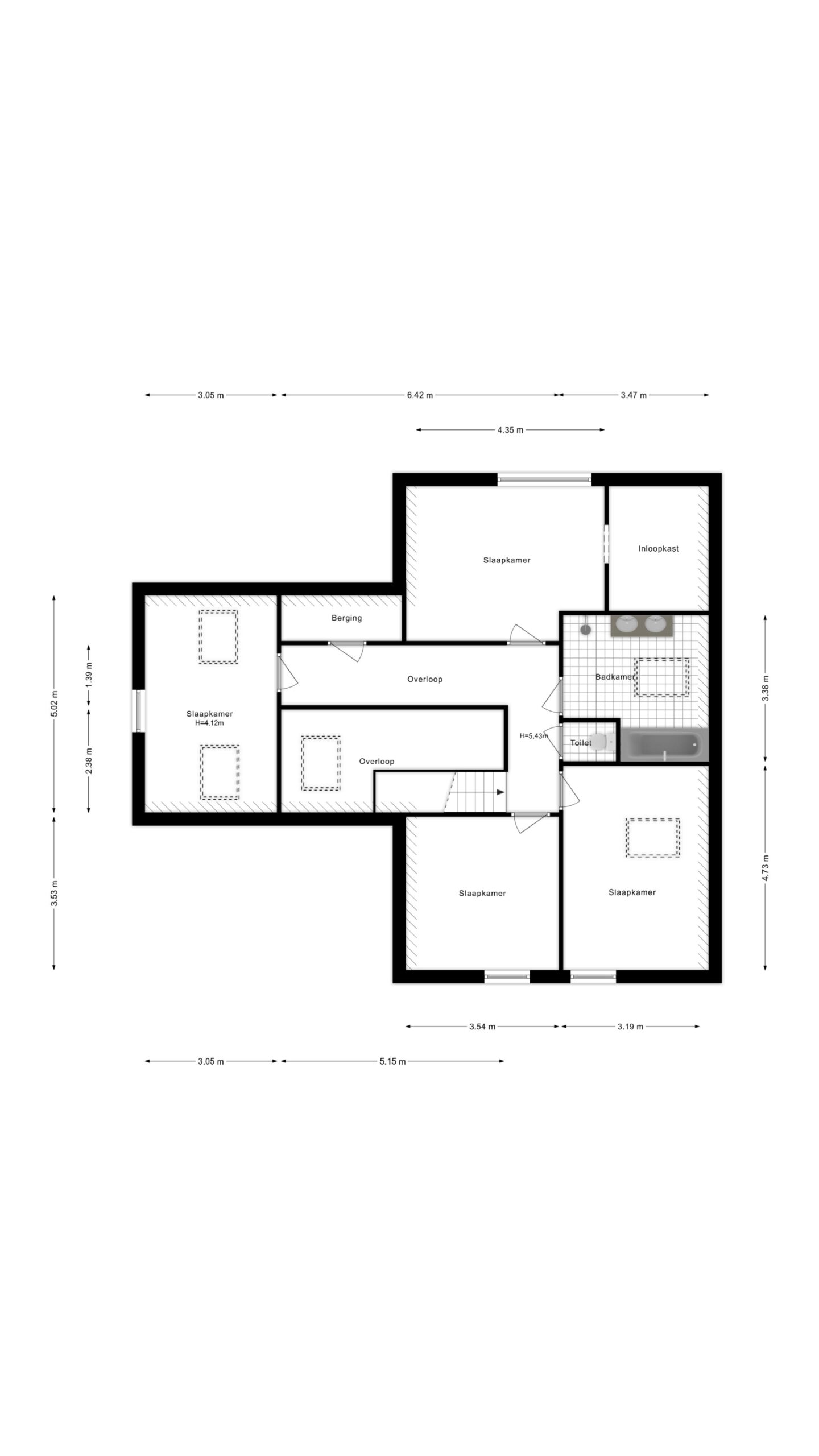 Op de eerste verdieping bevinden zich vier ruime slaapkamers en een moderne badkamer met elektrische vloerverwarming, ligbad, inloopdouche en dubbele wastafel. De overloop biedt tevens toegang tot een separaat toilet.