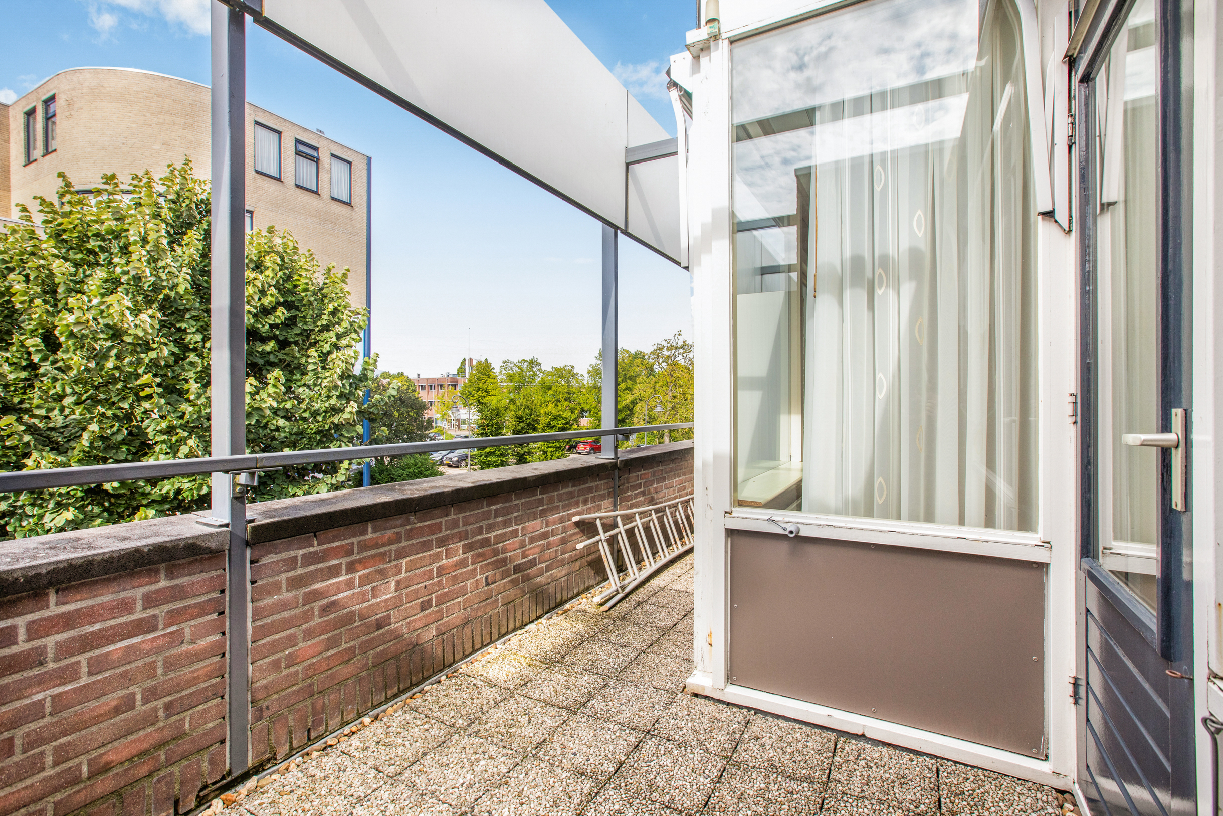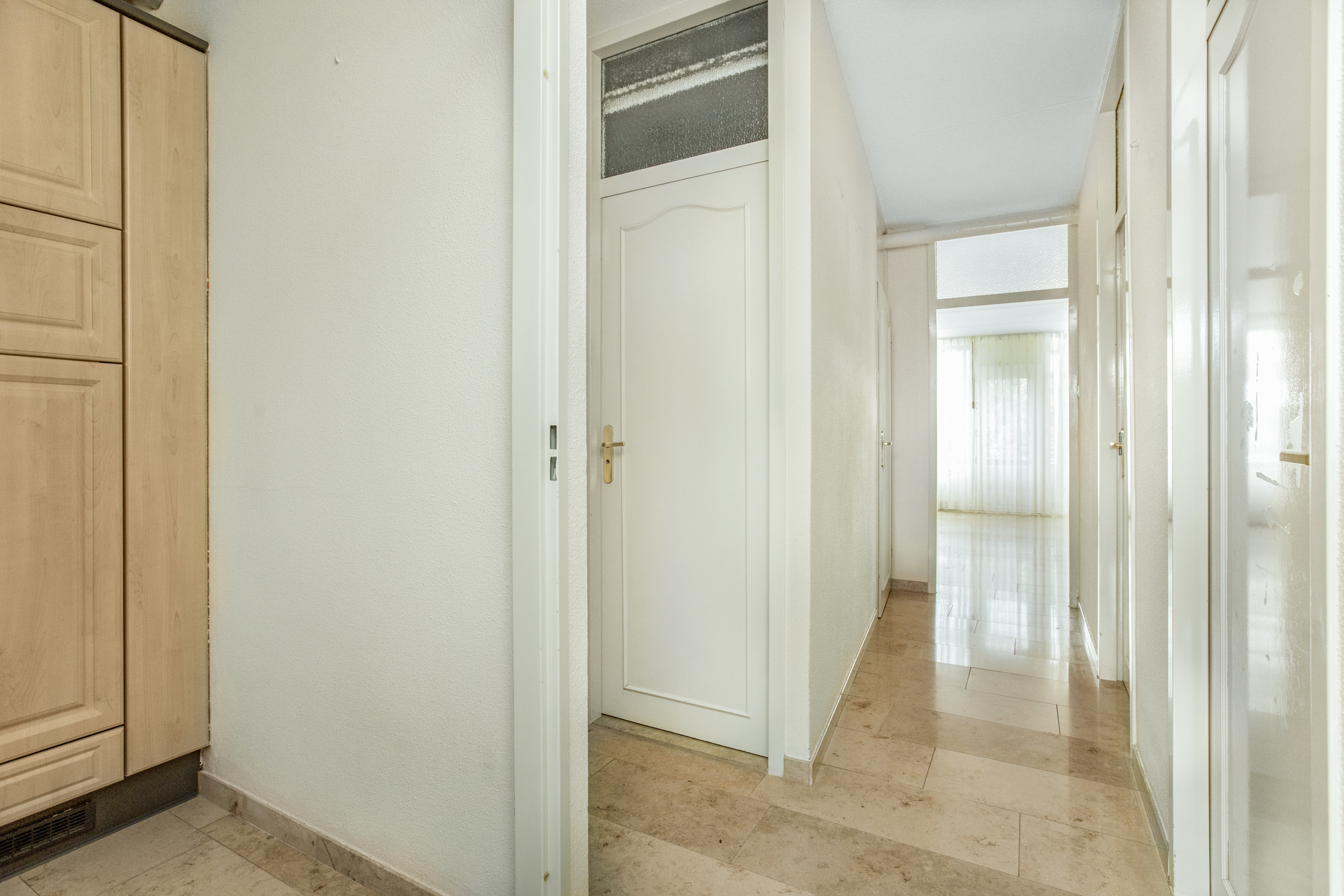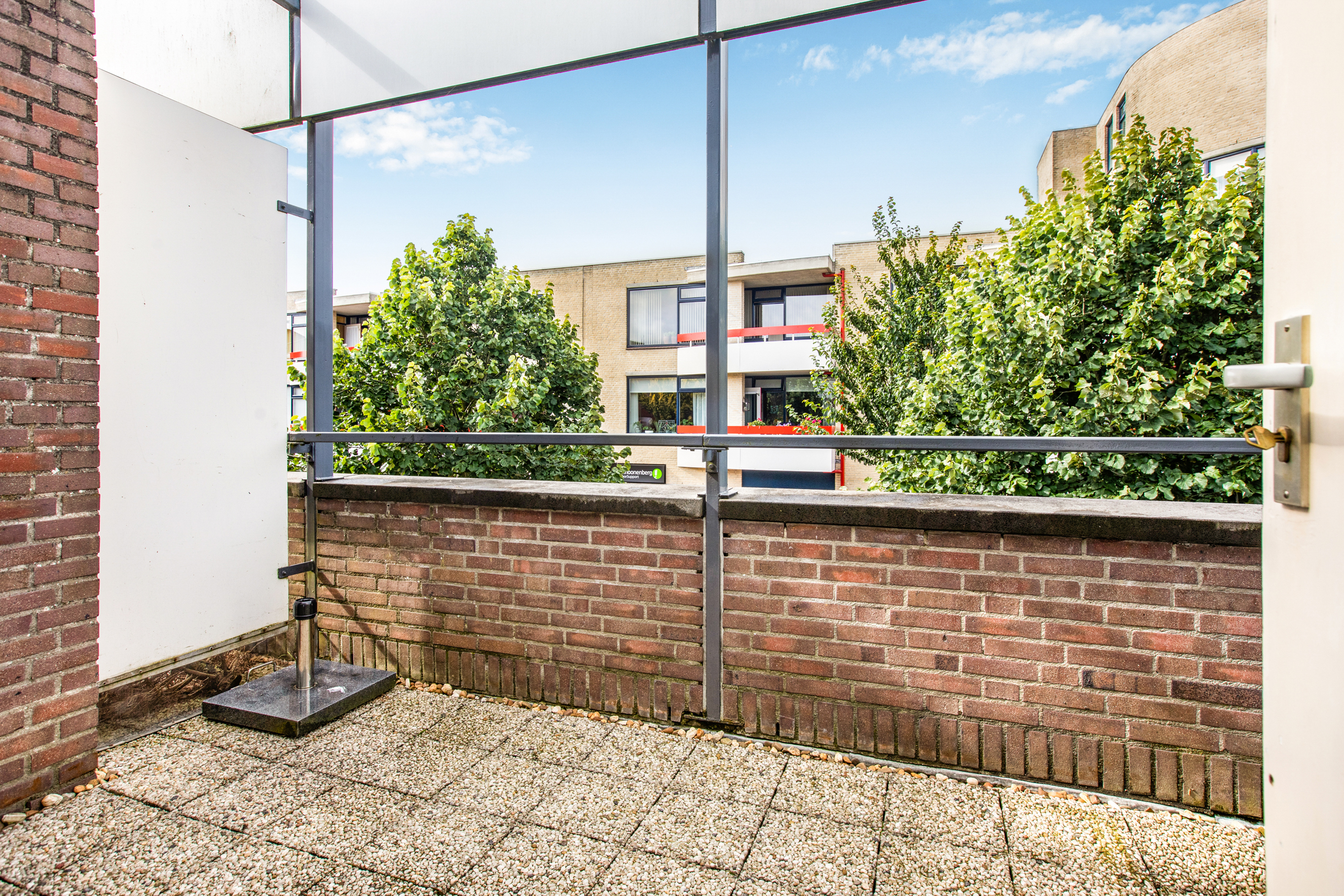 Aan de achterzijde van de woning bevindt zich de ruime en lichte woon-/eetkamer met toegang tot het zonnige balkon, met buitenzonwering, op het zuidwesten. Vanuit de woonkamer en vanaf het balkon heb je ruim en vrij uitzicht.