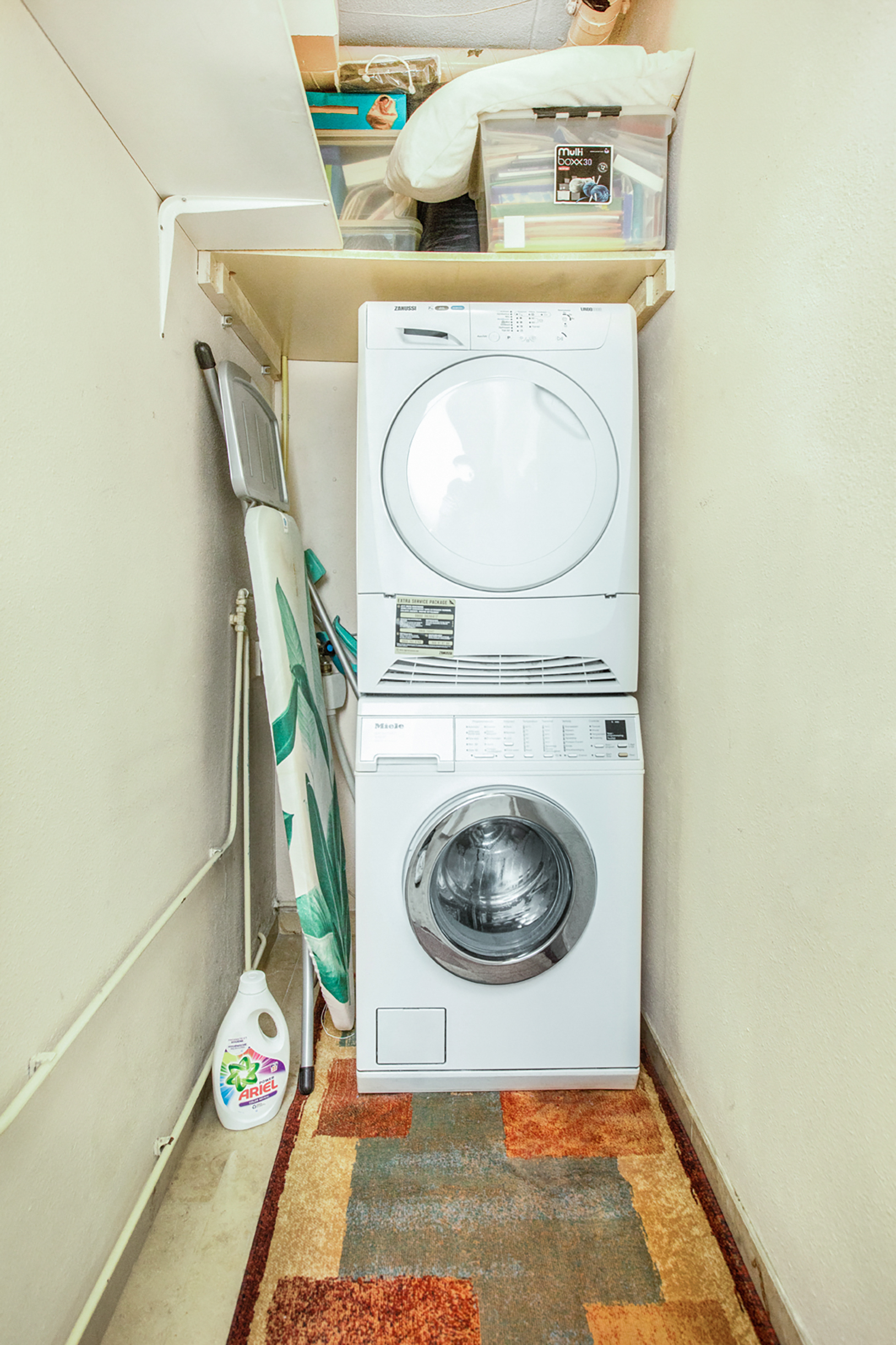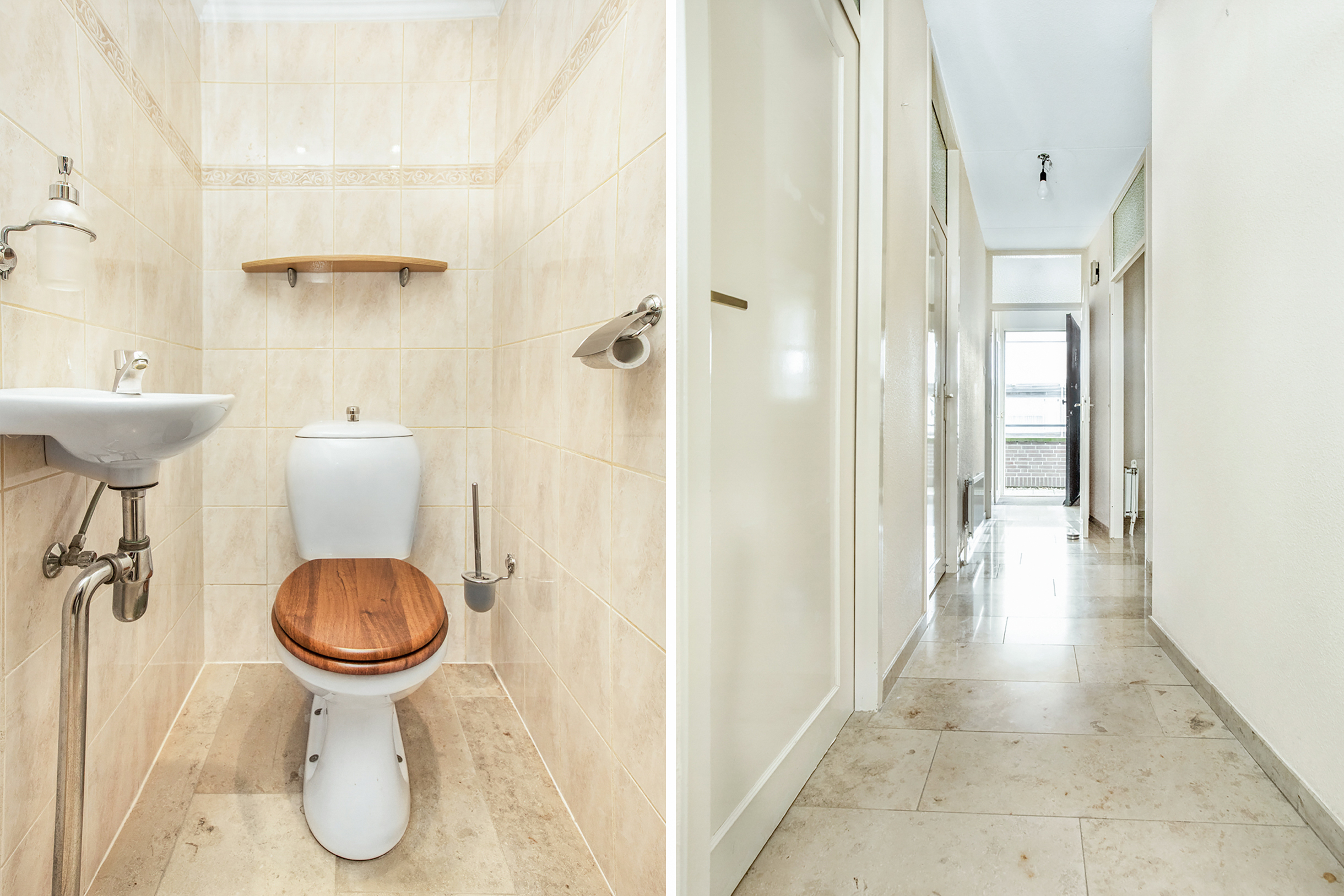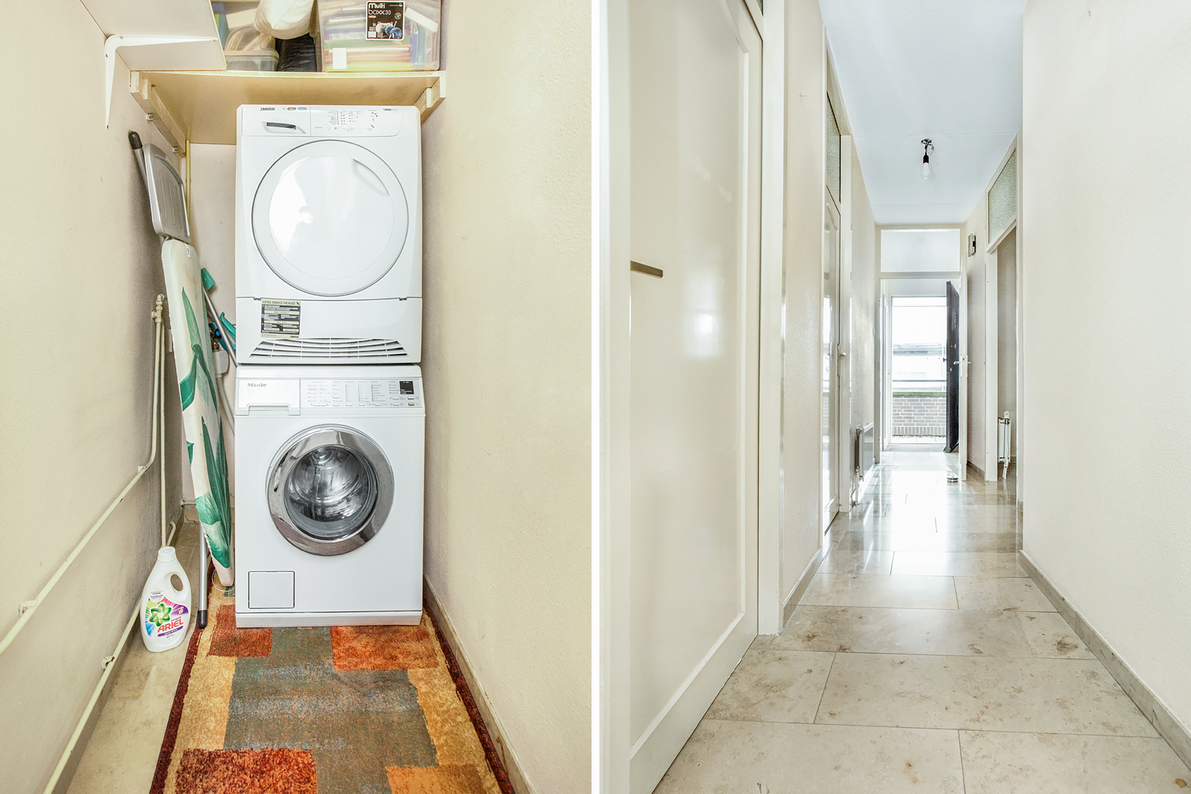 Entree/tochtportaal met meterkast en 2 vaste kasten waarvan in 1 kast de CV-ketel is gesitueerd. Direct aan de linkerhand de dichte keuken in hoekopstelling met diverse inbouwapparatuur, zoals koelkast, vriezer, combimagnetron, 5-pitsgaskookplaat en afzuigkap. Als je doorloopt bevinden zich verder aan de linkerkant de geheel betegelde toiletruimte met fonteintje, de geheel betegelde badkamer met douchecabine en wastafelmeubel en de wasruimte met opstelling voor het witgoedapparatuur.