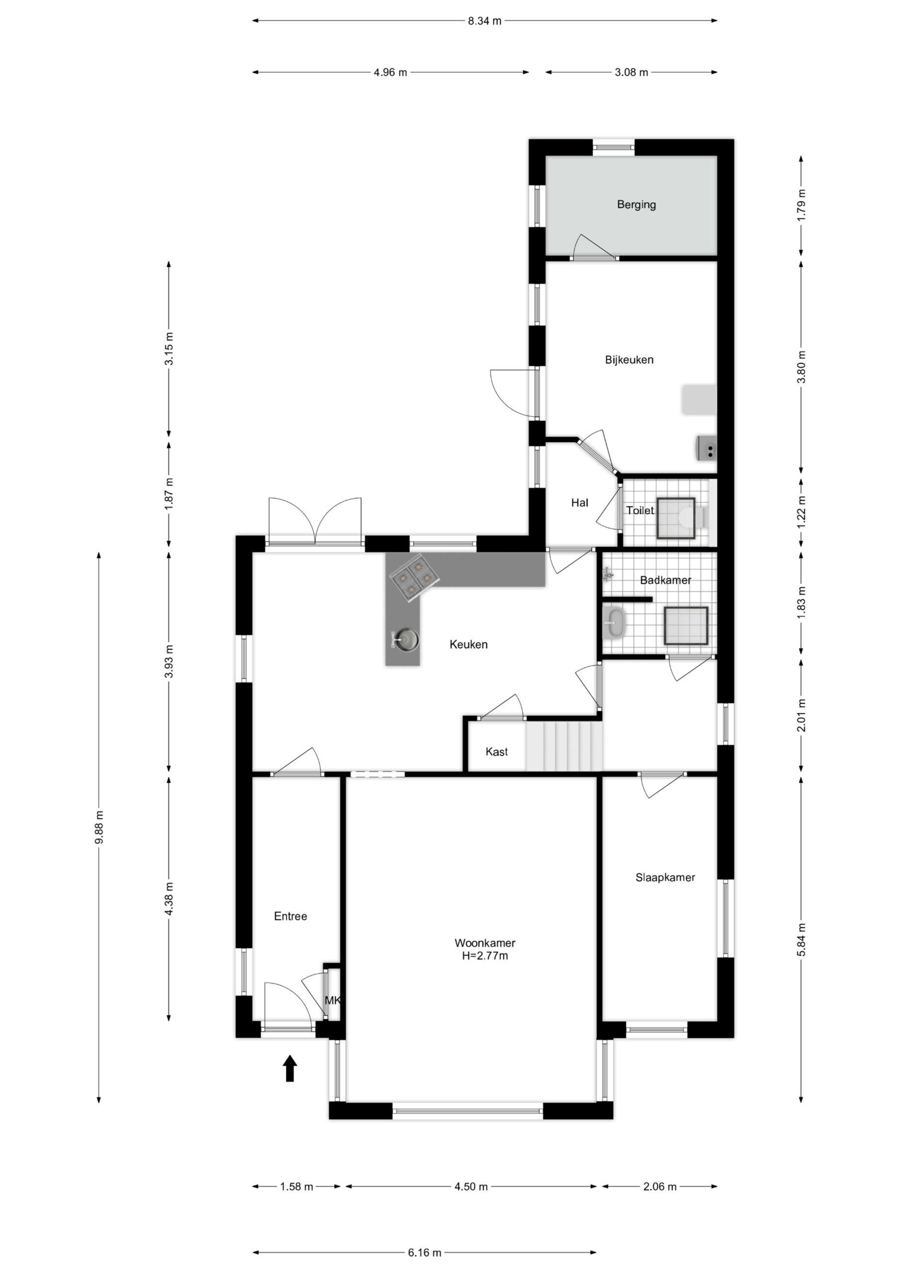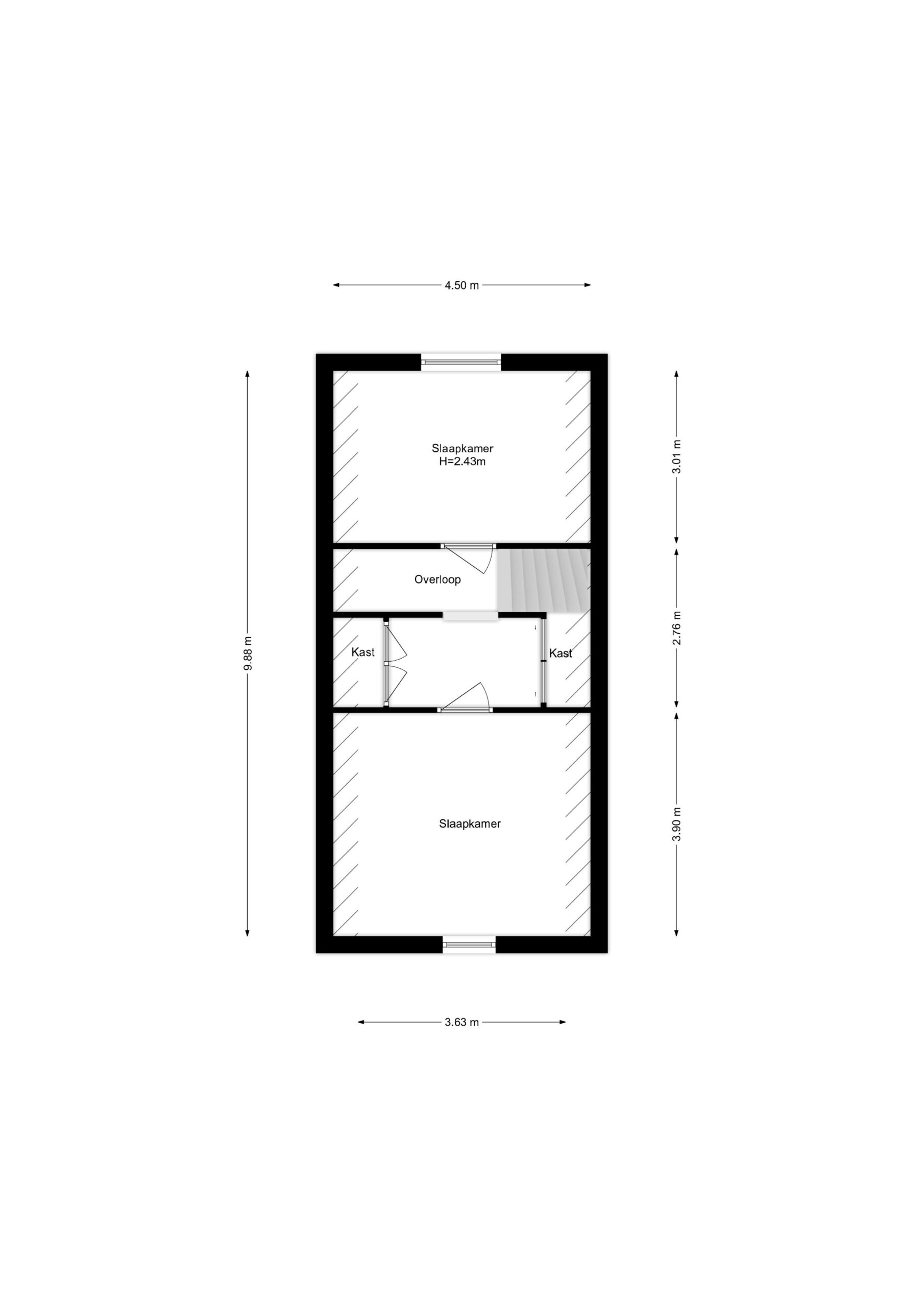 badkamer, welke is voorzien van een wasmeubel en een douche. De andere deur in deze hal geeft toegang tot de slaapkamer. Deze kunt u uiteraard ook als studeerkamer of kantoortje gebruiken. In deze hal bevindt zich ook de trap naar de eerste verdieping.