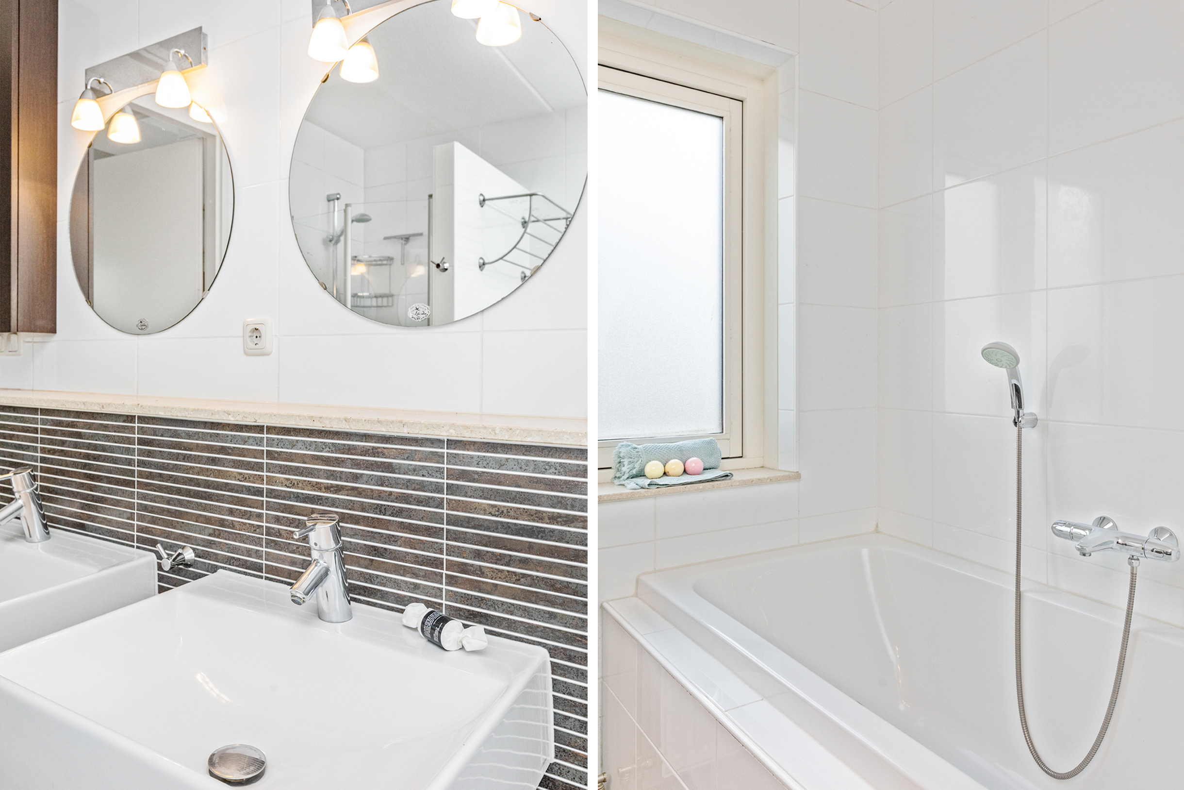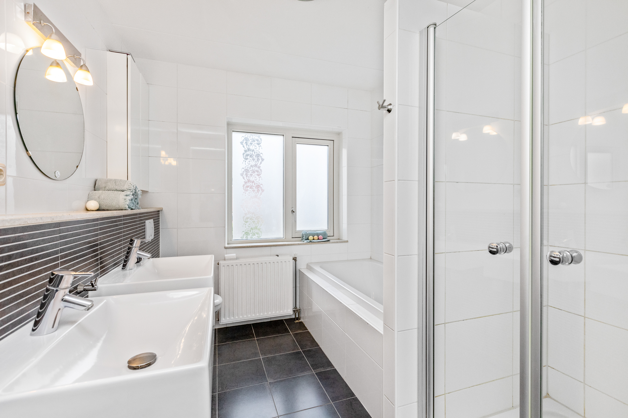 badkamer met dubbele wastafel, douchcabine, toilet en ligbad.