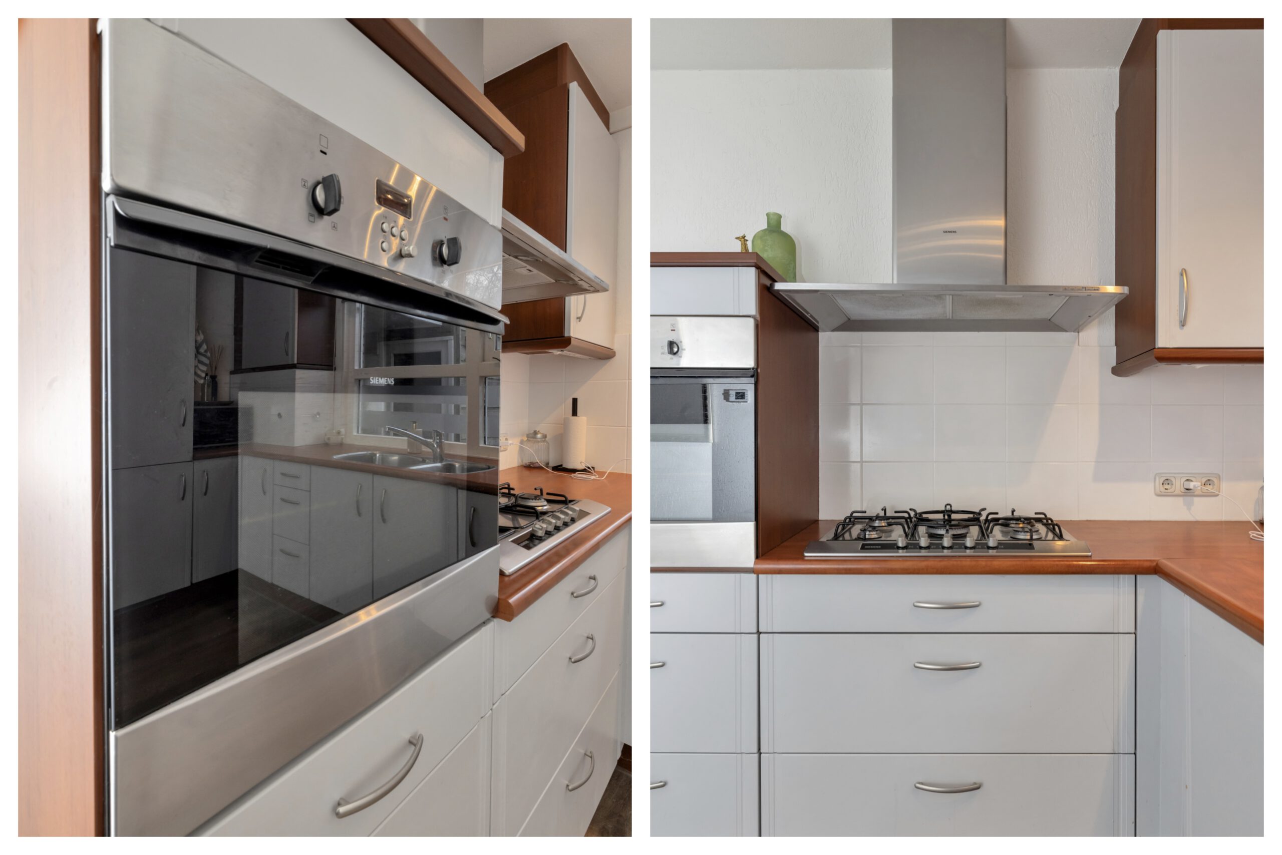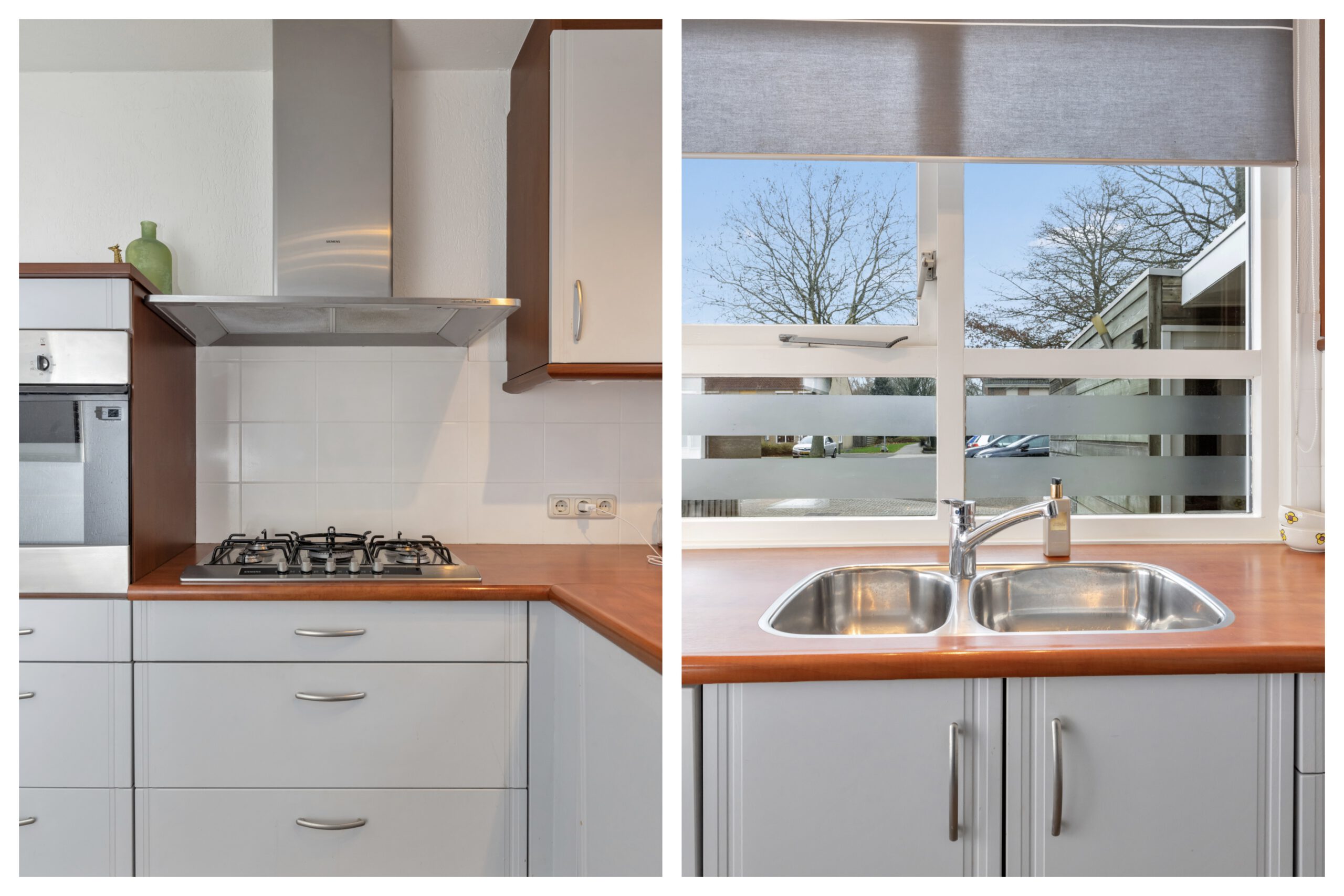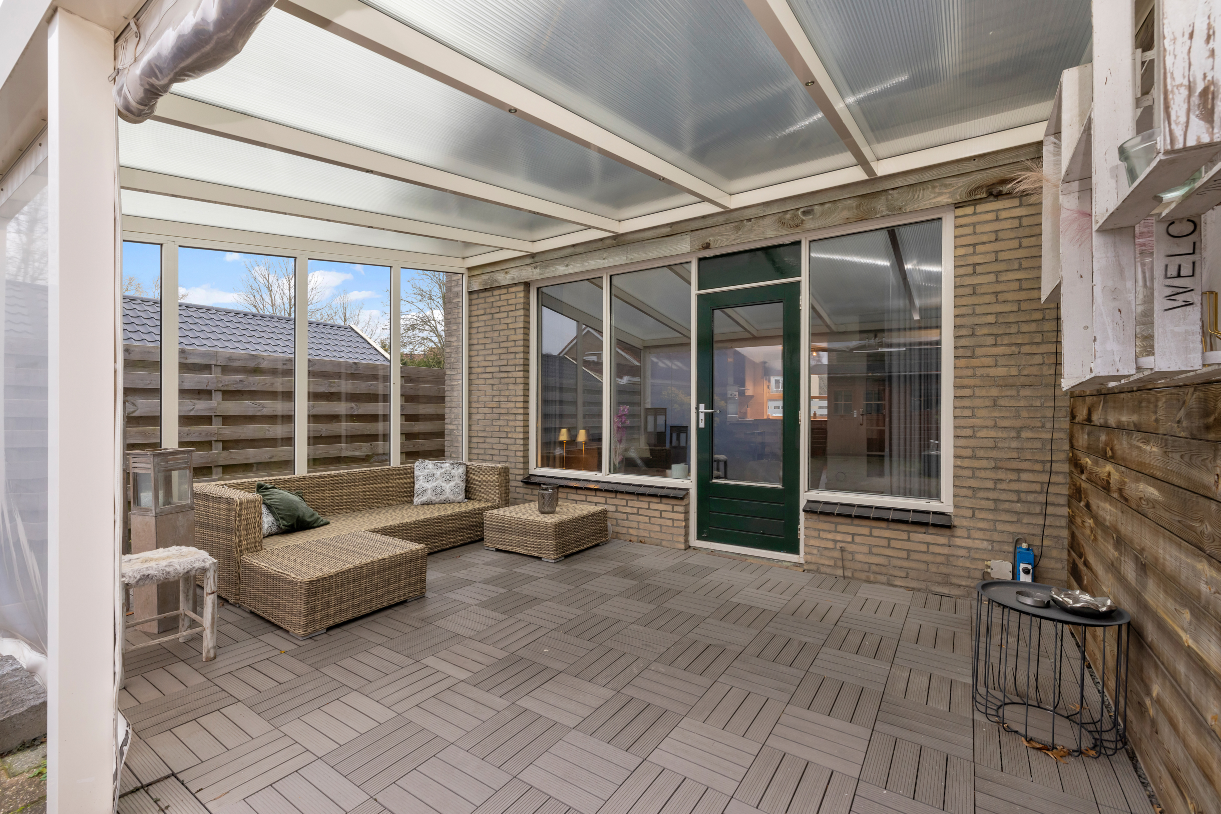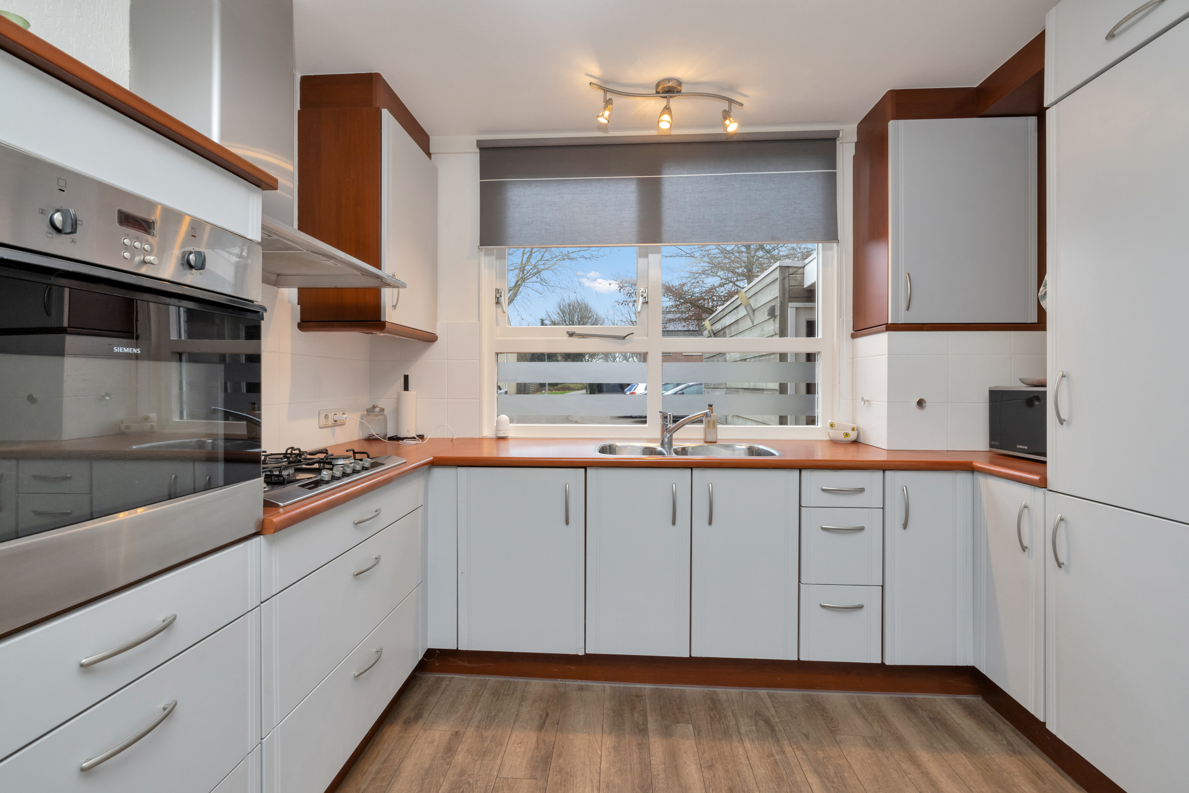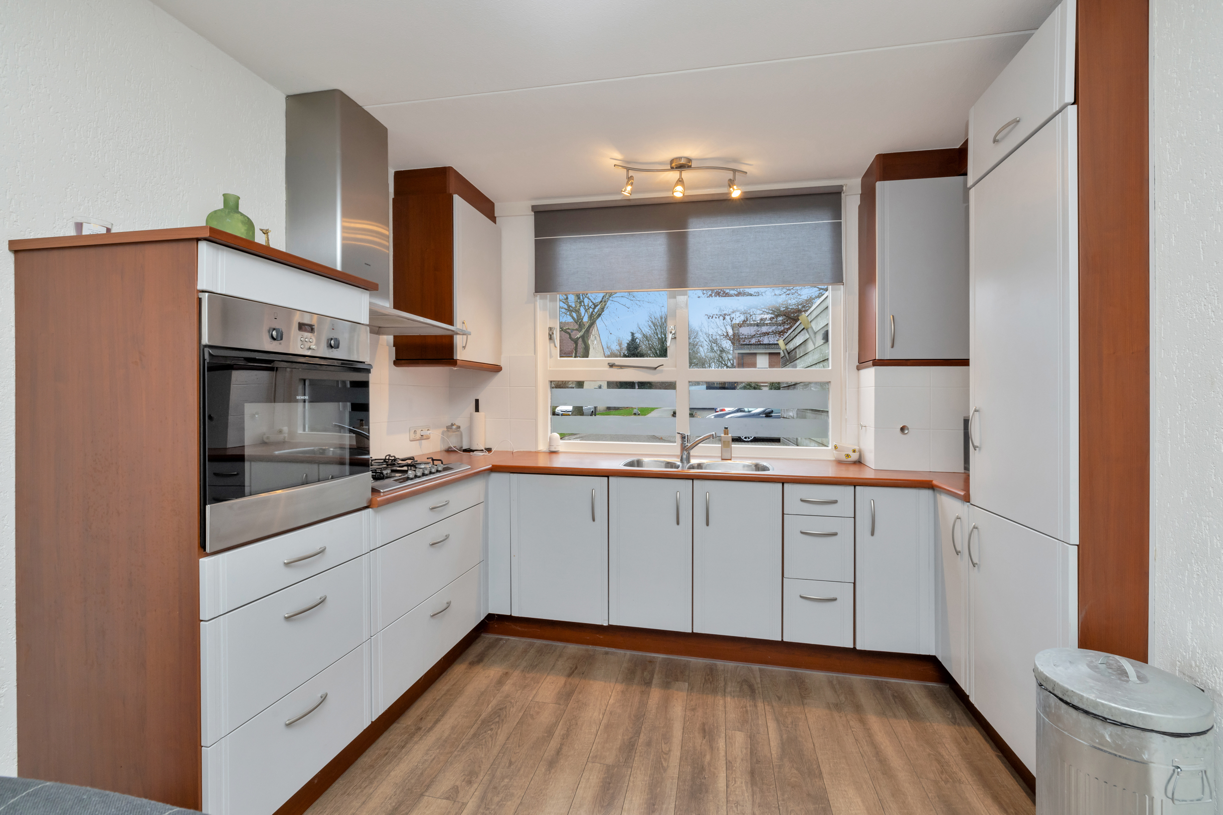 Aan de voorzijde van de woning ligt de open keuken, uitgevoerd in een praktische opstelling met voldoende werk- en kastruimte. Vanuit de woonkamer is er directe toegang tot de overkapping en de achtertuin, waardoor binnen en buiten mooi in elkaar overlopen en je het hele jaar door van extra leefruimte profiteert.