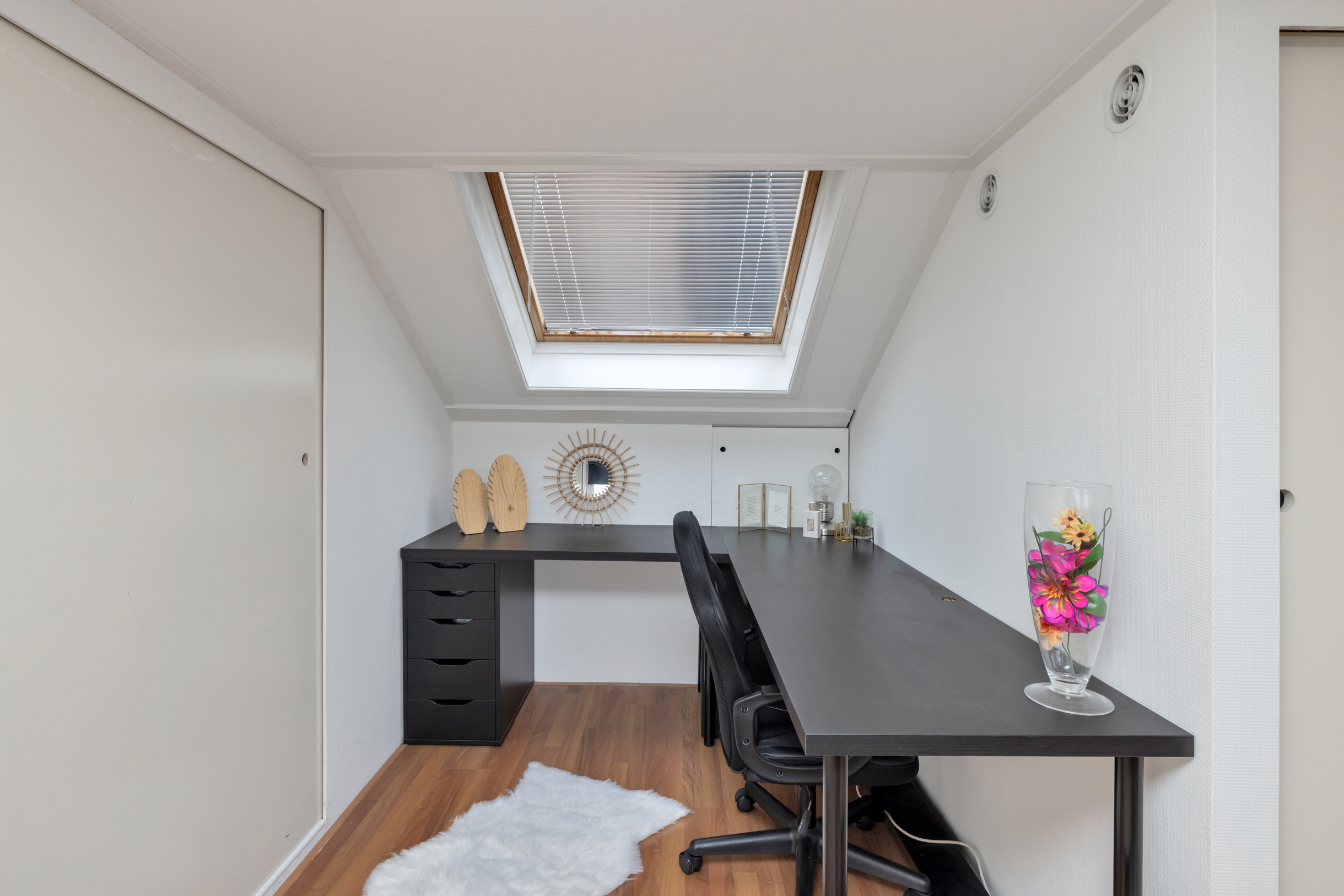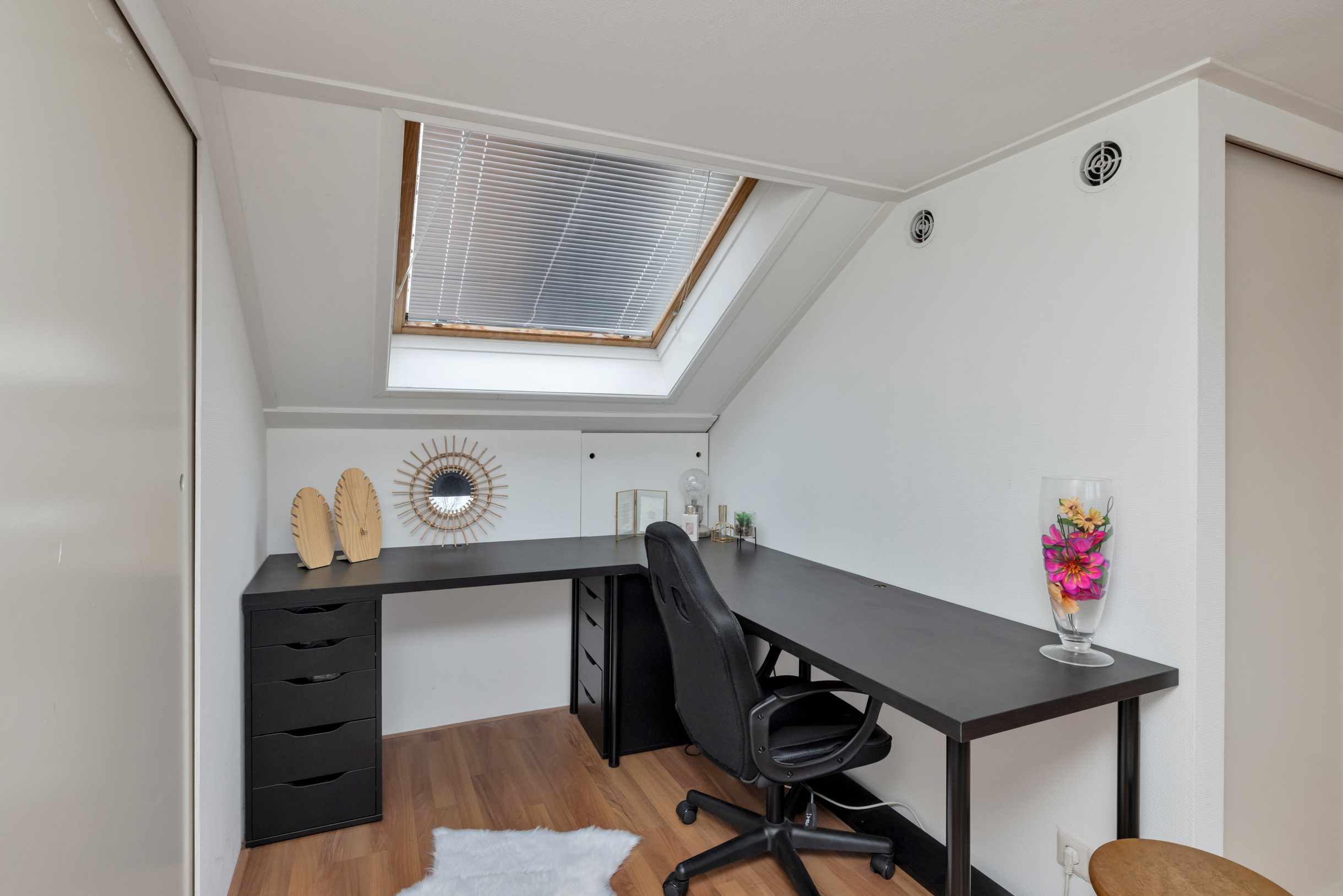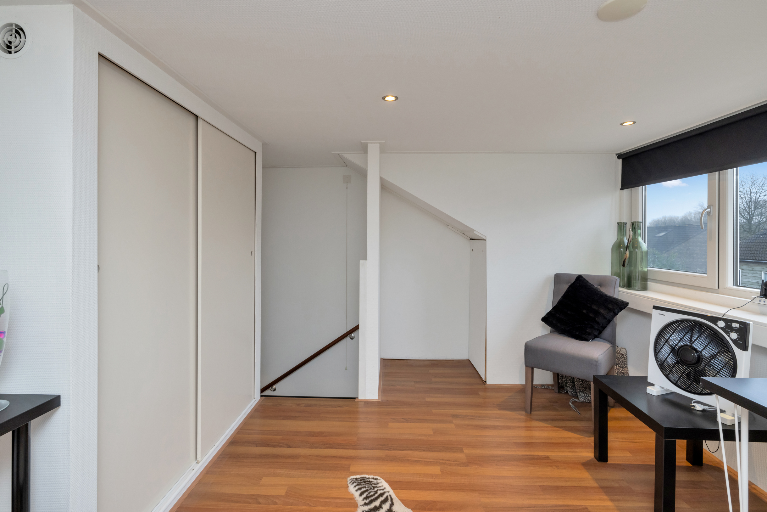 De verdieping beschikt over meerdere vaste kasten en bergruimte achter de knieschotten, wat zorgt voor praktische opbergmogelijkheden. Door de slimme indeling en de goede lichtinval is deze verdieping optimaal benut en vormt zij een waardevolle aanvulling op de woonruimte.