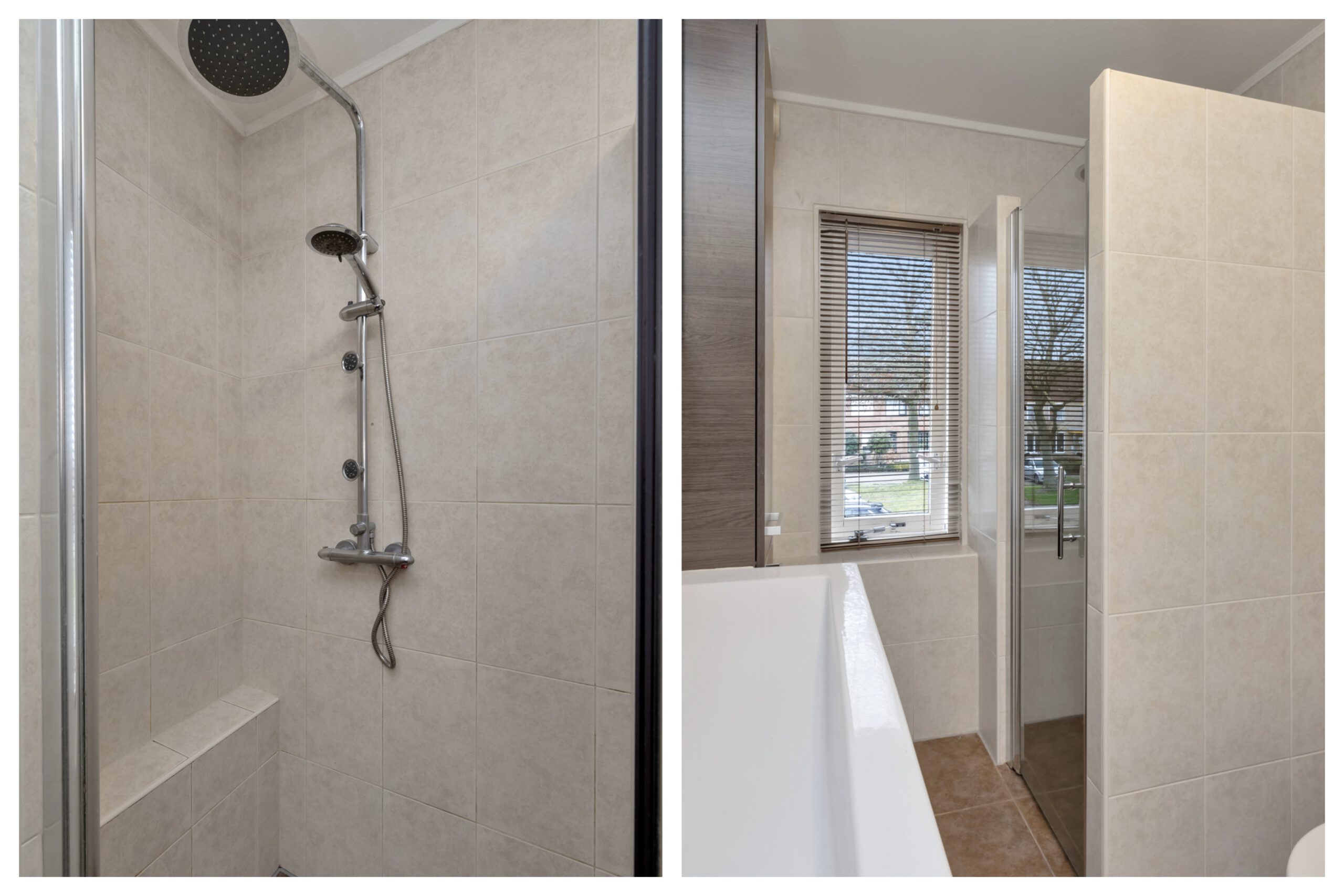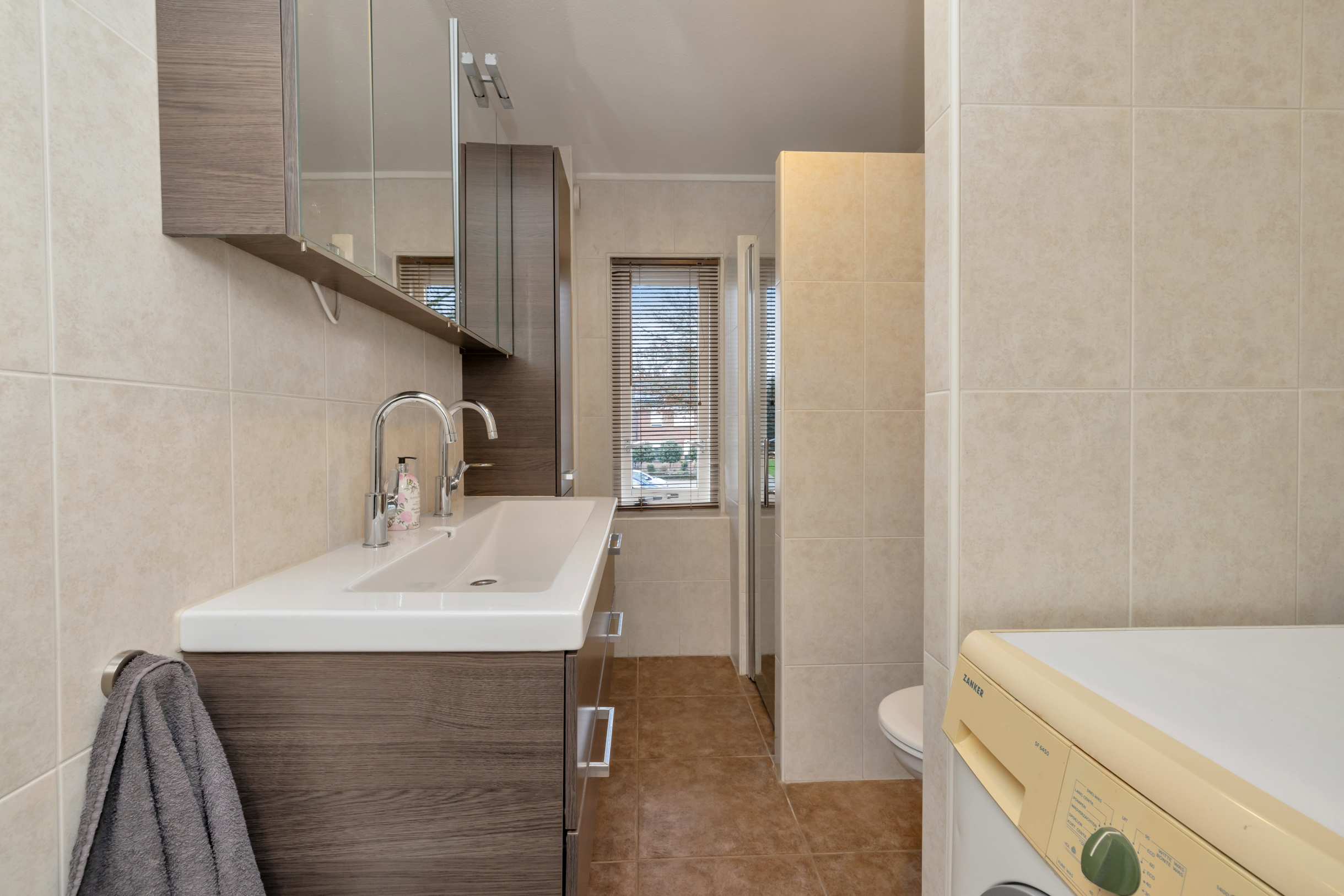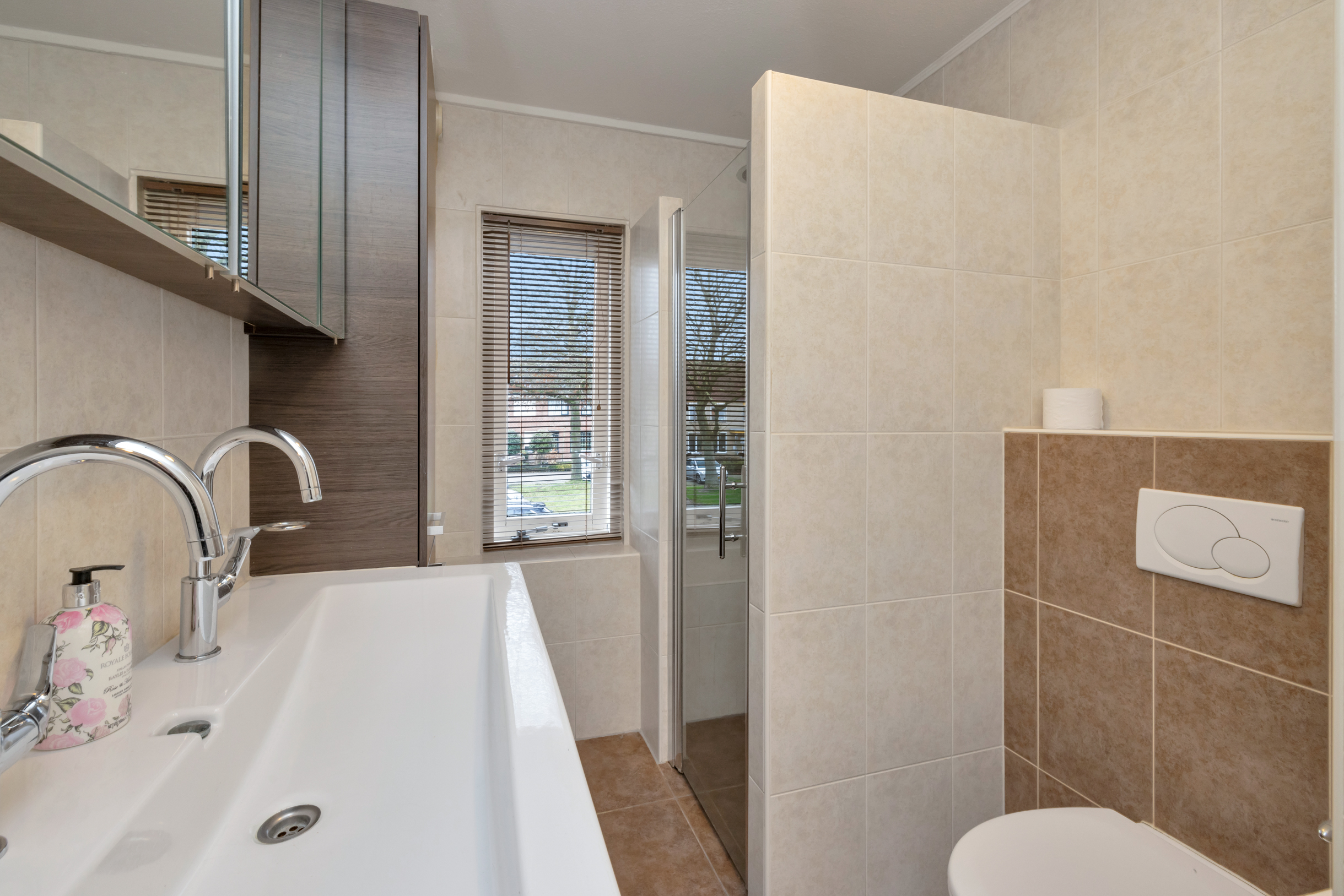 De badkamer is praktisch ingedeeld met een ligbad, douche, wastafel en toiletopstelling. Dankzij de efficiënte indeling is de ruimte comfortabel in gebruik.