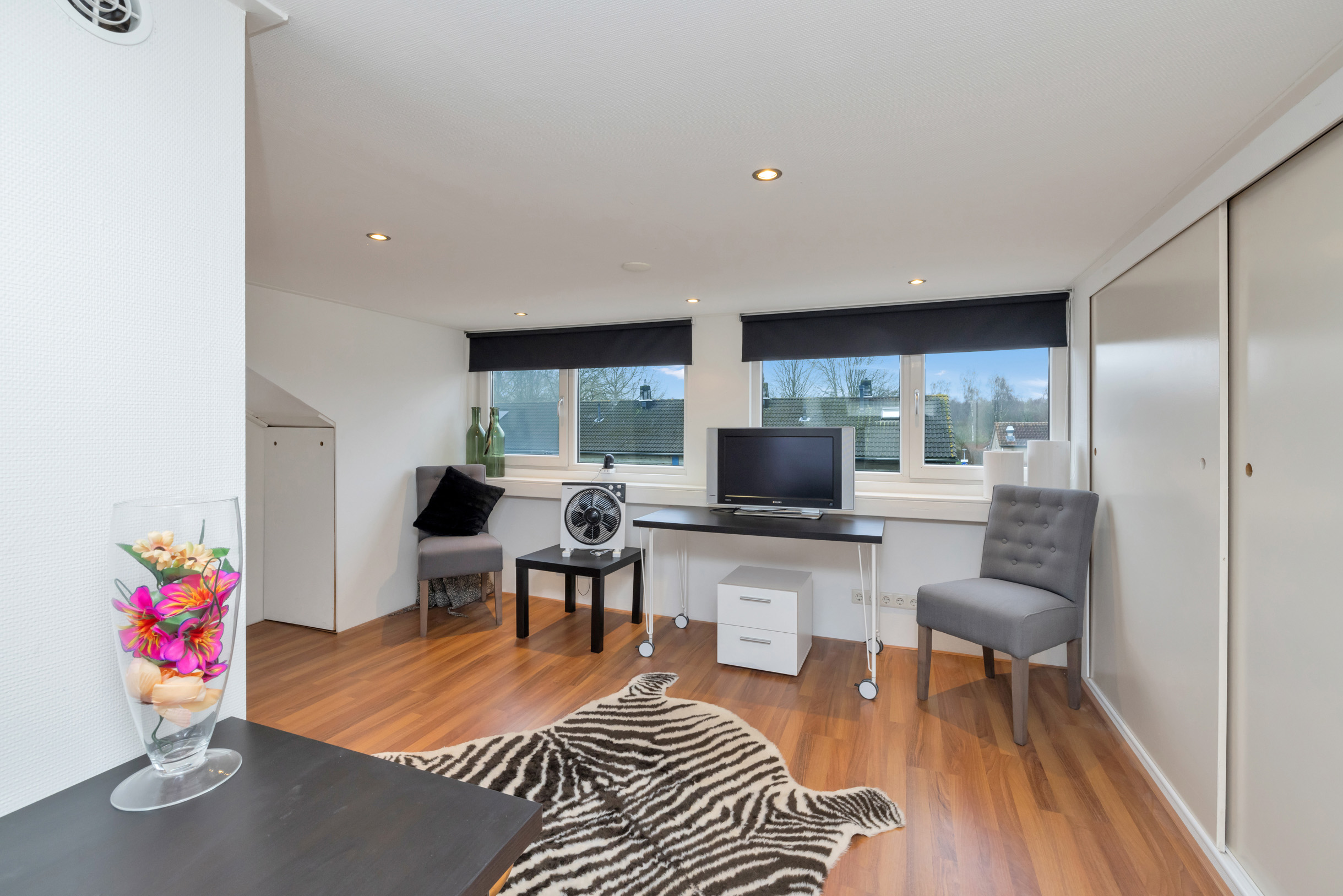 Een groot pluspunt is de zolderverdieping met dakkapel, waar een volwaardige extra slaapkamer is gerealiseerd. Dit maakt de woning verrassend ruim en flexibel in gebruik, bijvoorbeeld als werk-, hobby- of logeerkamer.