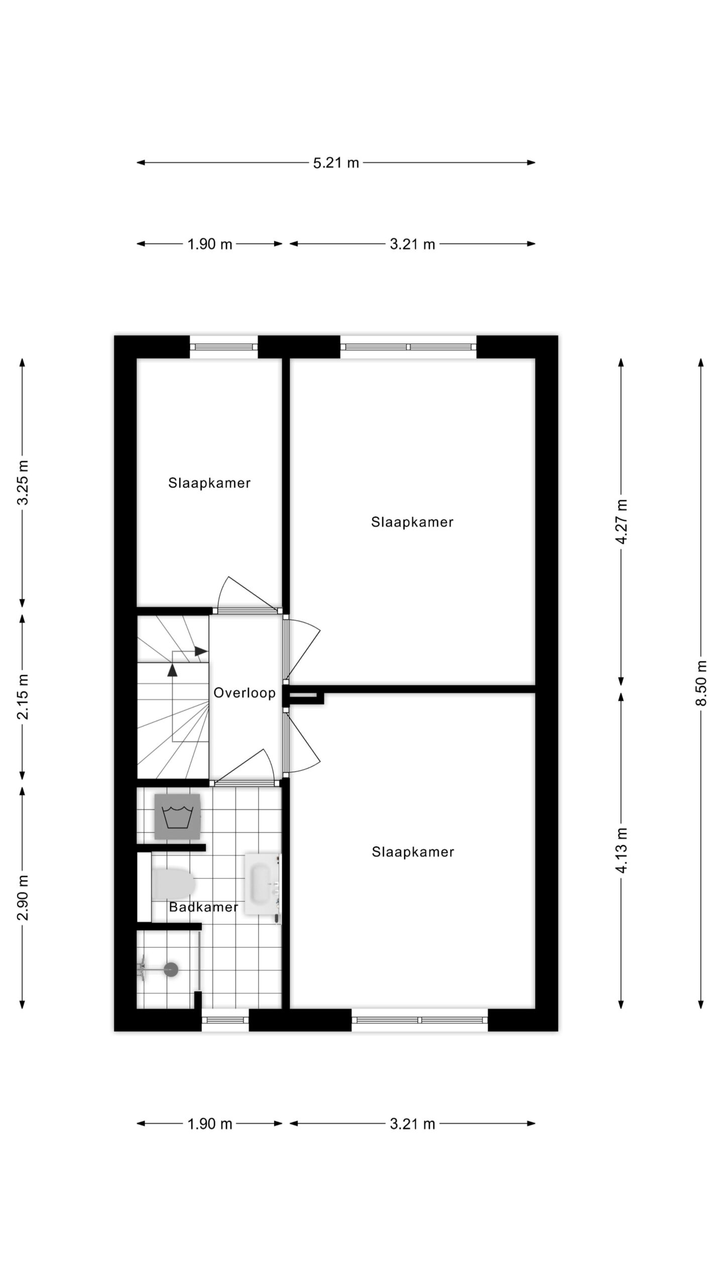 Via de trap kom je uit op de overloop, die toegang geeft tot alle vertrekken op deze verdieping. Hier bevinden zich drie slaapkamers, stuk voor stuk van een goed formaat en voorzien van natuurlijke lichtinval, waardoor ze breed inzetbaar zijn als slaap-, werk- of hobbykamer.