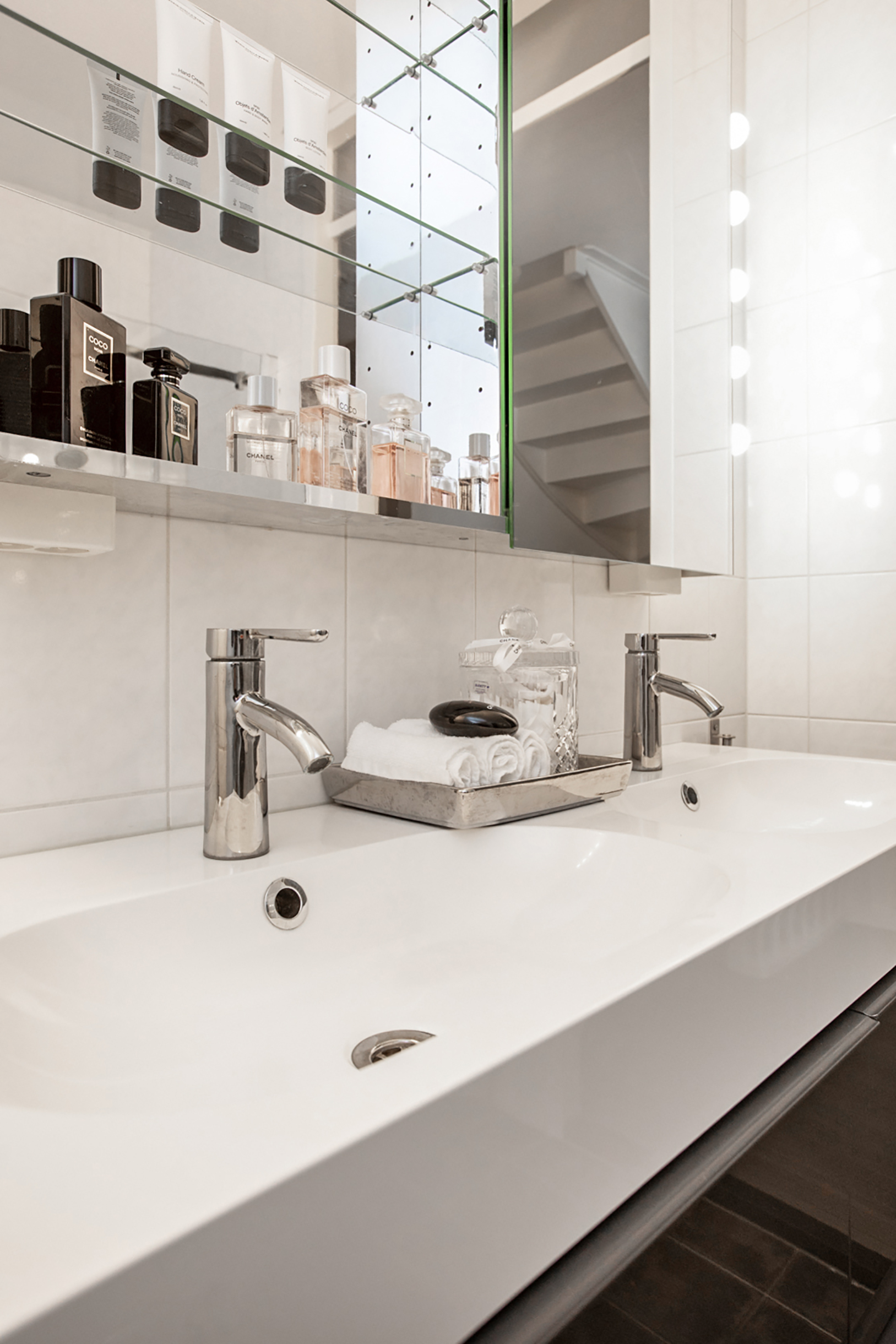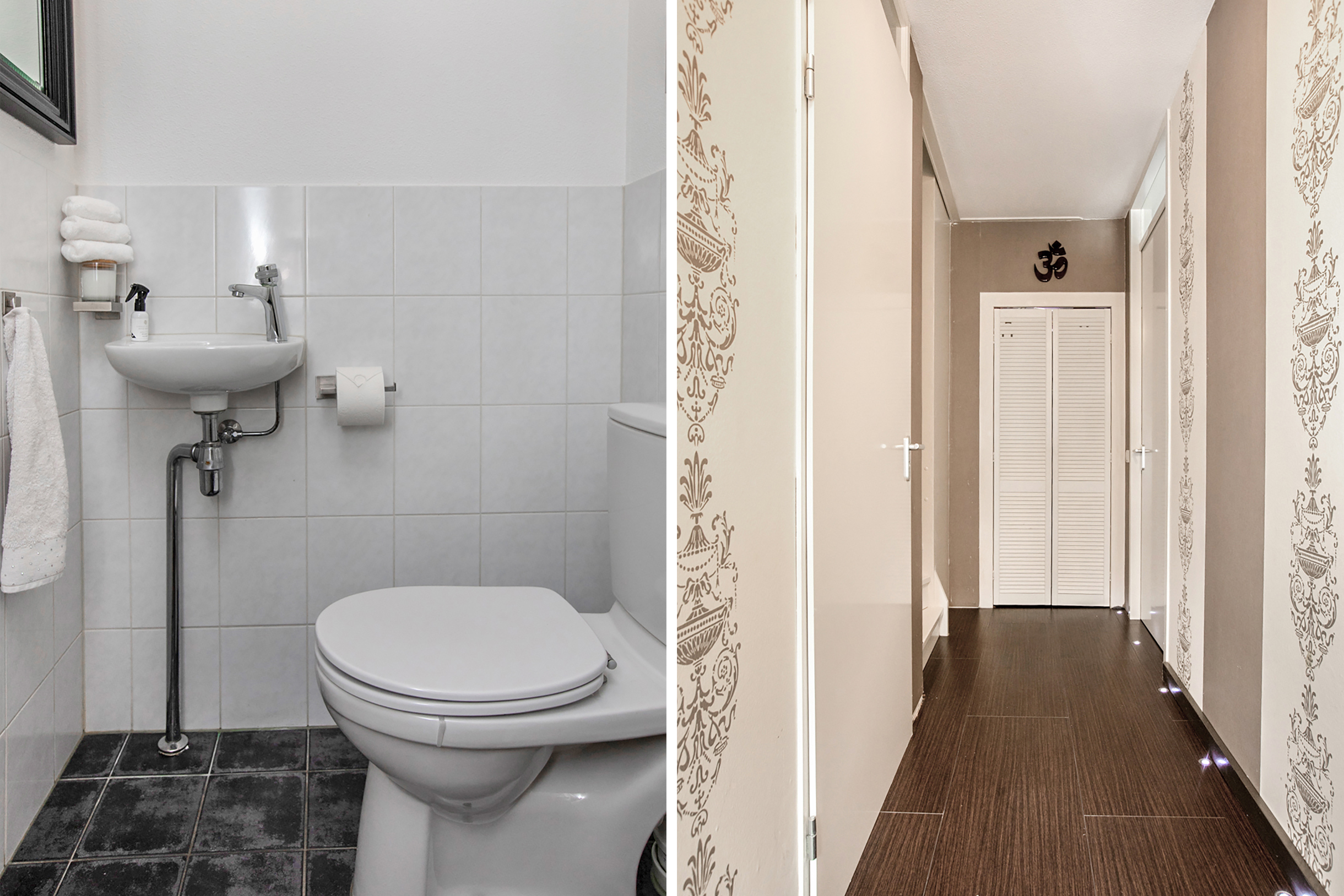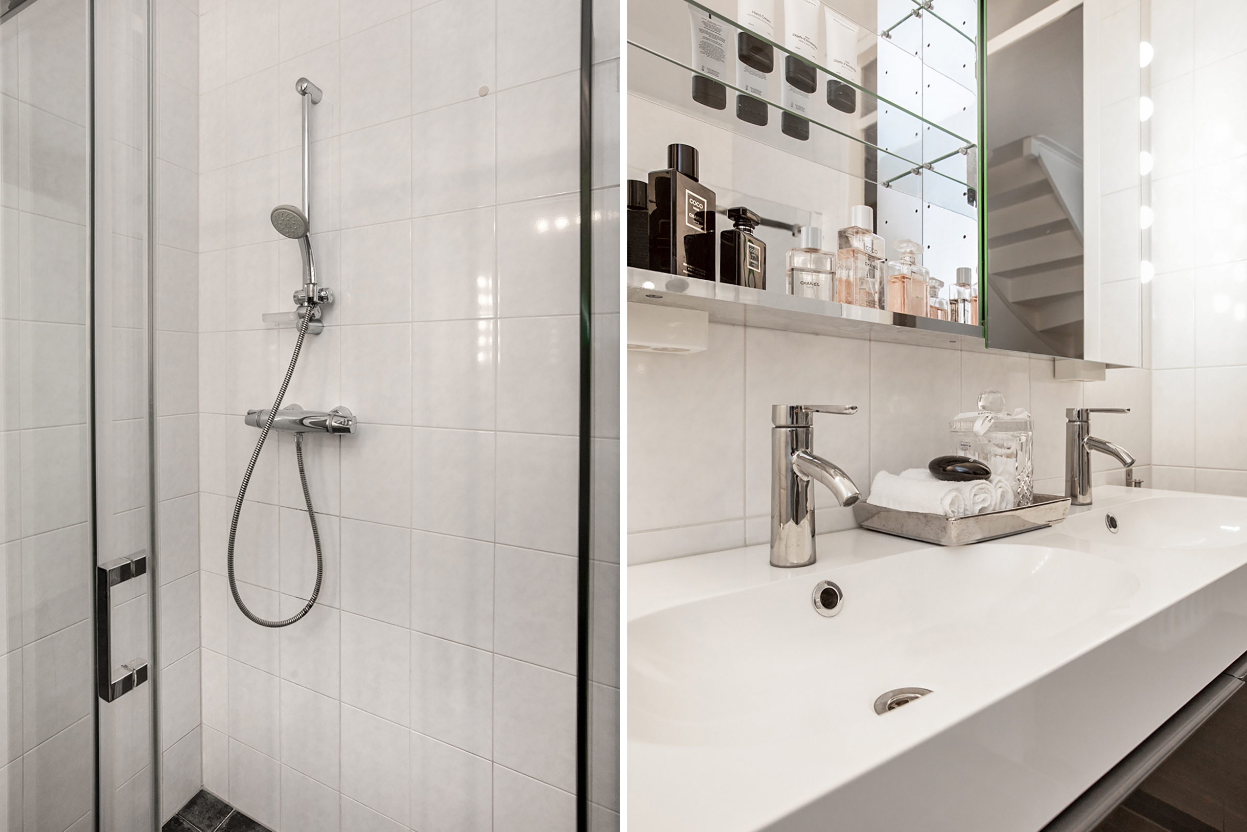 De badkamer is voorzien van dubbele wastafel, aparte douche en ligbad. Naast de badkamerbevindt zich de toiletruimte met toilet en fonteintje.