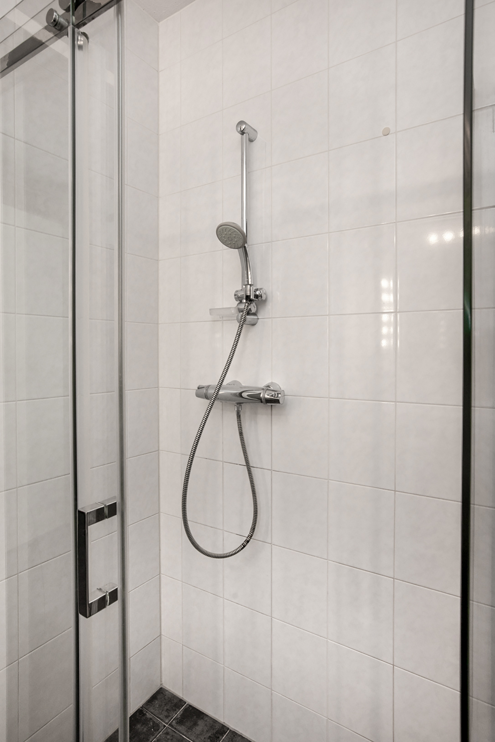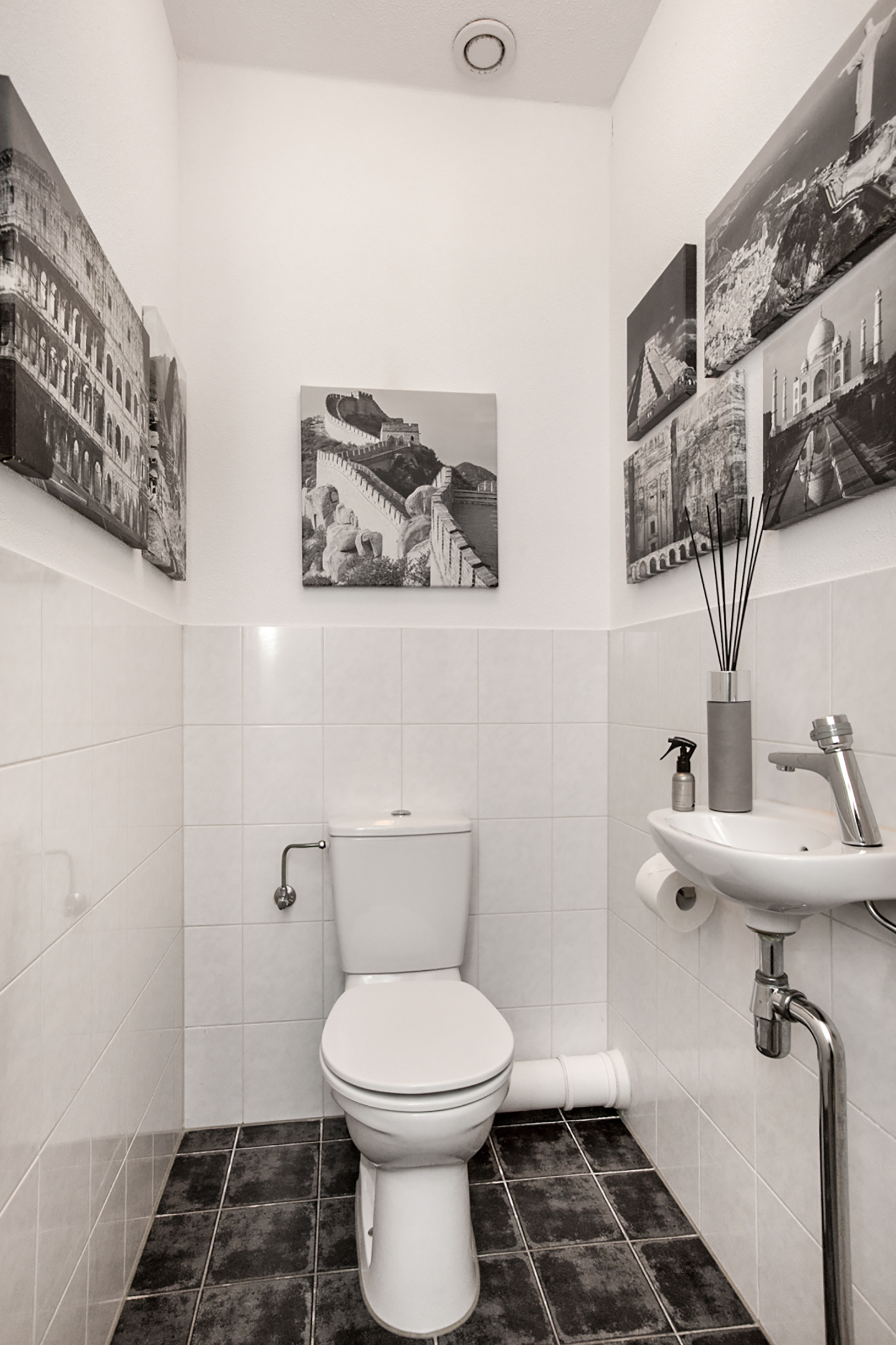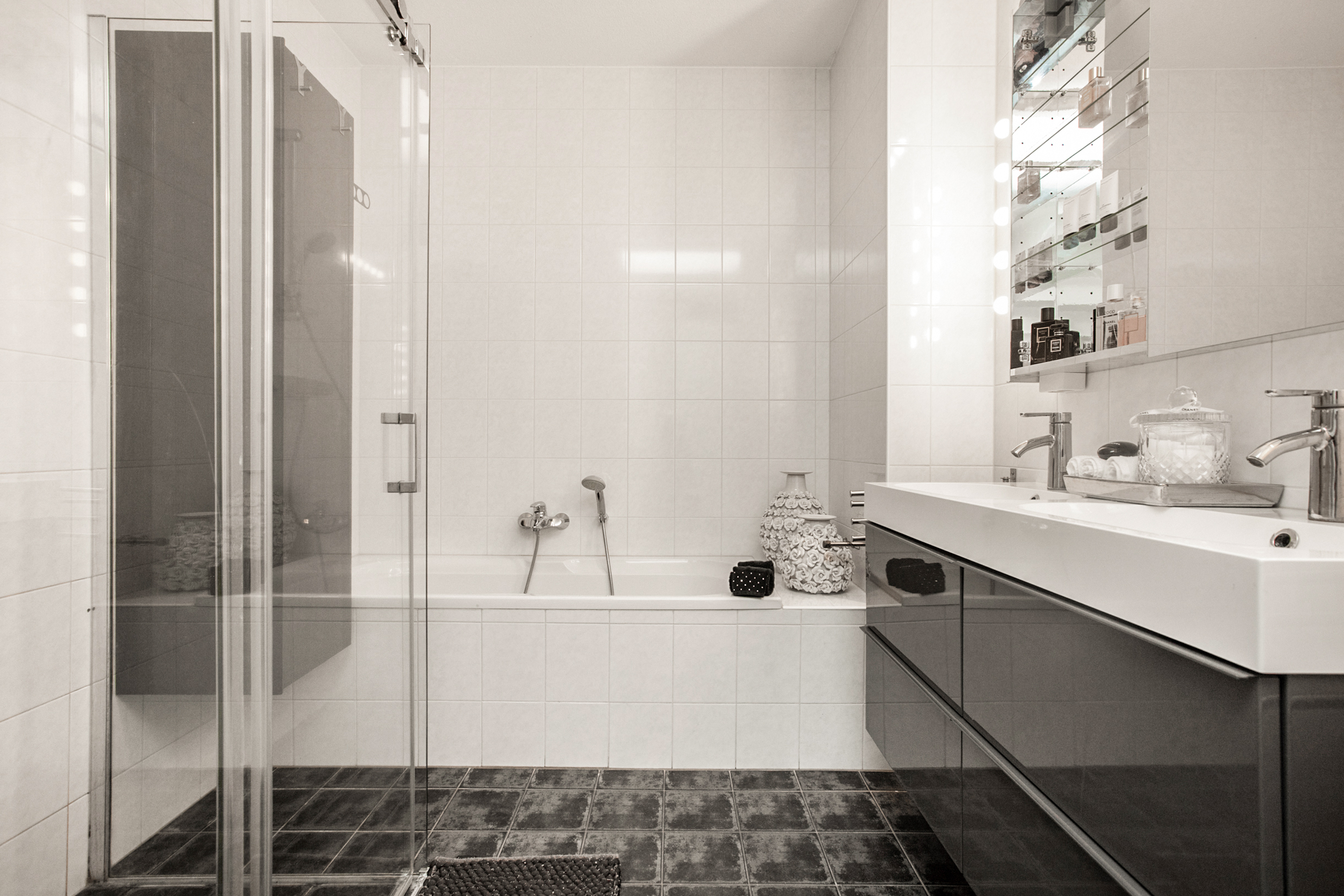 De badkamer is voorzien van dubbele wastafel, aparte douche en ligbad. Naast de badkamerbevindt zich de toiletruimte met toilet en fonteintje.