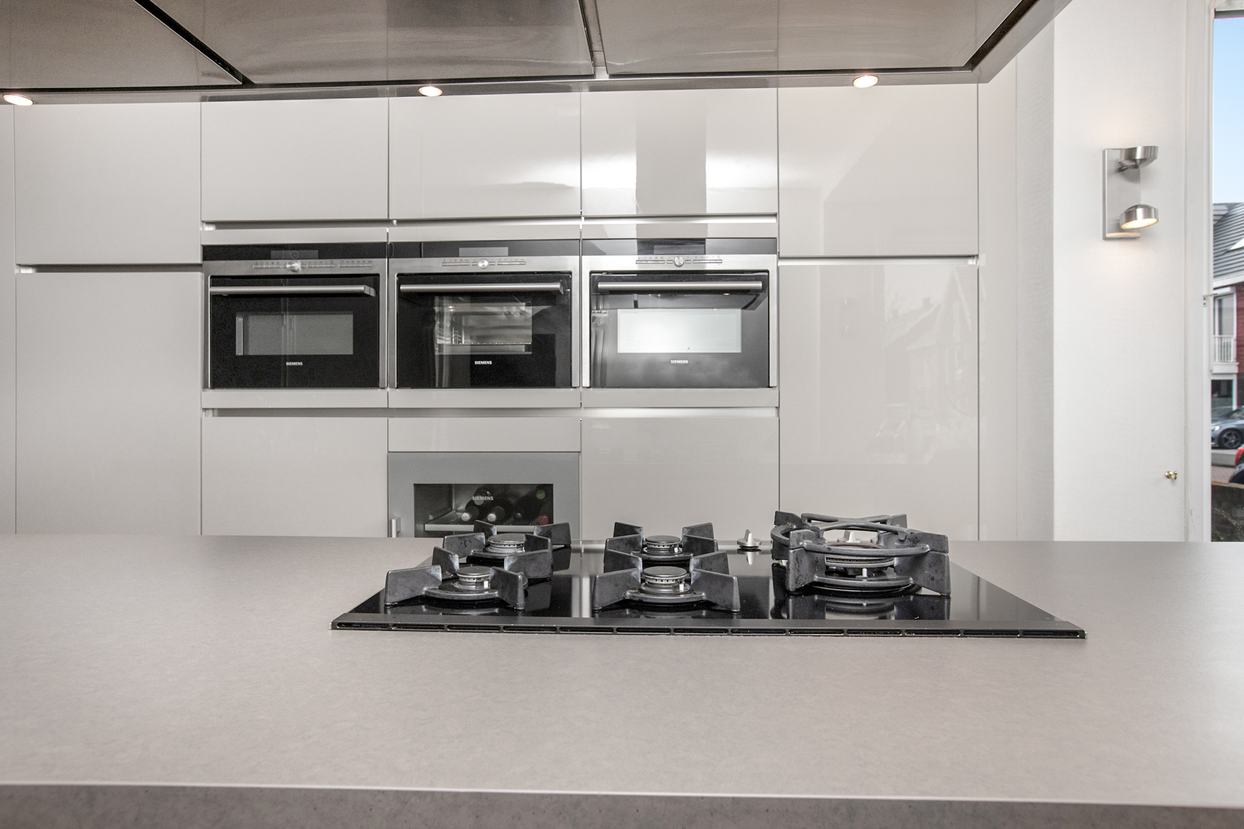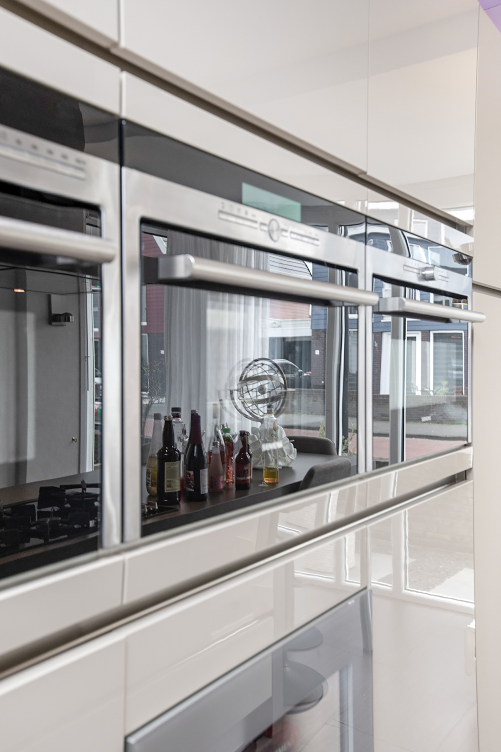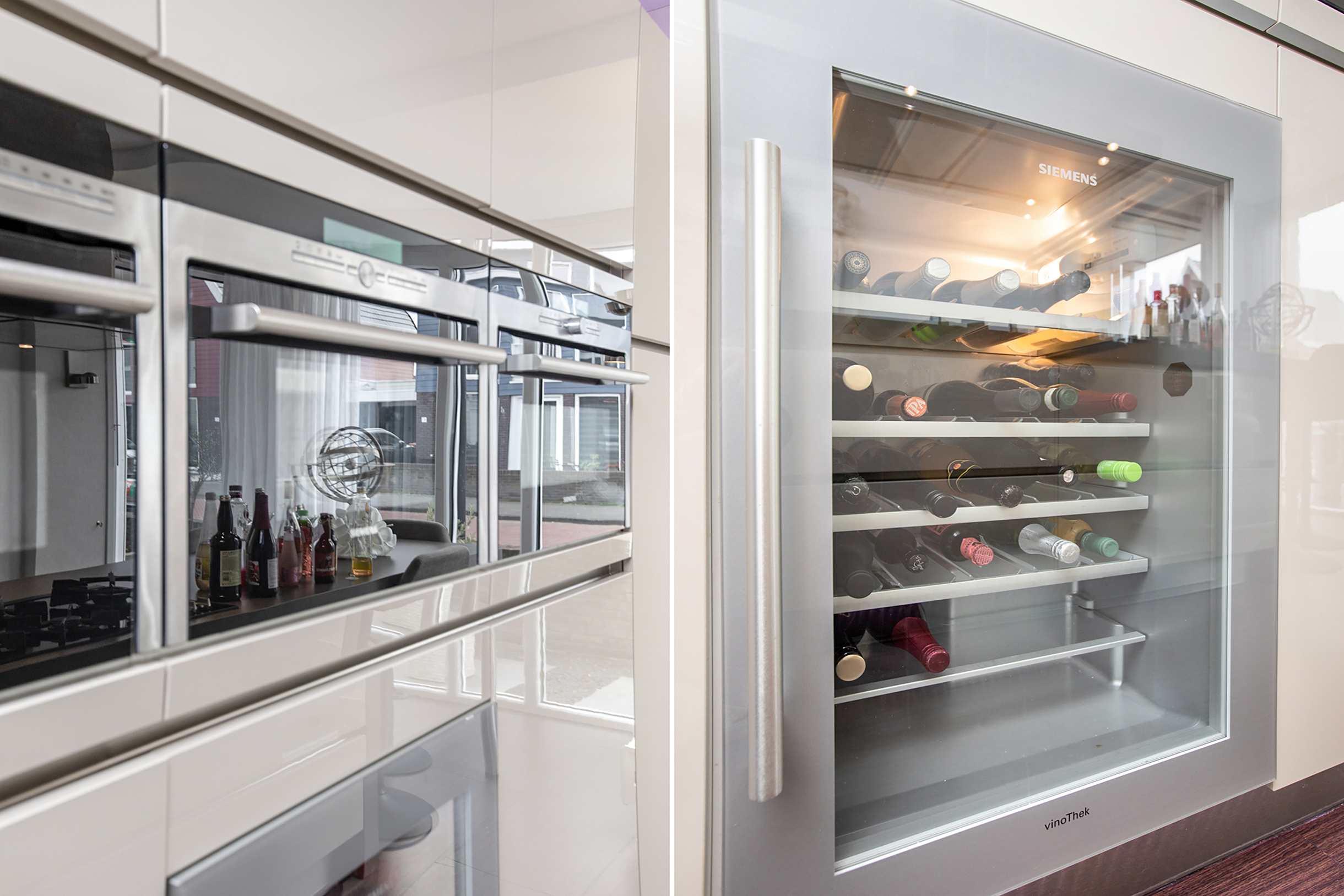 Over wijn gesproken… De grote open keuken met kook- en spoeleiland (van meer dan 4 meter!) is zelfs voorzien van een grote, ingebouwde wijnkoeler. Daarnaast is het kook- en spoeleiland voorzien van een quooker en ingebouwde vaatwasser. Tegenover het eiland zie je een kastenwand van 3 meter, met inbouwkoelkast, inbouwvriezer met 5 lades en 3 inbouwovens (een combi magnetron, stoomoven en heteluchtoven). Een echte kookliefhebber kan hier in zijn of haar handen klappen, want behalve alle nodige apparatuur is er ook volop kastruimte. Tevens heeft het kookeiland aan de kop ook een “bargedeelte”, waar je lekker kunt ontbijten, dineren of gasten kunt ontvangen. Kortom, echt een woonkeuken!