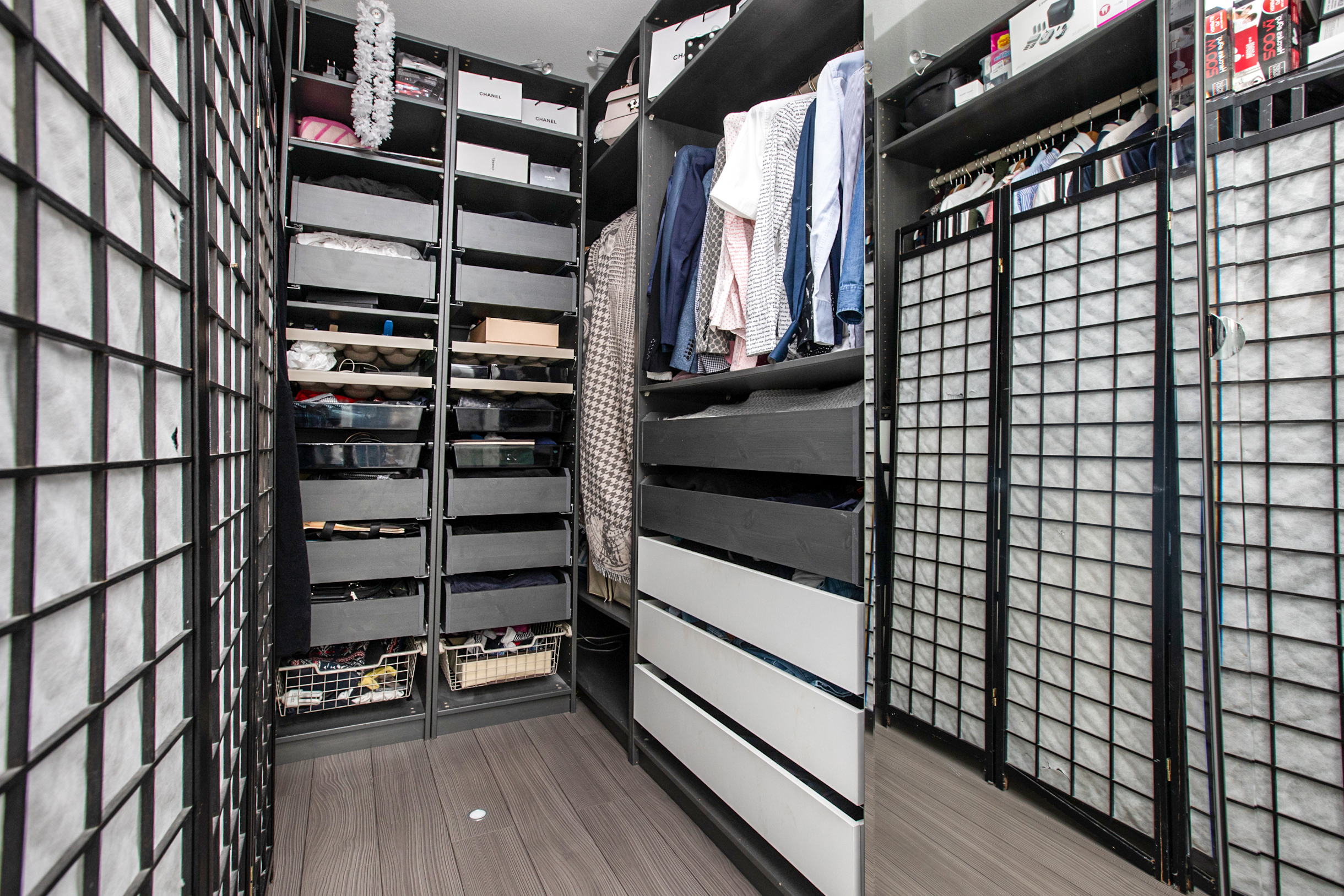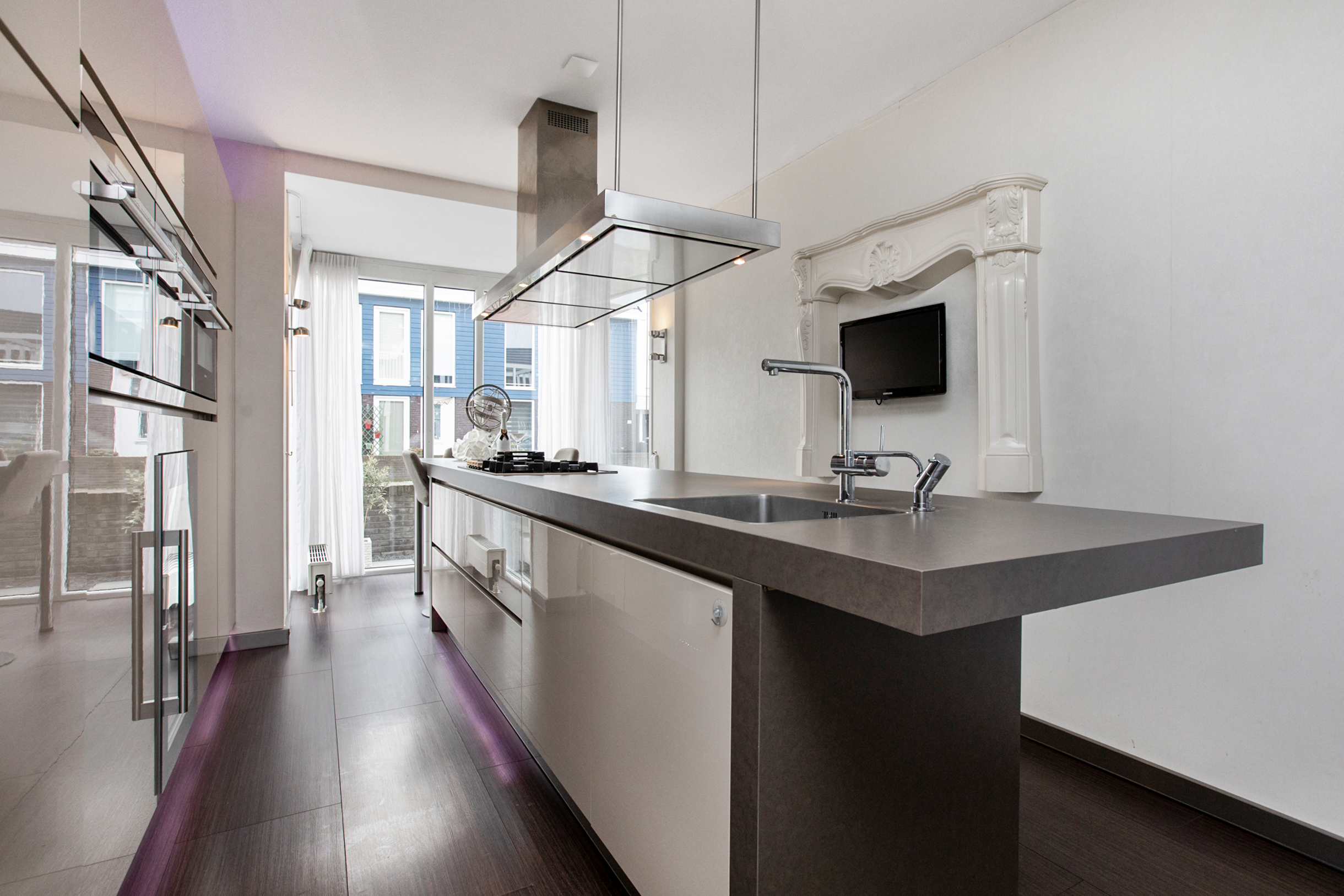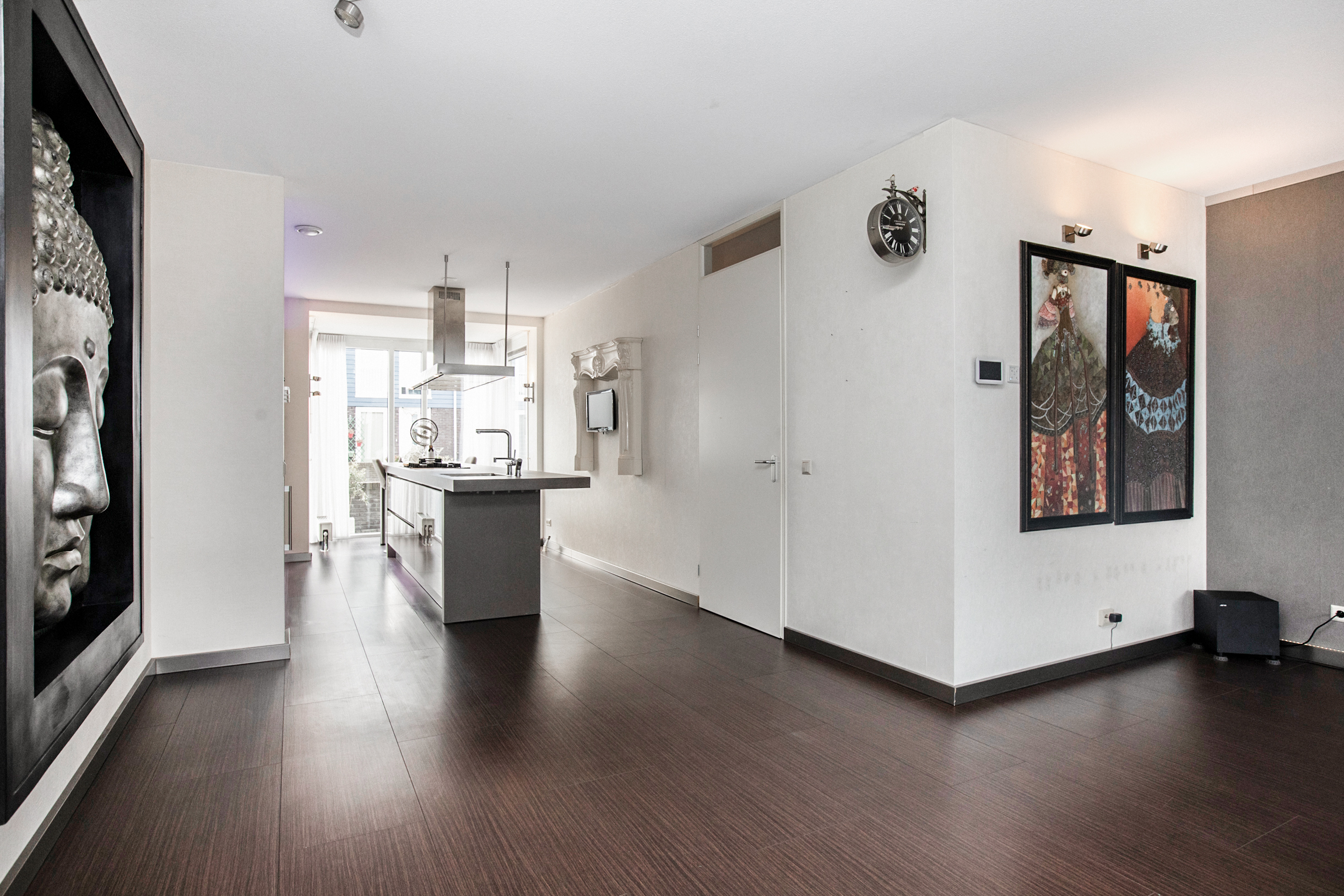 Over wijn gesproken… De grote open keuken met kook- en spoeleiland (van meer dan 4 meter!) is zelfs voorzien van een grote, ingebouwde wijnkoeler. Daarnaast is het kook- en spoeleiland voorzien van een quooker en ingebouwde vaatwasser. Tegenover het eiland zie je een kastenwand van 3 meter, met inbouwkoelkast, inbouwvriezer met 5 lades en 3 inbouwovens (een combi magnetron, stoomoven en heteluchtoven). Een echte kookliefhebber kan hier in zijn of haar handen klappen, want behalve alle nodige apparatuur is er ook volop kastruimte. Tevens heeft het kookeiland aan de kop ook een “bargedeelte”, waar je lekker kunt ontbijten, dineren of gasten kunt ontvangen. Kortom, echt een woonkeuken!