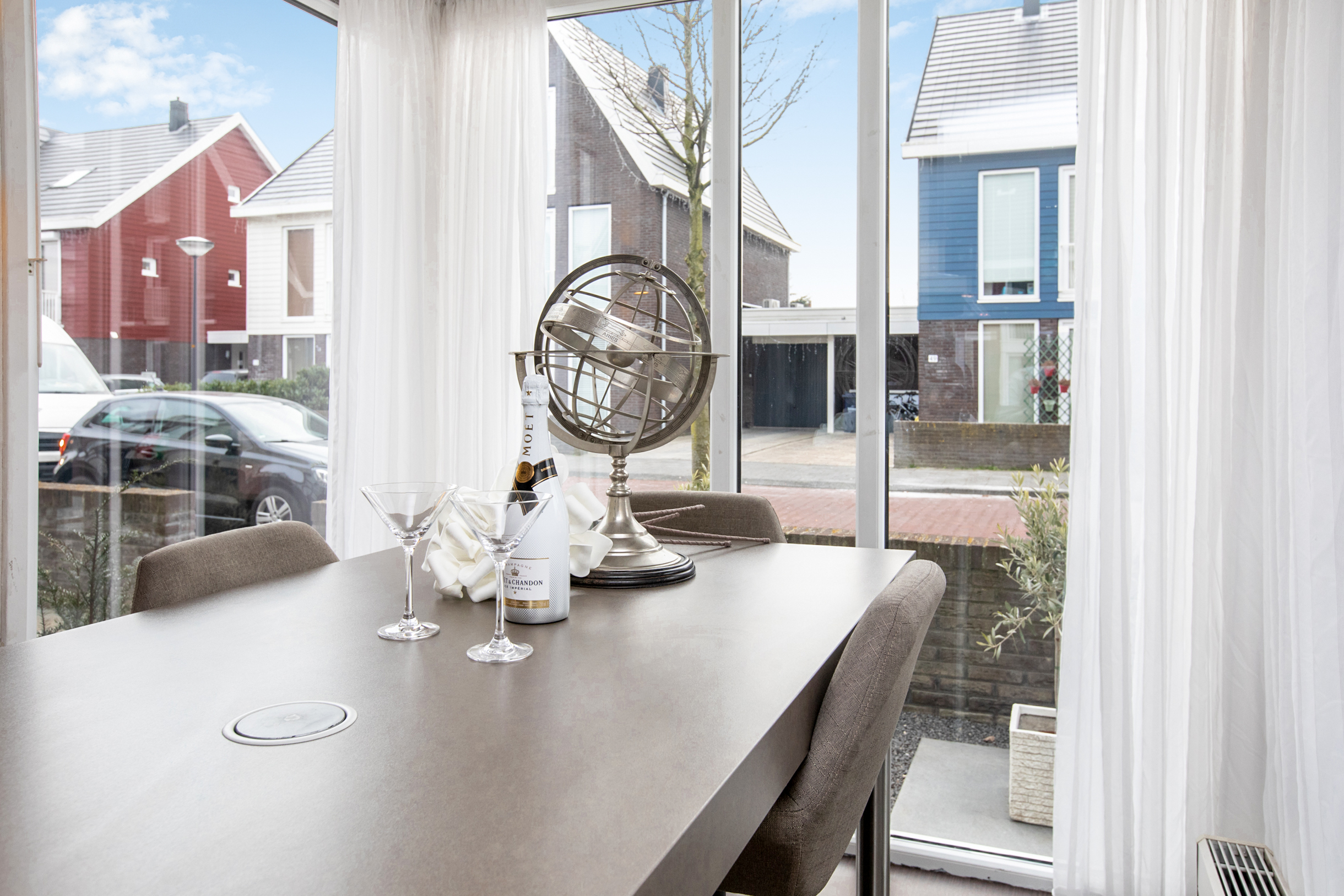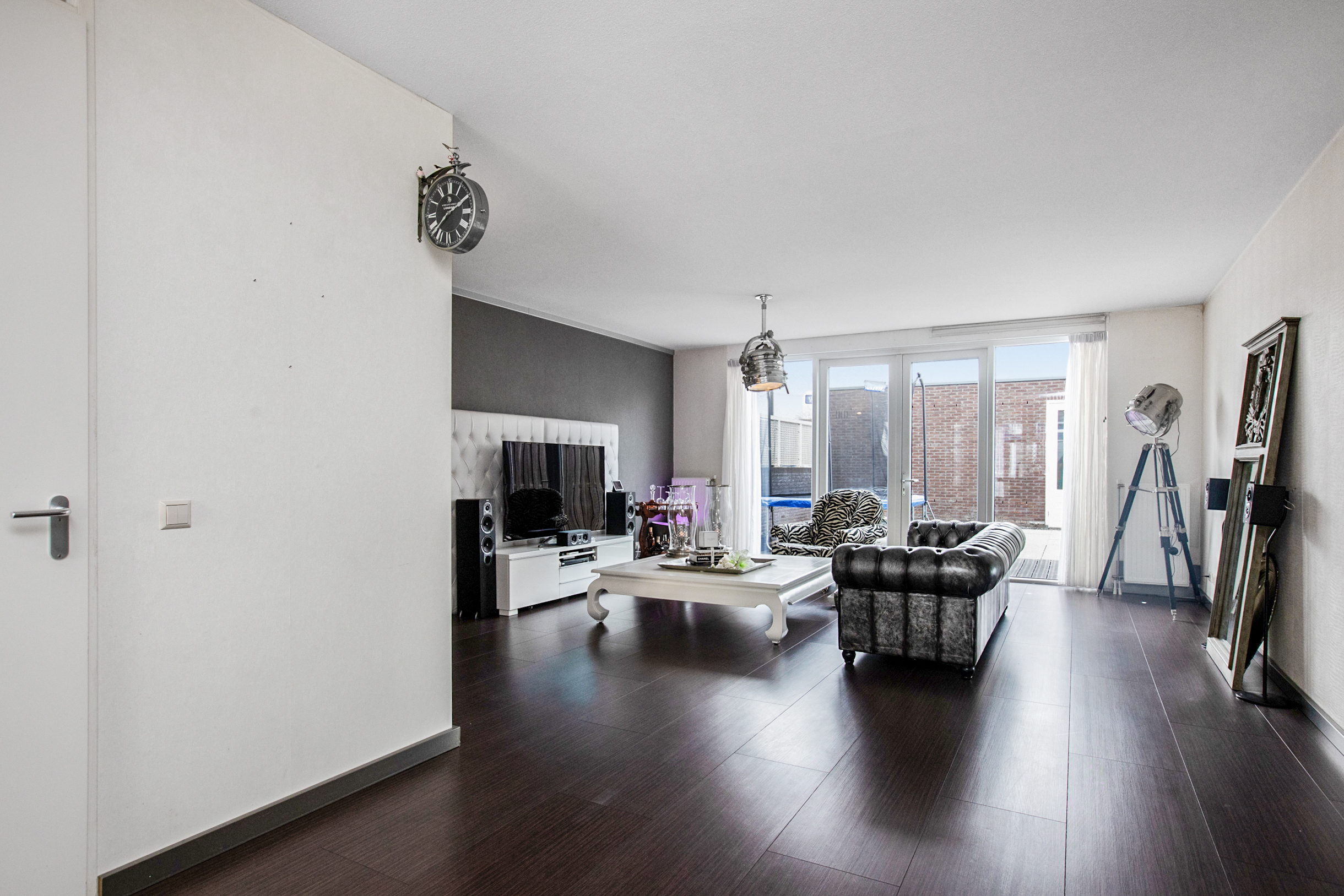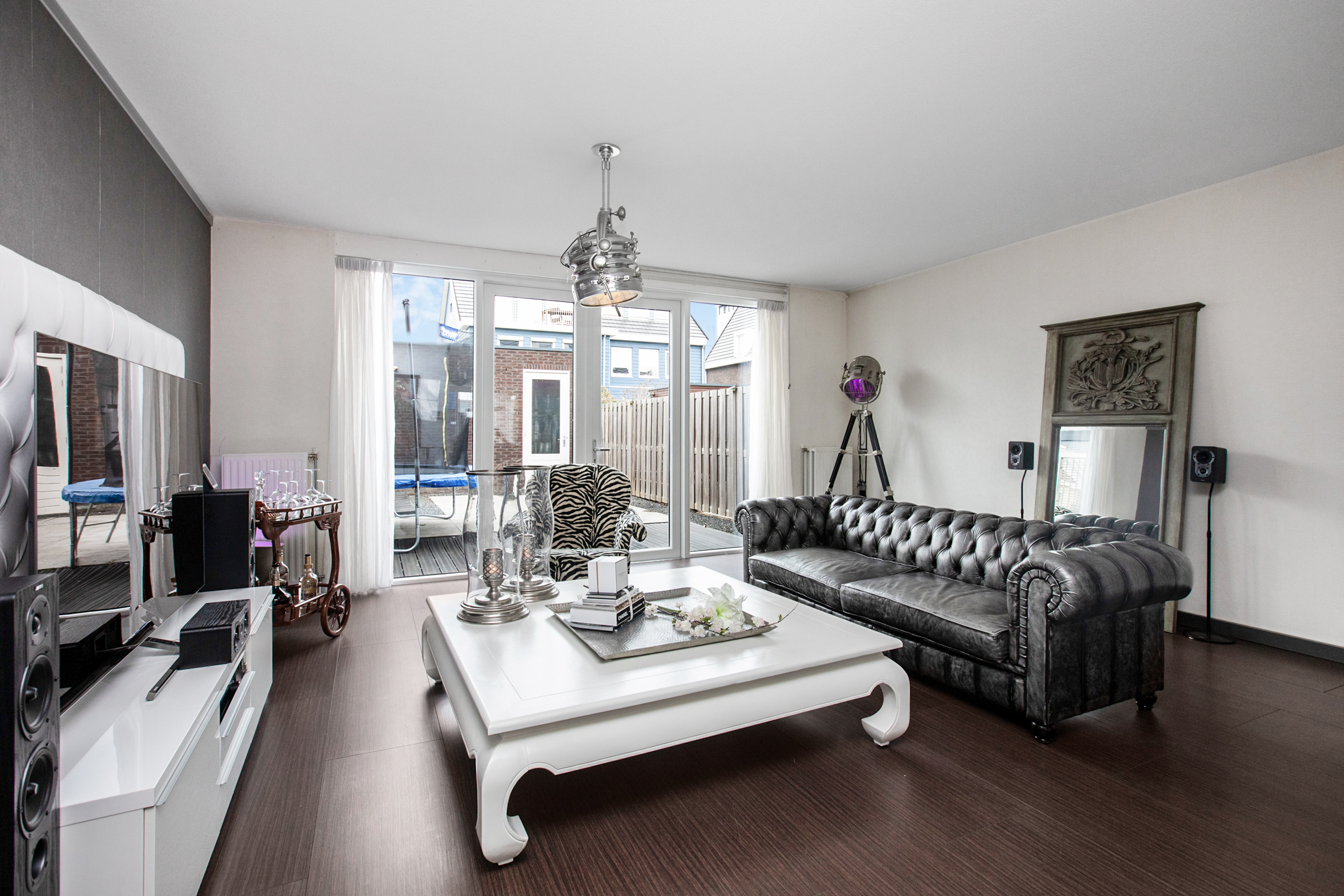 Vanuit de L-vormige entree, met ledspotjes in de vloer, bereik je de meterkast, het toilet, de trap, met daaronder een ruime trapkast, en de keuken. Via het hart van de woning, oftewel de keuken, kom je in de woonkamer terecht. Ook hier zien we de ledspotjes in de vloer terug. De woonkamer heeft een uitbouw van 1,2 meter en geeft daarom een enorme hoeveelheid ruimte om een grote en gezellige zithoek te creëren. In de zomer maak je vast extra veel gebruik van de openslaande deuren. Een wijntje in je hand, een goed boek op schoot en af en toe een zacht briesje dat voor de nodige verkoeling zorgt. Een vakantie is bijna niet meer nodig!