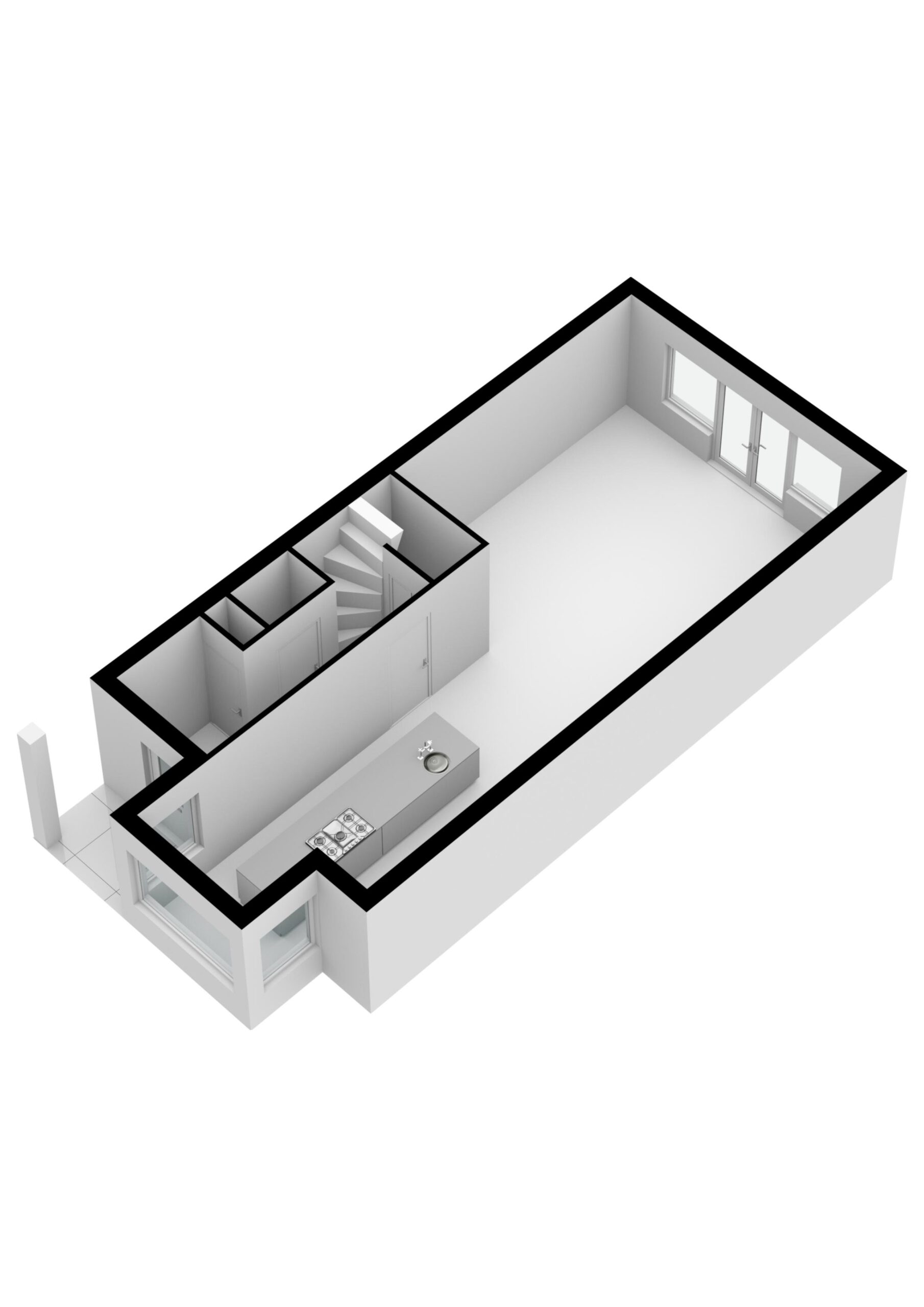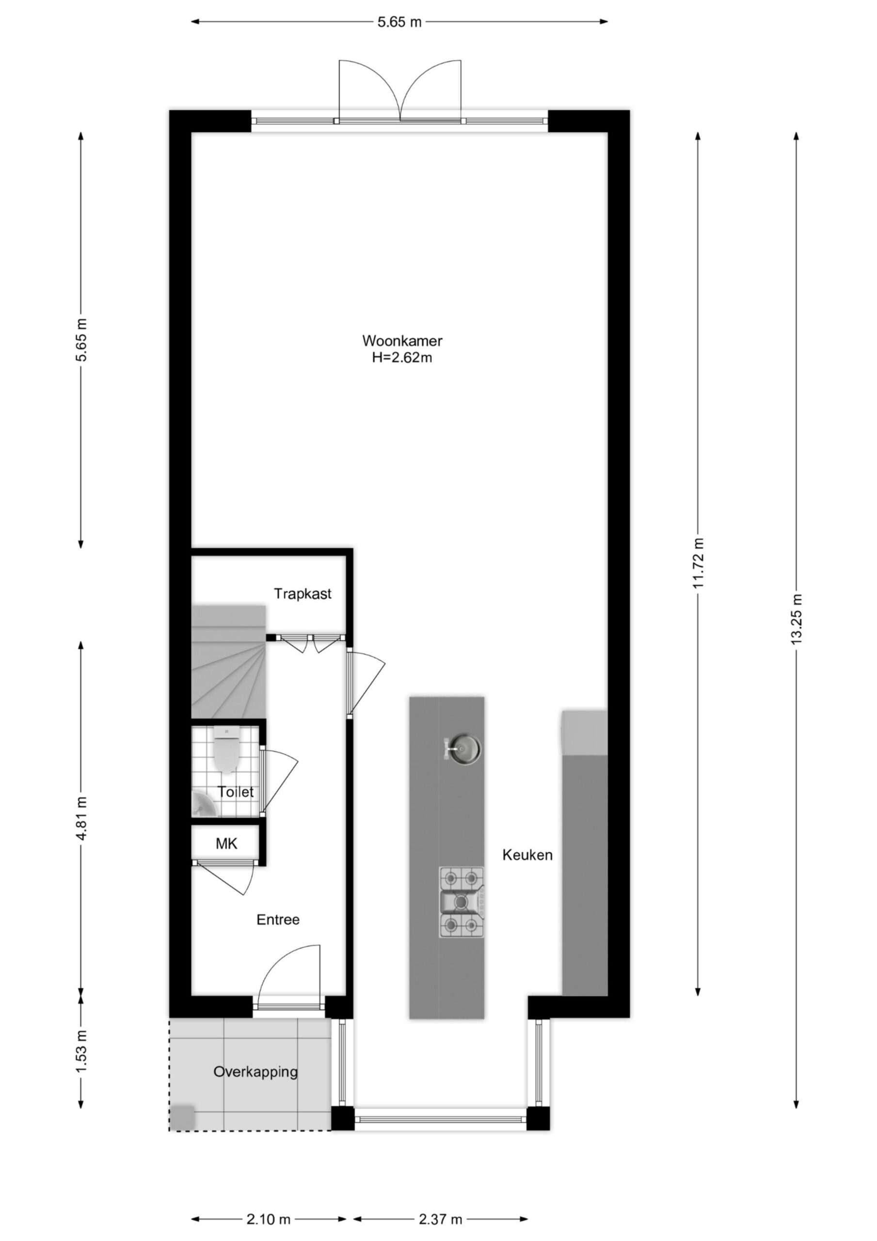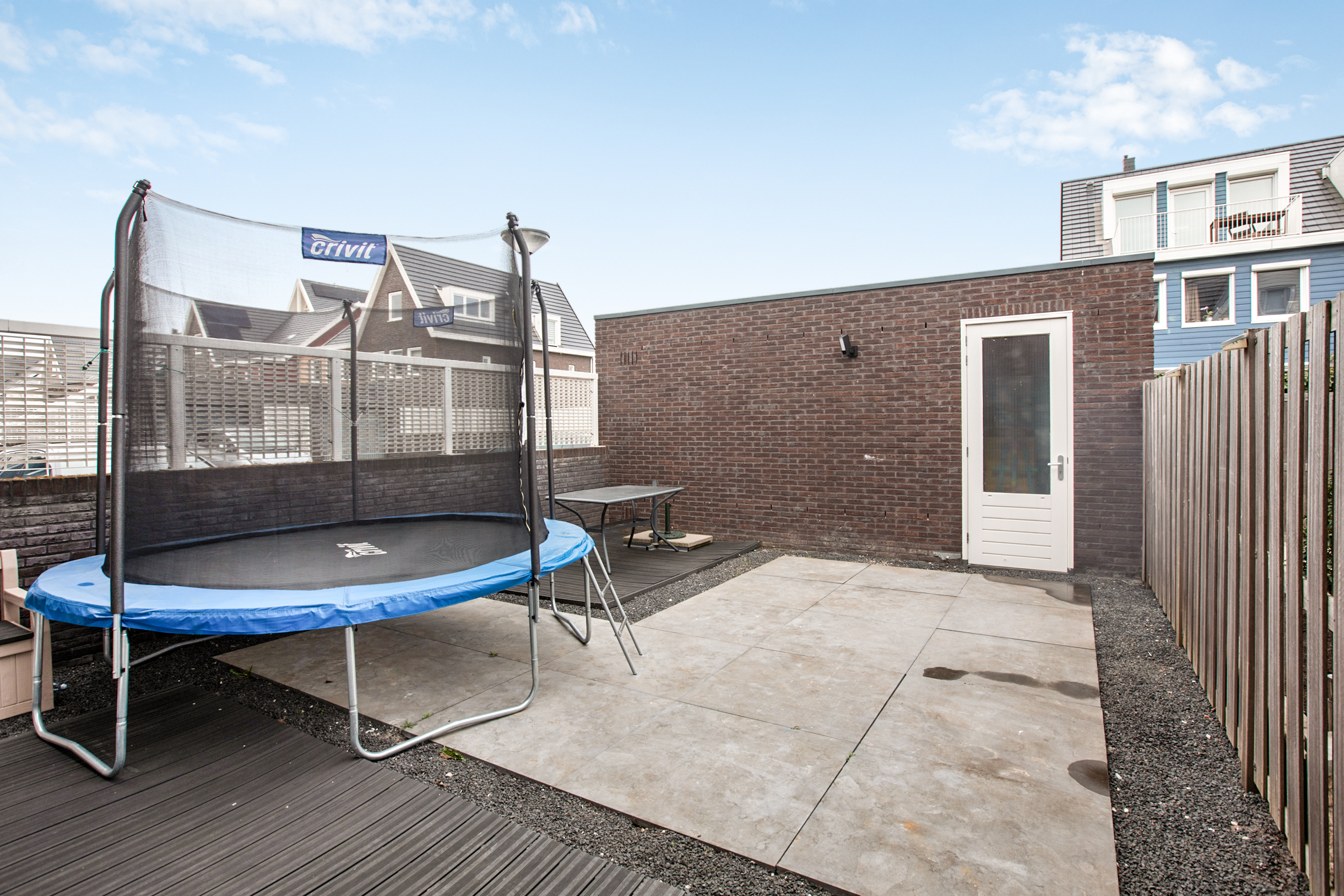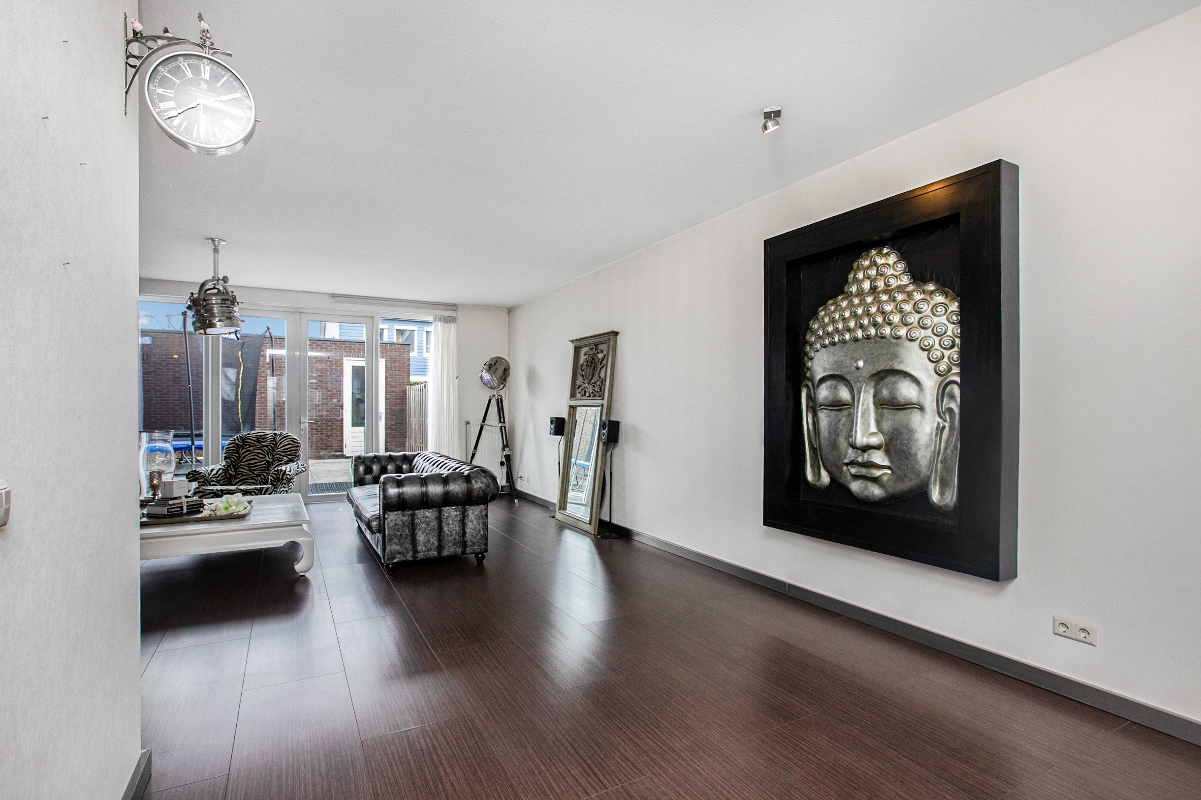 Vanuit de L-vormige entree, met ledspotjes in de vloer, bereik je de meterkast, het toilet, de trap, met daaronder een ruime trapkast, en de keuken. Via het hart van de woning, oftewel de keuken, kom je in de woonkamer terecht. Ook hier zien we de ledspotjes in de vloer terug. De woonkamer heeft een uitbouw van 1,2 meter en geeft daarom een enorme hoeveelheid ruimte om een grote en gezellige zithoek te creëren. In de zomer maak je vast extra veel gebruik van de openslaande deuren. Een wijntje in je hand, een goed boek op schoot en af en toe een zacht briesje dat voor de nodige verkoeling zorgt. Een vakantie is bijna niet meer nodig!