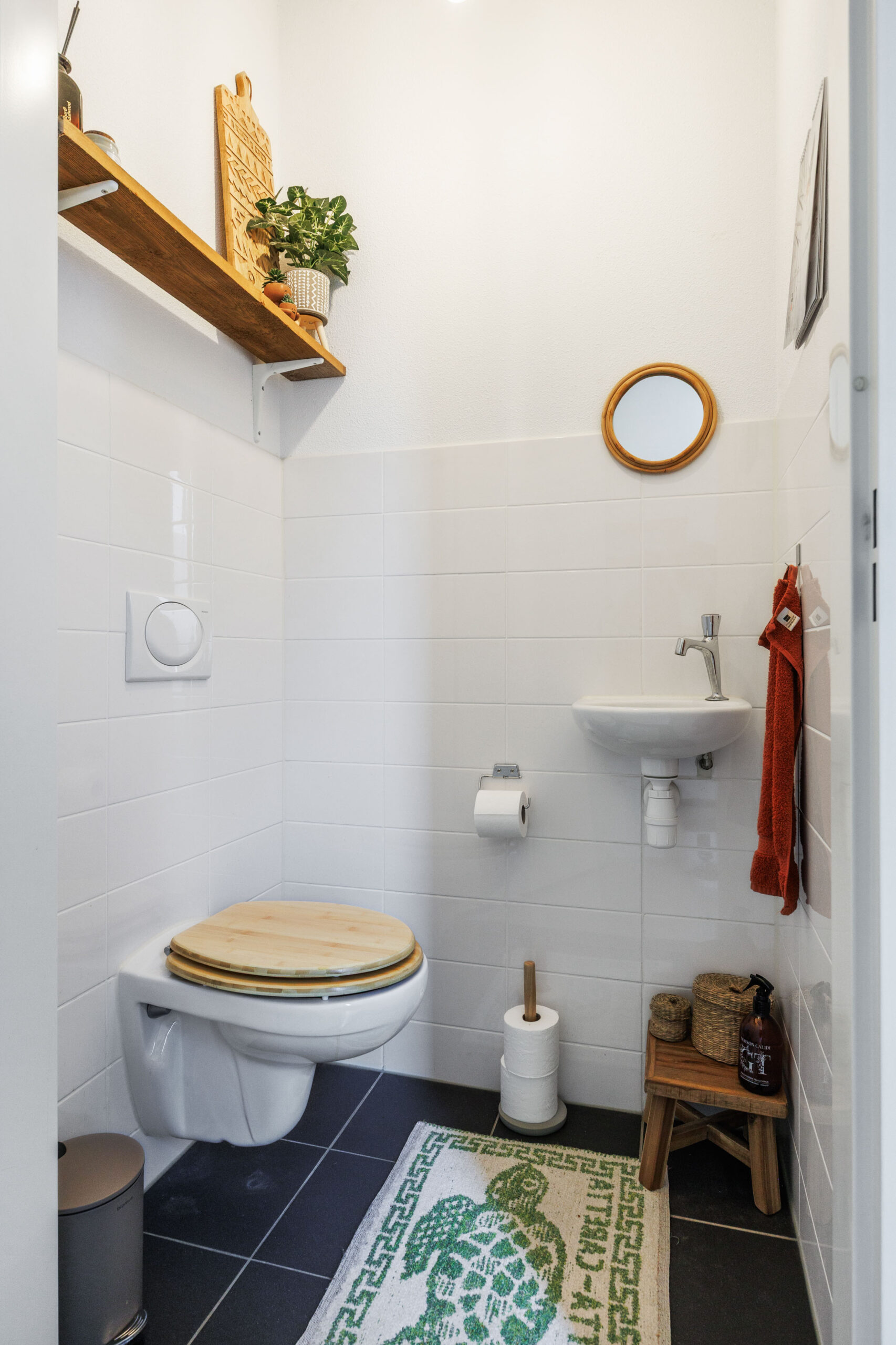 Via de voordeur betreed je de ruime entreehal (10,4 m²) met meterkast, toiletruimte en toegang tot de trapopgang en woonkamer. Het toilet is voorzien van een fontein en netjes betegeld.